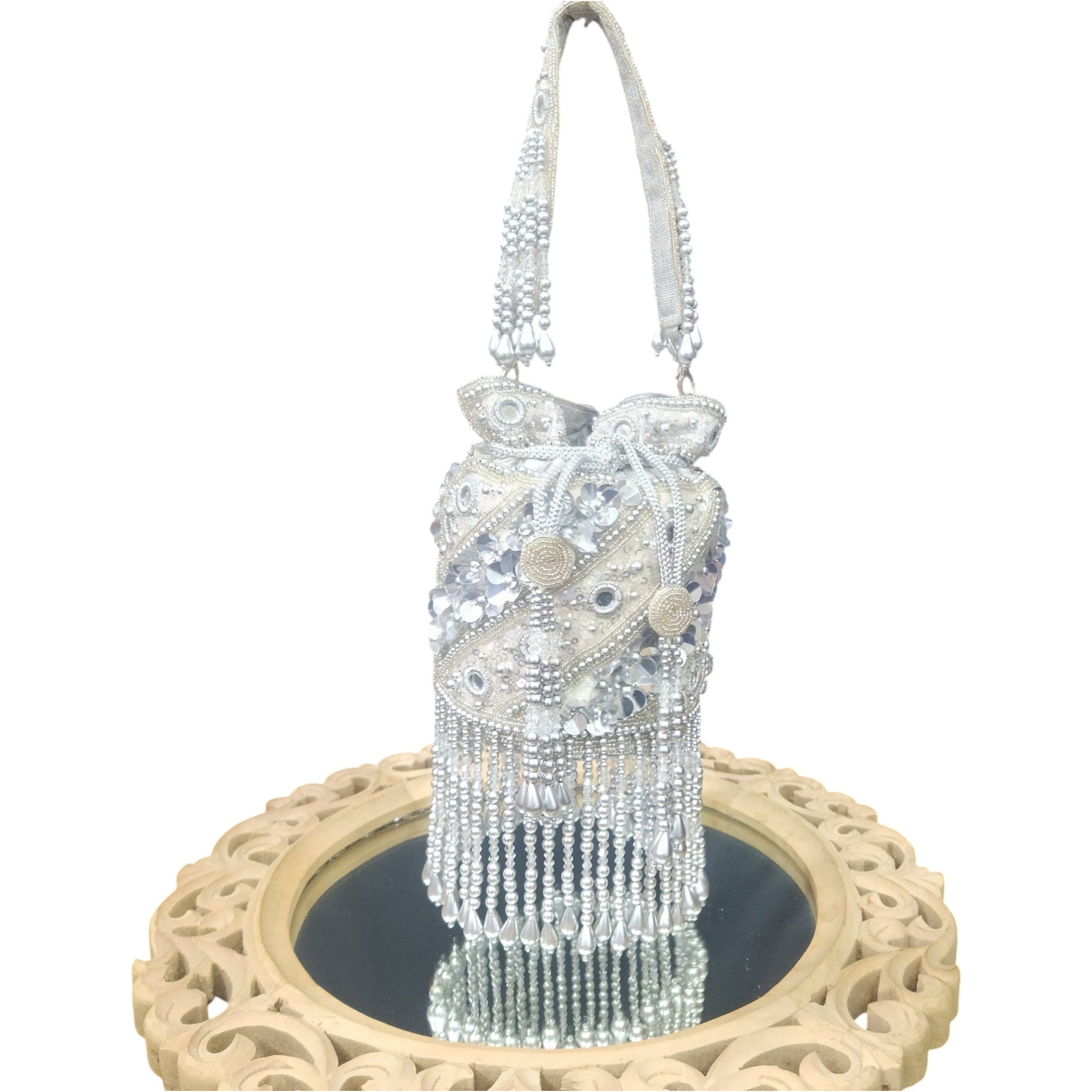 "Elevate your festive and bridal ensemble with this exquisite Aaina Mirror potli bag, adorned with intricate pearl, sequin, and mirror handwork. Its timeless elegance is further enhanced by delicate pearl tassels at the base and charming tassels on the drawstrings. A perfect blend of tradition and sophistication, this potli is designed to complement any ethnic attire, making it an ideal accessory for weddings, parties, and celebrations."