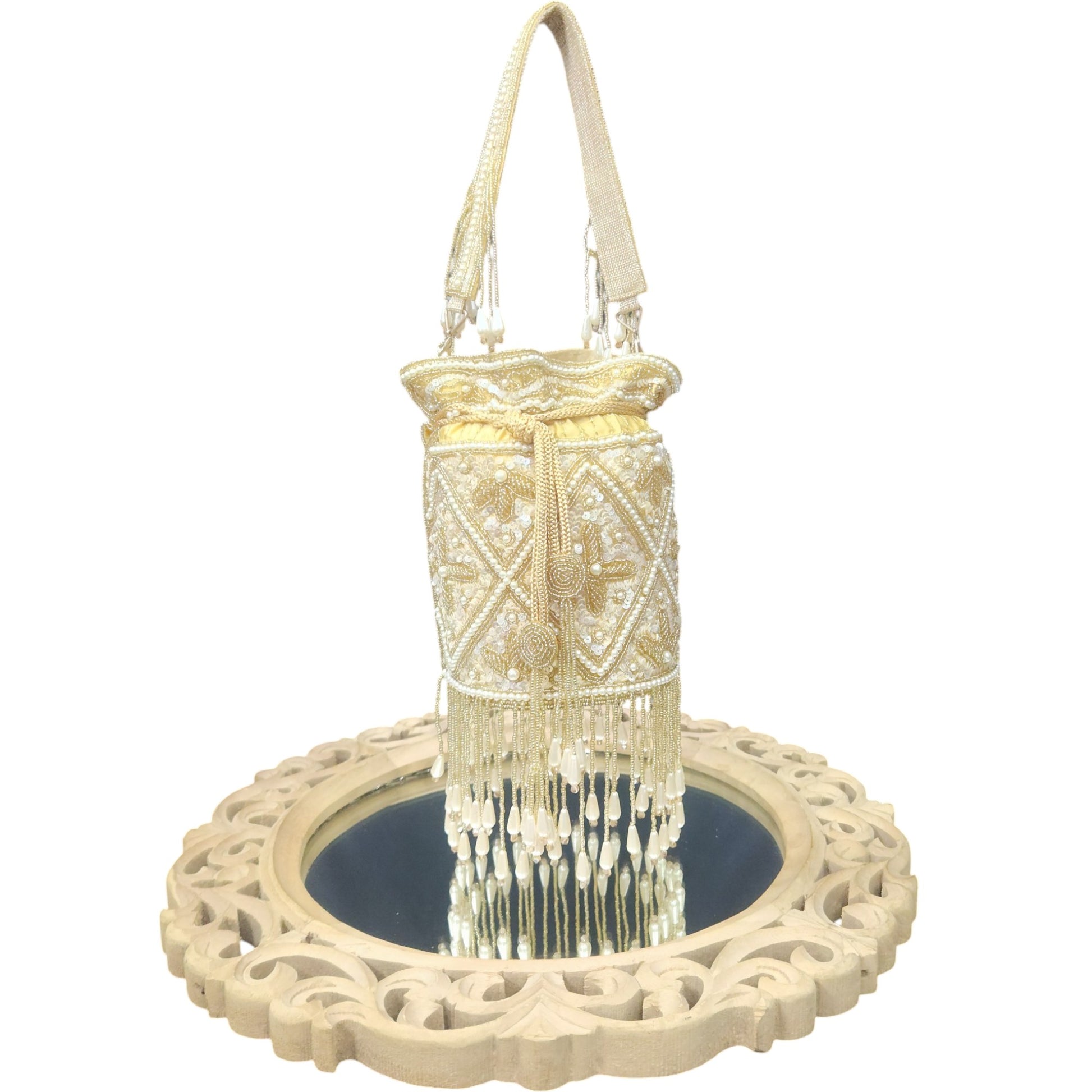 The Afreen Sequin Pearl Potli is a beautiful blend of intricate craftsmanship and elegant design. The bag is adorned with exquisite sequins handwork, creating several small, dispersed flower formations with drop-shaped pearls. The seed beads tassel hangings, each ending with a drop-shaped pearl, add a whimsical and luxurious touch. The handle, embellished with sequin and delicate pearl handwork and matching tassels on both ends, enhances the bag’s overall charm. Perfect for weddings, parties, and festive occasions, this potli bag is a perfect accessory to elevate your elegant ensemble.