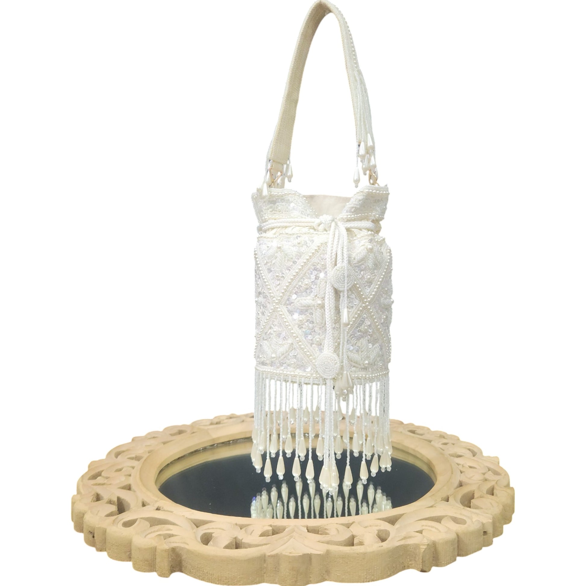 The Afreen Sequin Pearl Potli is a beautiful blend of intricate craftsmanship and elegant design. The bag is adorned with exquisite sequins handwork, creating several small, dispersed flower formations with drop-shaped pearls. The seed beads tassel hangings, each ending with a drop-shaped pearl, add a whimsical and luxurious touch. The handle, embellished with sequin and delicate pearl handwork and matching tassels on both ends, enhances the bag’s overall charm. Perfect for weddings, parties, and festive occasions, this potli bag is a perfect accessory to elevate your elegant ensemble.