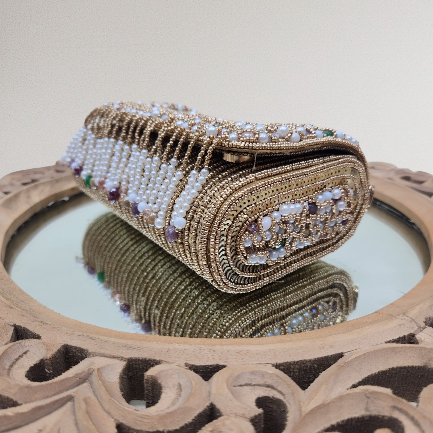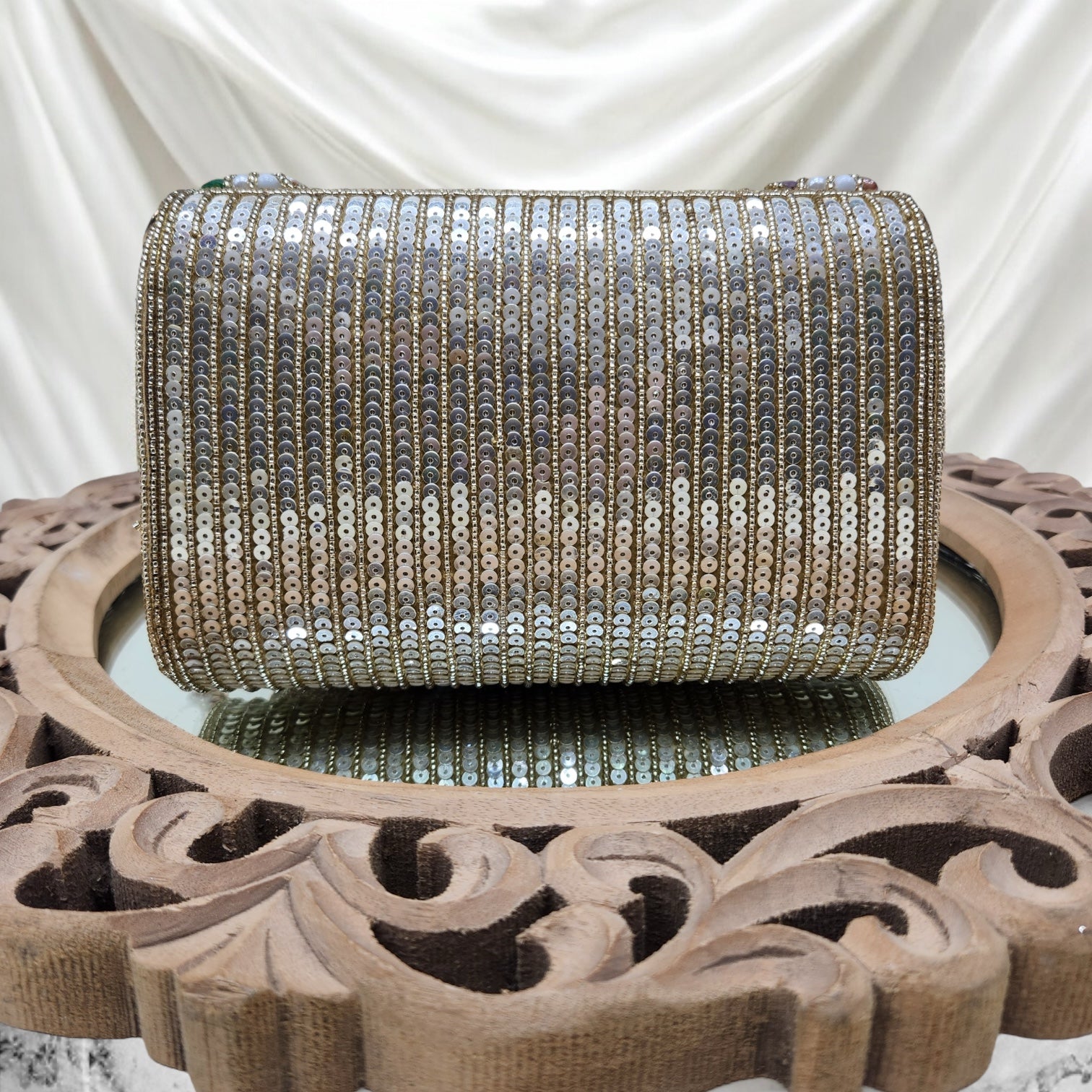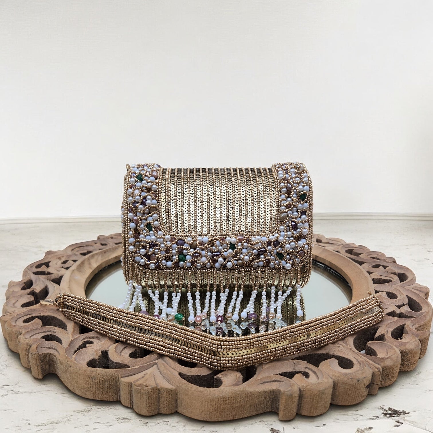 This statement clutch is adorned with exquisite hand embroidery featuring sequins, pearls, seed beads, and colored stones on a Jute base. Its structured flapover design, beaded tassel fringe, and detachable handle make it a perfect accessory for weddings, festive occasions, and ethnic celebrations. Elegant, versatile, and available in multiple color options.