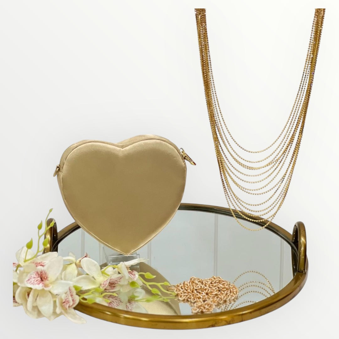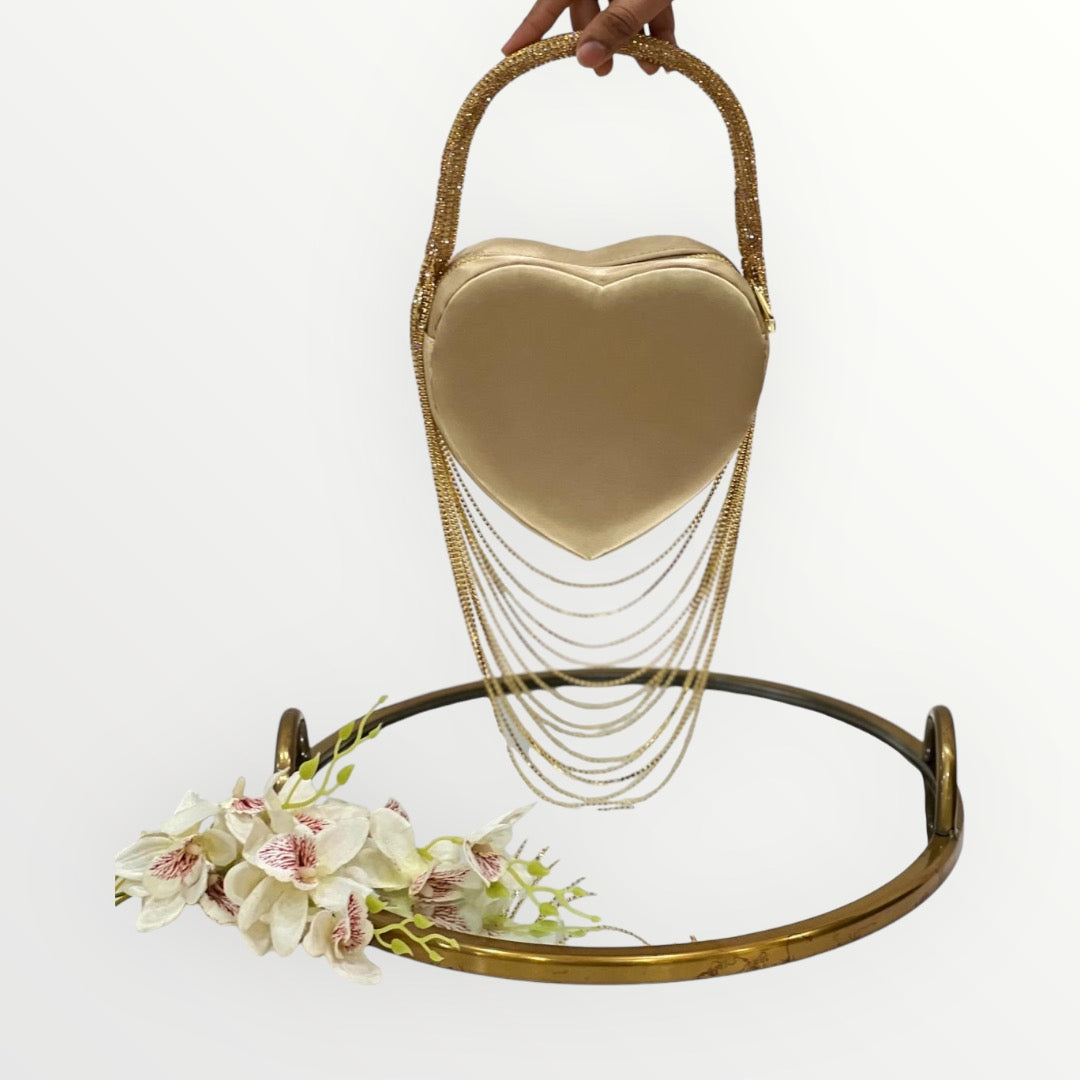 This satin heart bag is the epitome of elegance and charm, designed to make a statement at any party. Featuring a dazzling diamond dangler handle and a sleek sling chain, this bag effortlessly blends luxury and functionality. Its unique heart shape and lustrous satin finish add a touch of romance and sophistication, making it the classiest party accessory. Perfect for elevating your evening attire, this bag is a must-have for anyone looking to enhance their style with a glamorous touch.