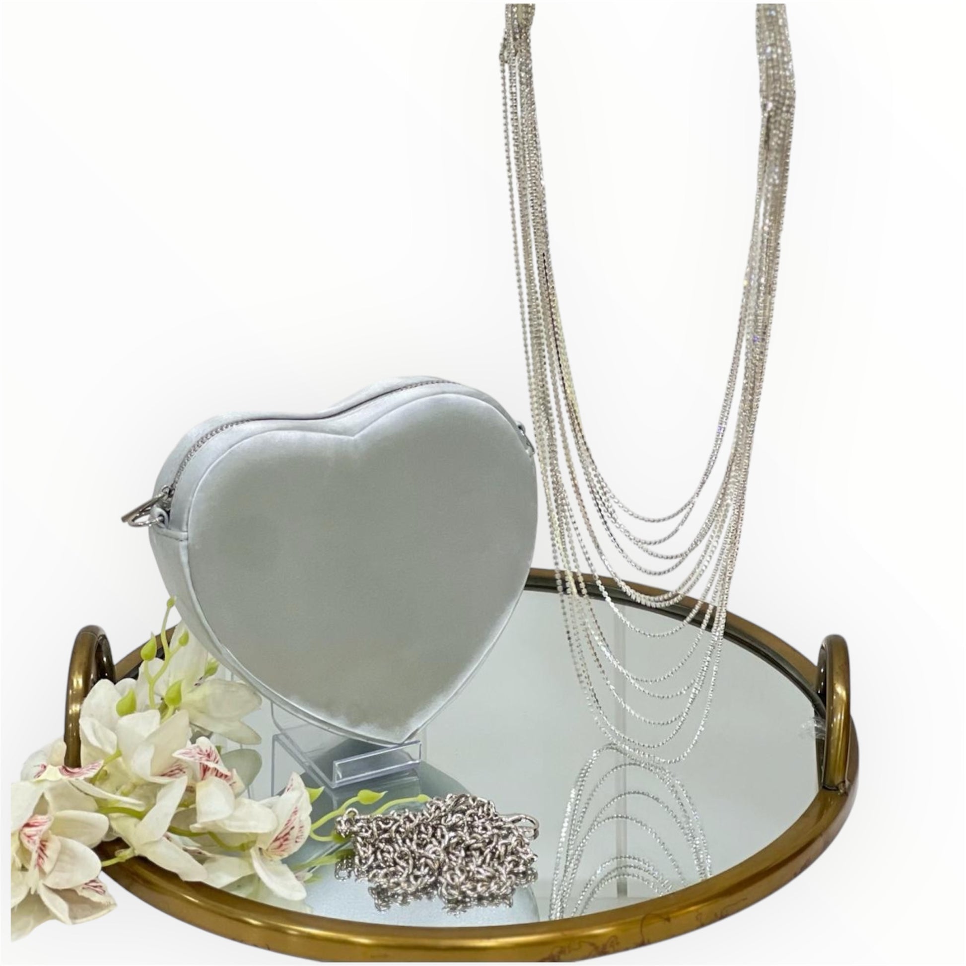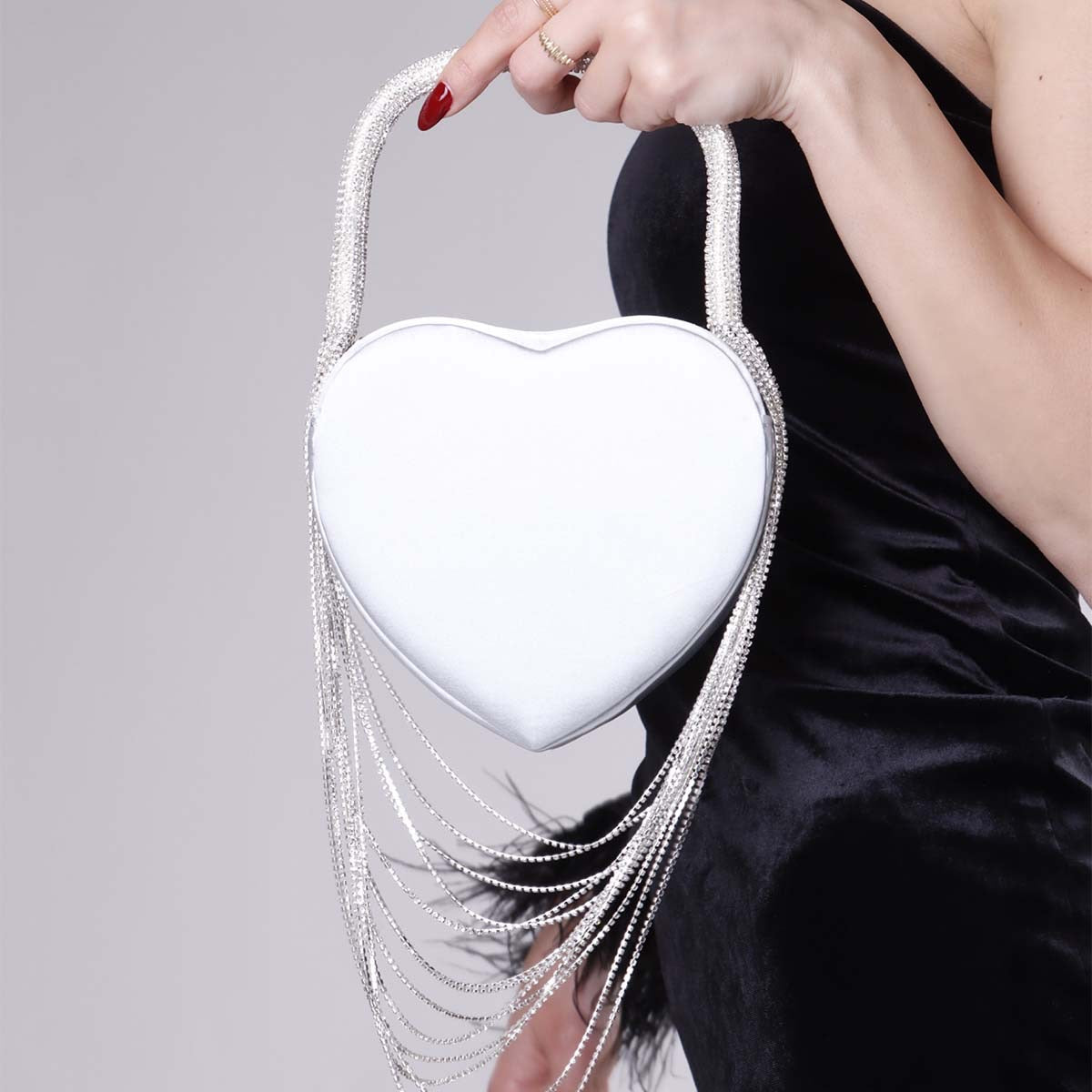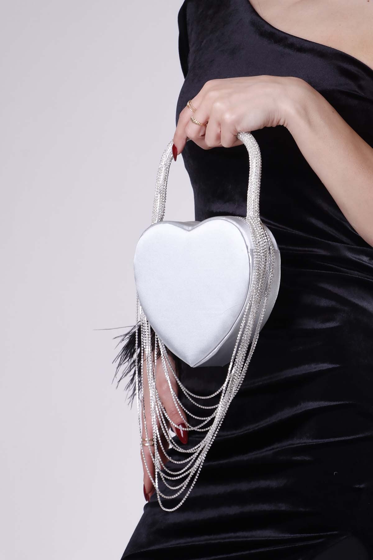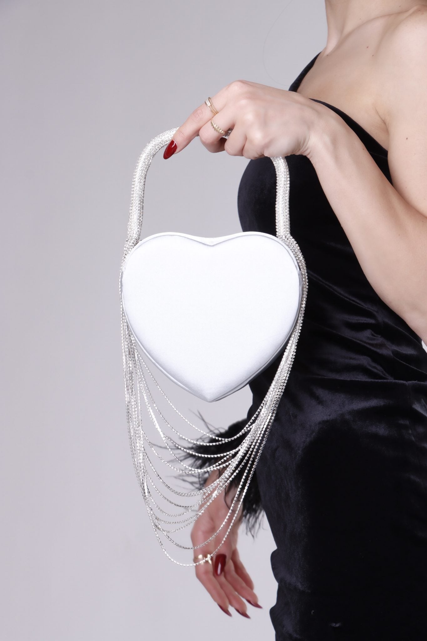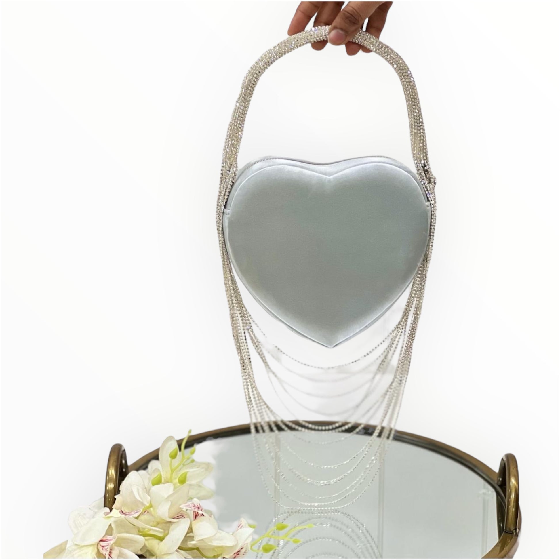 This satin heart bag is the epitome of elegance and charm, designed to make a statement at any party. Featuring a dazzling diamond dangler handle and a sleek sling chain, this bag effortlessly blends luxury and functionality. Its unique heart shape and lustrous satin finish add a touch of romance and sophistication, making it the classiest party accessory. Perfect for elevating your evening attire, this bag is a must-have for anyone looking to enhance their style with a glamorous touch.