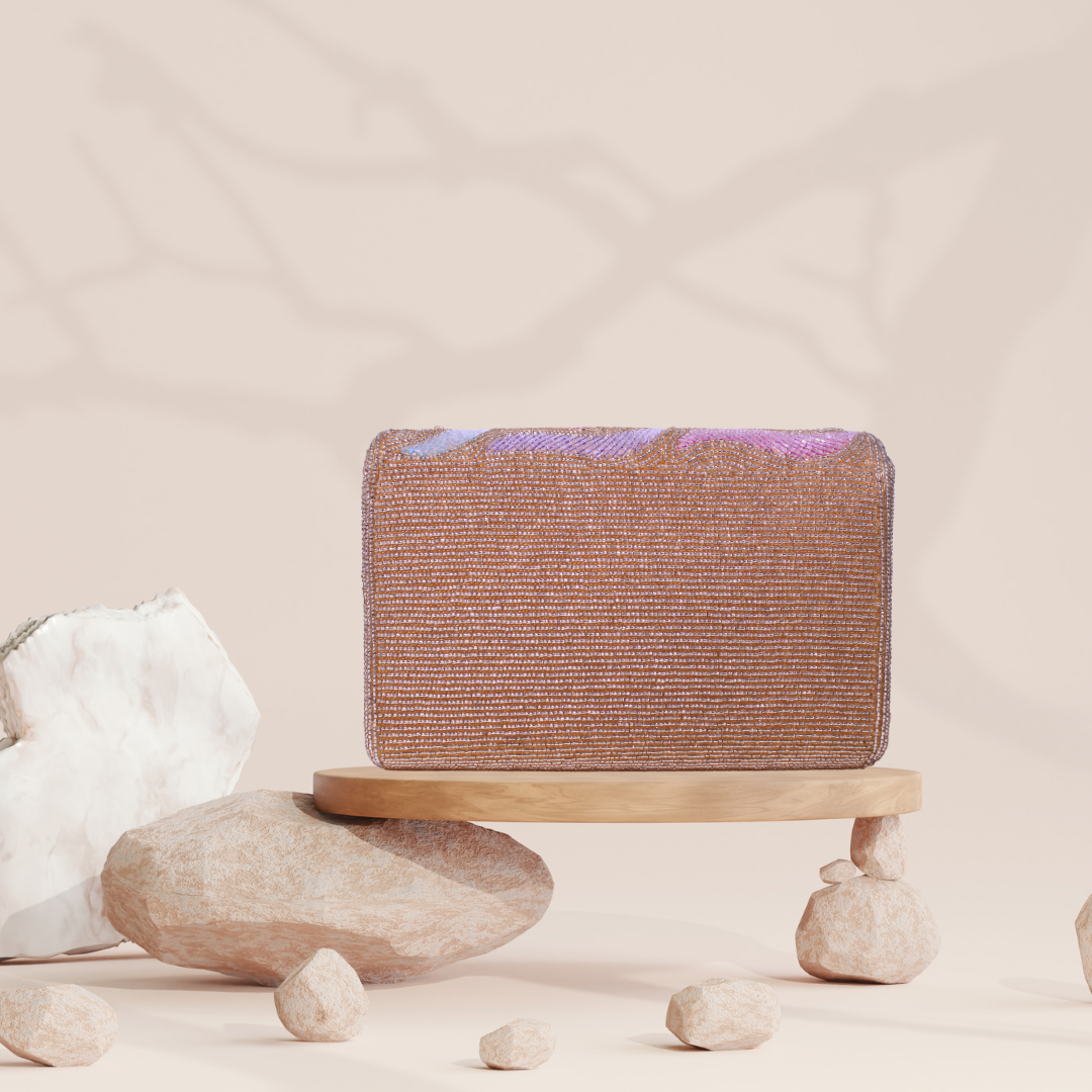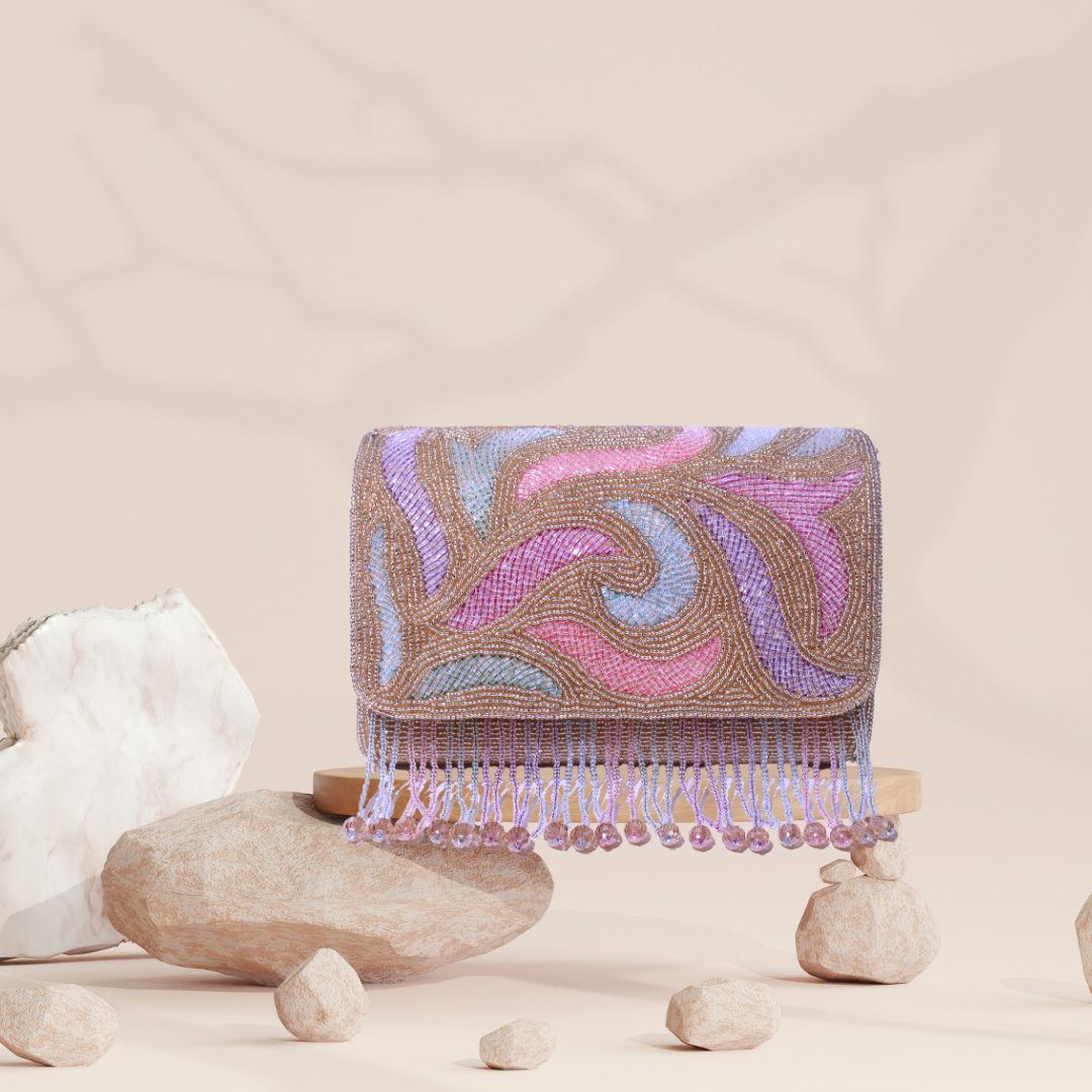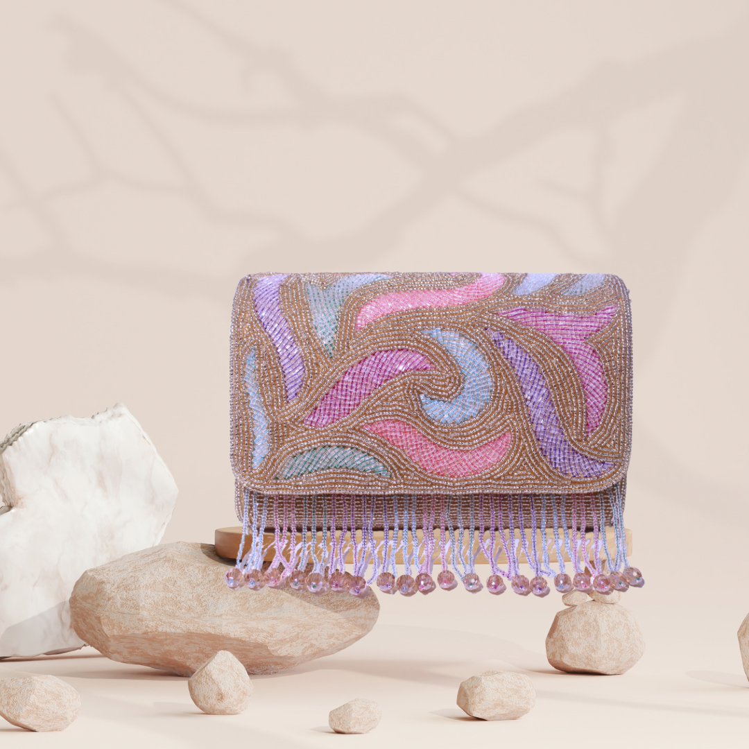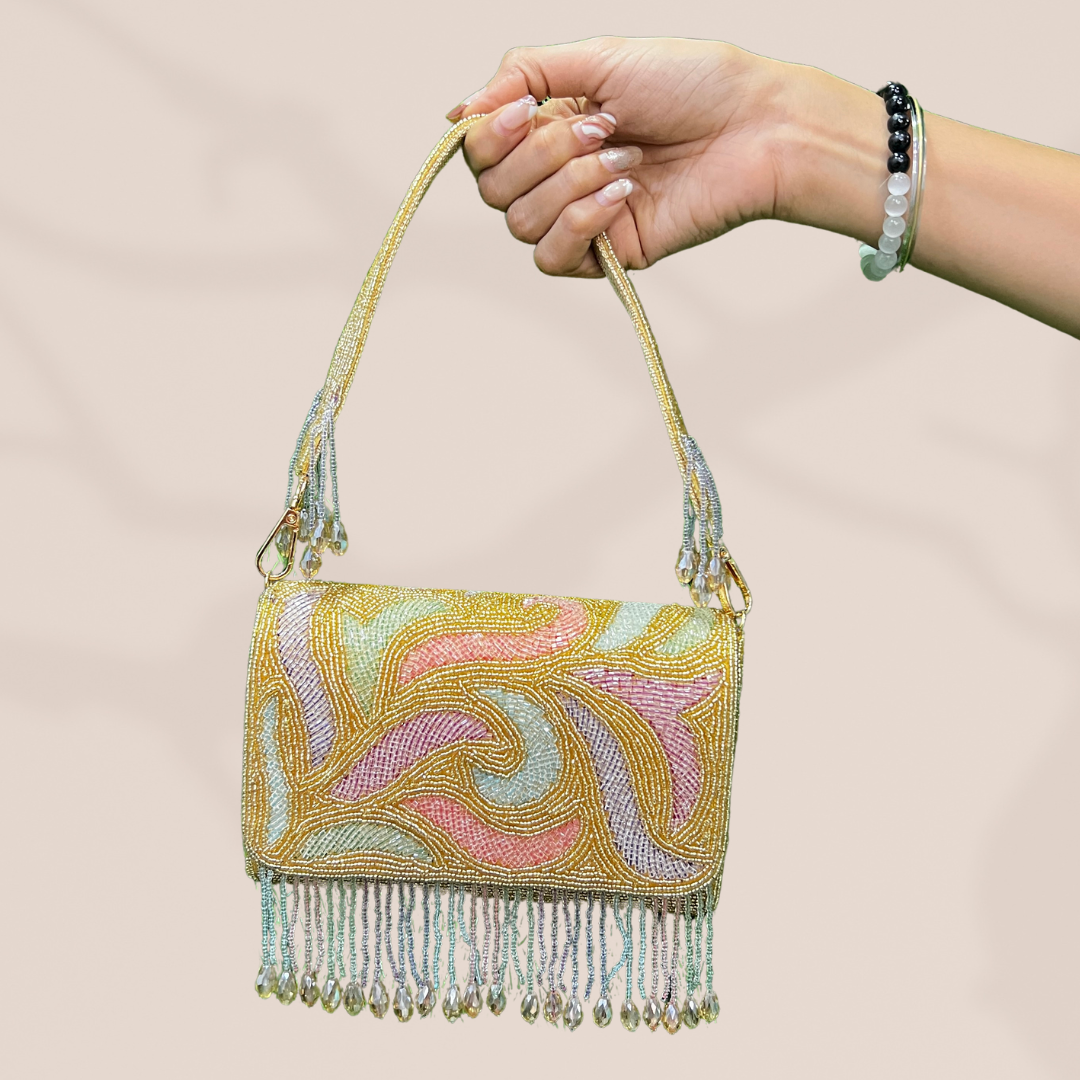 The Vivid Cascade FlapOver Clutch Bag is a true masterpiece of vibrant design and intricate craftsmanship. This flap box bag is entirely covered with seed bead embroidery, featuring a flap adorned with random leaf-type shapes filled with different colors like purple, violet, light blue, green, and pink. Tassel hangings in alternating colors add a dynamic and playful touch to the flap, while the wrist handle, covered in seed bead handwork, features tassel hangings on both ends. This bag is perfect for those who love to make a statement with their accessories, adding a pop of color and sophistication to any outfit.