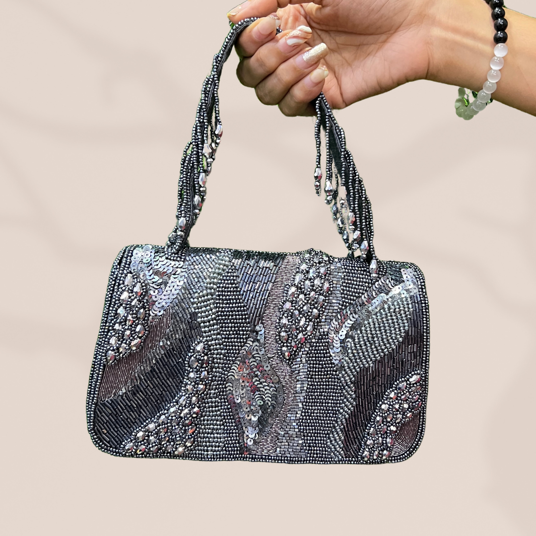 Elevate your style with our stunning Flap Box Bag, adorned with pony beads, crystals, seed beads, sequins and cut dana embroidery. Handcrafted to perfection, this bag features intricate handwork on all sides, ensuring a unique and luxurious finish. The flap box design offers both elegance and functionality, with a spacious interior to carry your essentials. Perfect for any occasion, this bag seamlessly transitions from day to night. Experience the beauty of detailed craftsmanship and make a statement with every use. Shop now and embrace the artistry of our exquisite Flap Box Bag.