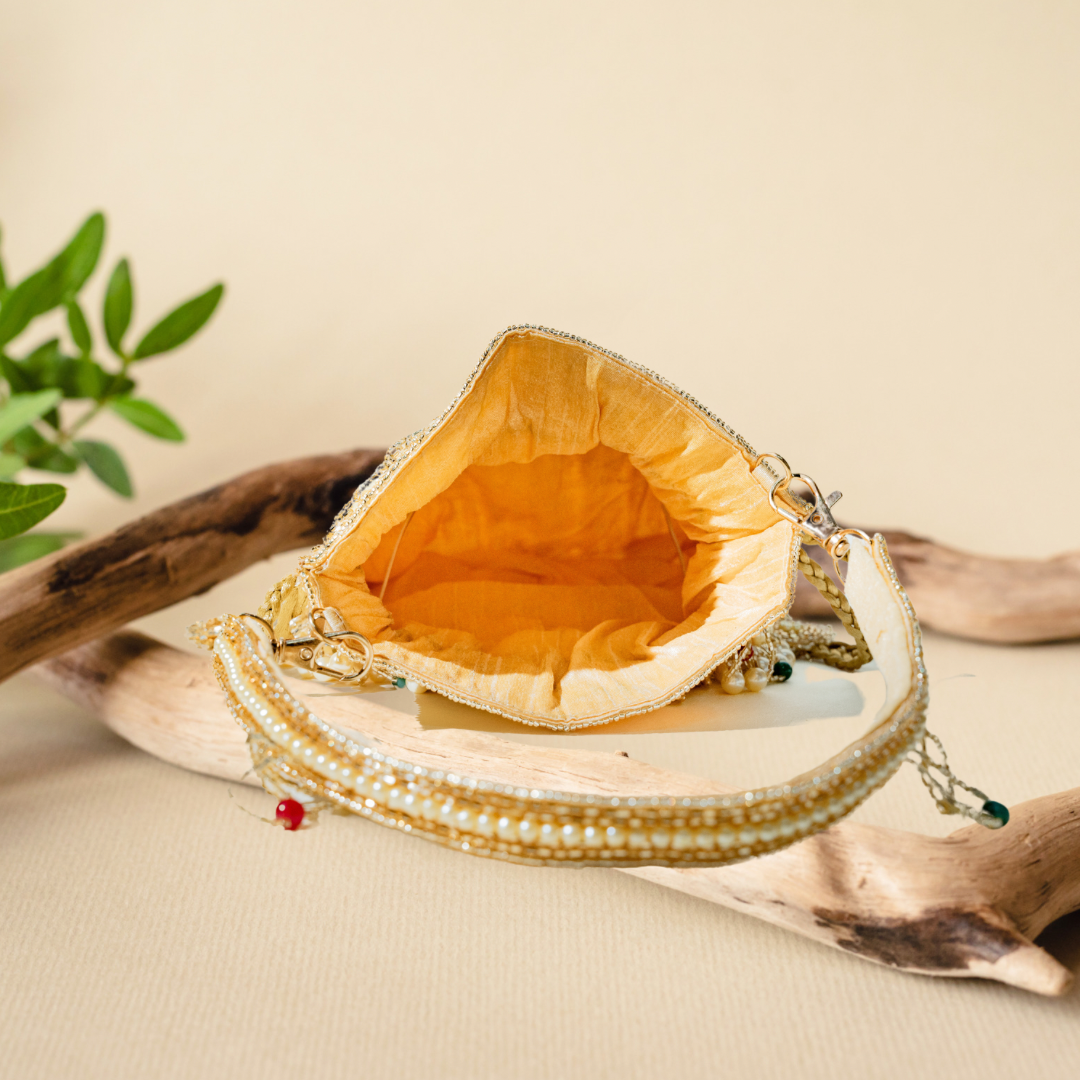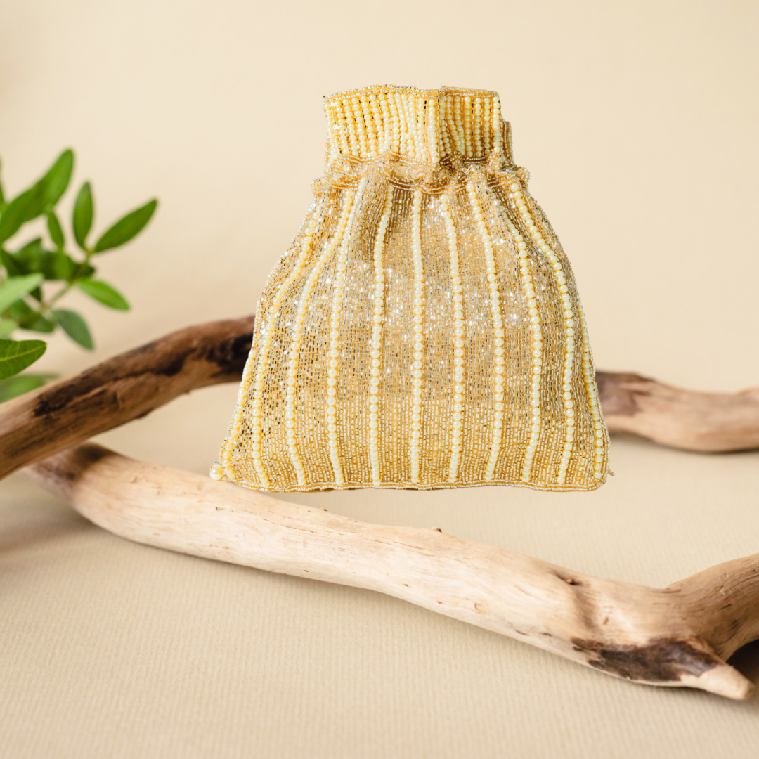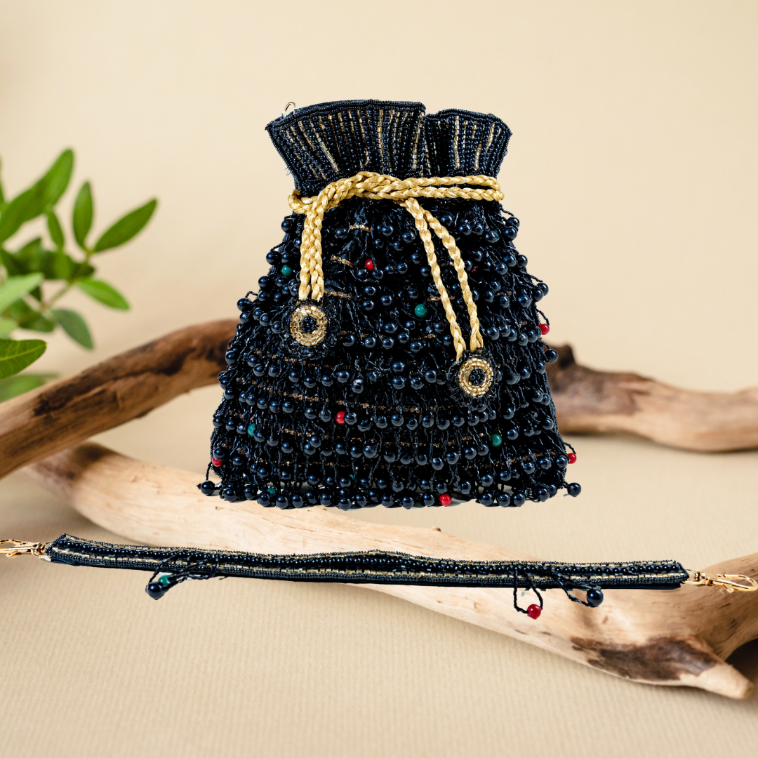 Unveil the treasure of elegance with our Beaded Tassel Treasure Potli. This exquisite piece features intricate hand embroidery with nine diamond lines at 0.75-inch intervals, each gap adorned with zigzag bugle bead lines. Beneath each diamond line, elegant tasseled danglers made from bugle beads and large pearls sway gracefully, while scattered danglers with ruby or emerald-colored round beads add a vibrant touch. The top of the potli showcases alternating lines of pearls and bugle beads, creating a mesmerizing pattern. The backside boasts five lines of bugle beads with a single line of pearls. The handle, adorned with bugle beads, pearls, and seed bead lines, features bugle bead danglers, completing the luxurious look. A perfect blend of style and functionality, it's the ideal accessory for special occasions. This collectible statement accessory fits in your valuables like makeup, keys, currency and cards.