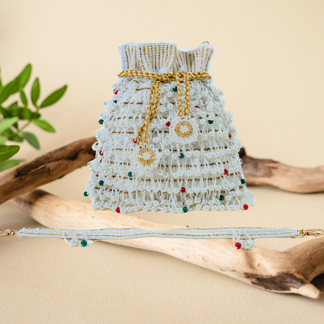 Unveil the treasure of elegance with our Beaded Tassel Treasure Potli. This exquisite piece features intricate hand embroidery with nine diamond lines at 0.75-inch intervals, each gap adorned with zigzag bugle bead lines. Beneath each diamond line, elegant tasseled danglers made from bugle beads and large pearls sway gracefully, while scattered danglers with ruby or emerald-colored round beads add a vibrant touch. The top of the potli showcases alternating lines of pearls and bugle beads, creating a mesmerizing pattern. The backside boasts five lines of bugle beads with a single line of pearls. The handle, adorned with bugle beads, pearls, and seed bead lines, features bugle bead danglers, completing the luxurious look. A perfect blend of style and functionality, it's the ideal accessory for special occasions. This collectible statement accessory fits in your valuables like makeup, keys, currency and cards.