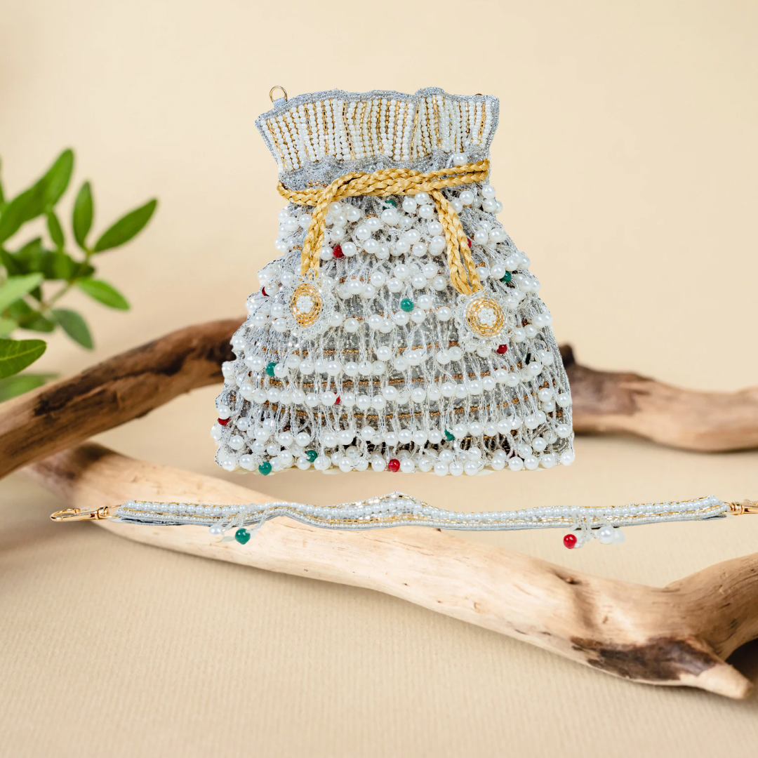 Unveil the treasure of elegance with our Beaded Tassel Treasure Potli. This exquisite piece features intricate hand embroidery with nine diamond lines at 0.75-inch intervals, each gap adorned with zigzag bugle bead lines. Beneath each diamond line, elegant tasseled danglers made from bugle beads and large pearls sway gracefully, while scattered danglers with ruby or emerald-colored round beads add a vibrant touch. The top of the potli showcases alternating lines of pearls and bugle beads, creating a mesmerizing pattern. The backside boasts five lines of bugle beads with a single line of pearls. The handle, adorned with bugle beads, pearls, and seed bead lines, features bugle bead danglers, completing the luxurious look. A perfect blend of style and functionality, it's the ideal accessory for special occasions. This collectible statement accessory fits in your valuables like makeup, keys, currency and cards.