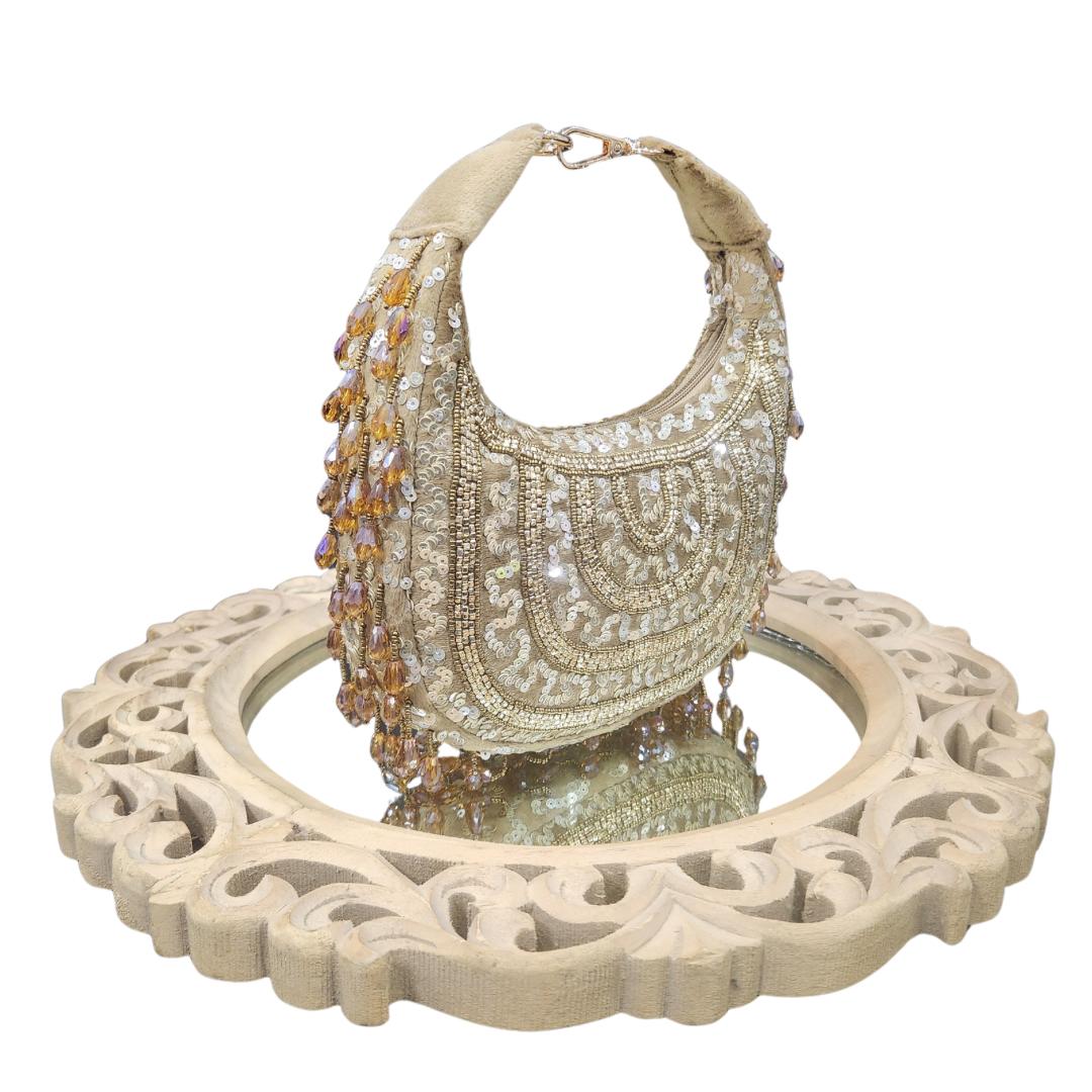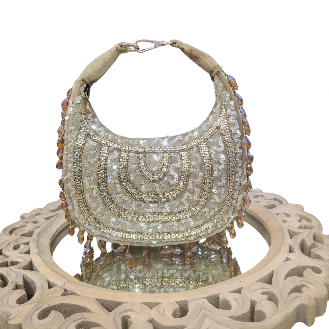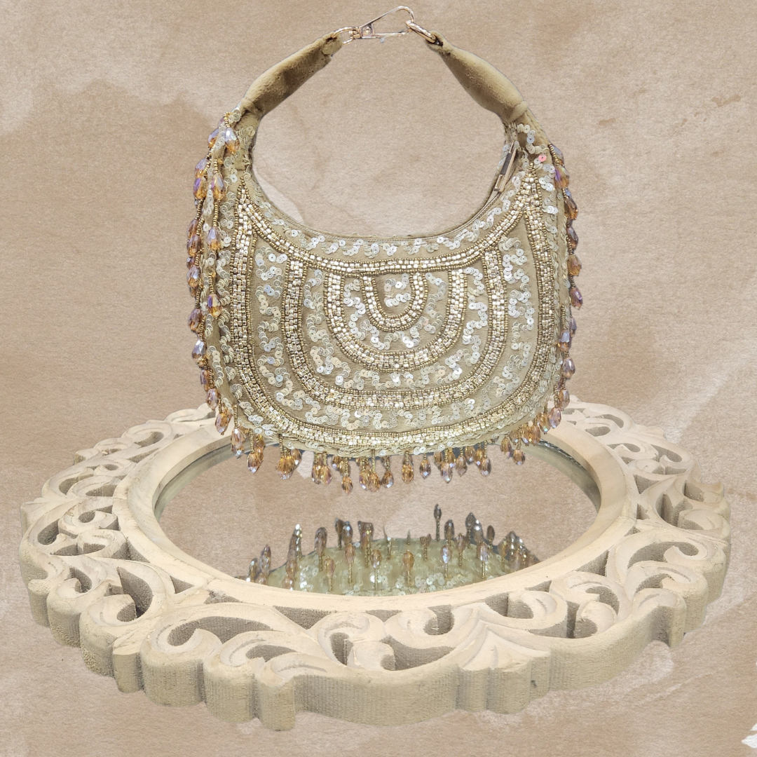 "Make a statement with this stunning moon-shaped bag, featuring intricate hand embroidery with sequins and square-shaped beads. The elegant design is elevated by shimmering glass bead crystal hangings on the sides, adding a touch of glamour. With a secure zip closure and a stylish wrist handle designed as a chic hook, this bag is the perfect blend of functionality and high-fashion. Ideal for parties, weddings, and festive occasions, this bag is sure to turn heads wherever you go."