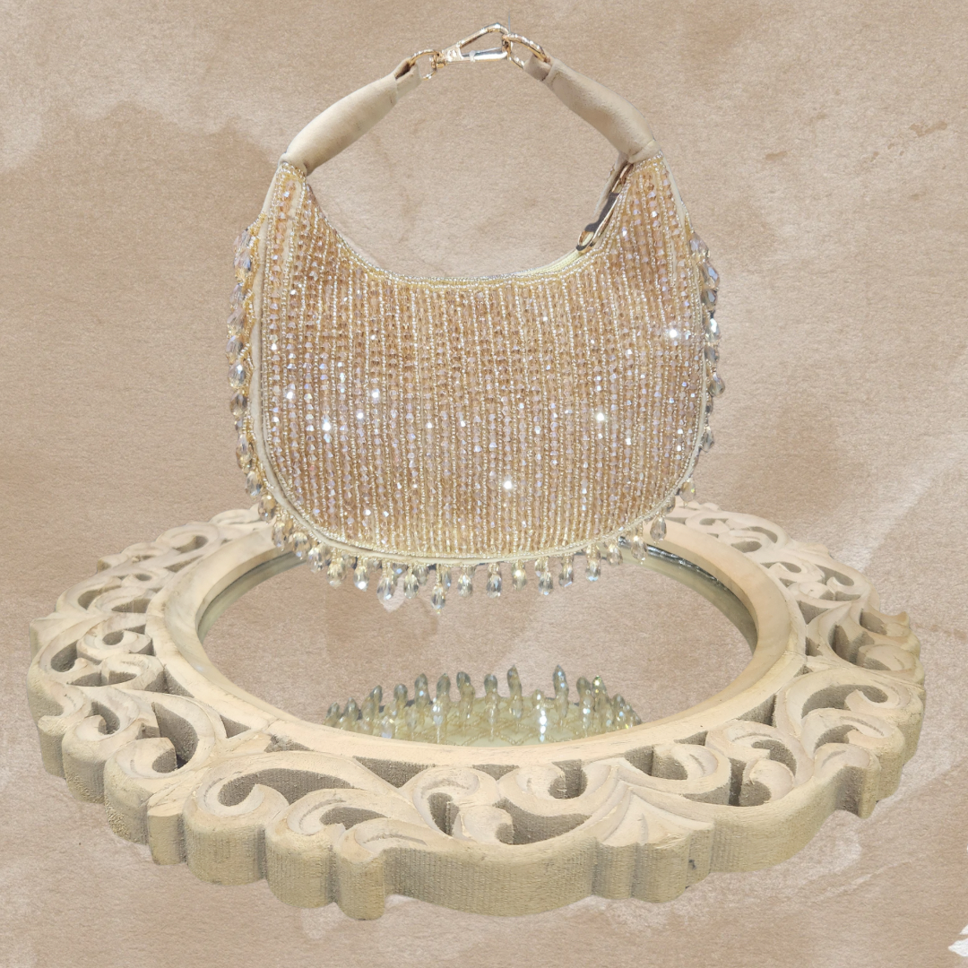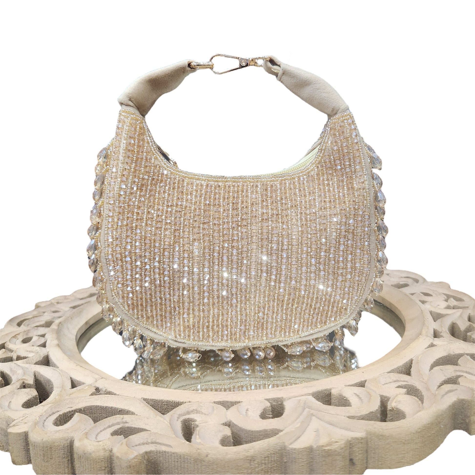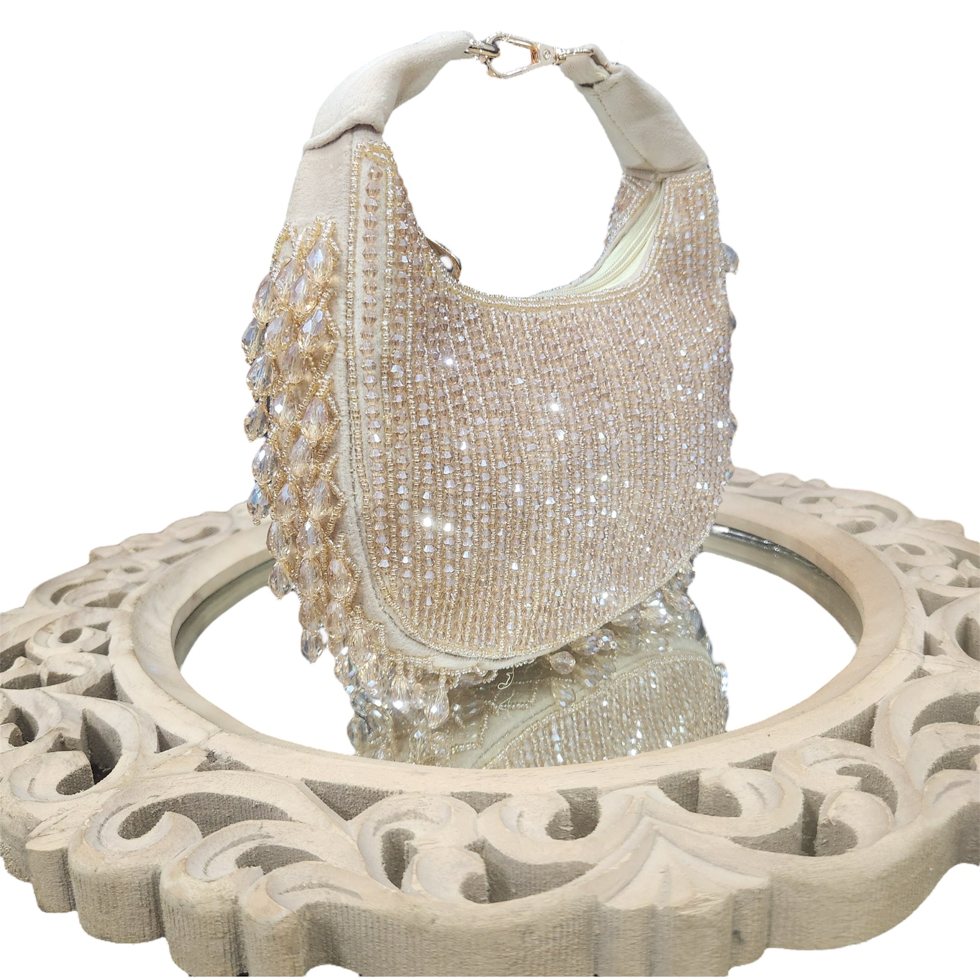 "Embrace timeless elegance with this stunning Crysta moon-shaped bag, featuring exquisite hand embroidery with shimmering glass crystal beads on both sides. The sides are adorned with delicate drop-shaped glass crystal bead hangings, adding a touch of graceful movement and charm. Complete with a secure zip closure and a stylish wrist handle designed as a chic hook, this bag is the perfect accessory to elevate your look for weddings, parties, and glamorous occasions."