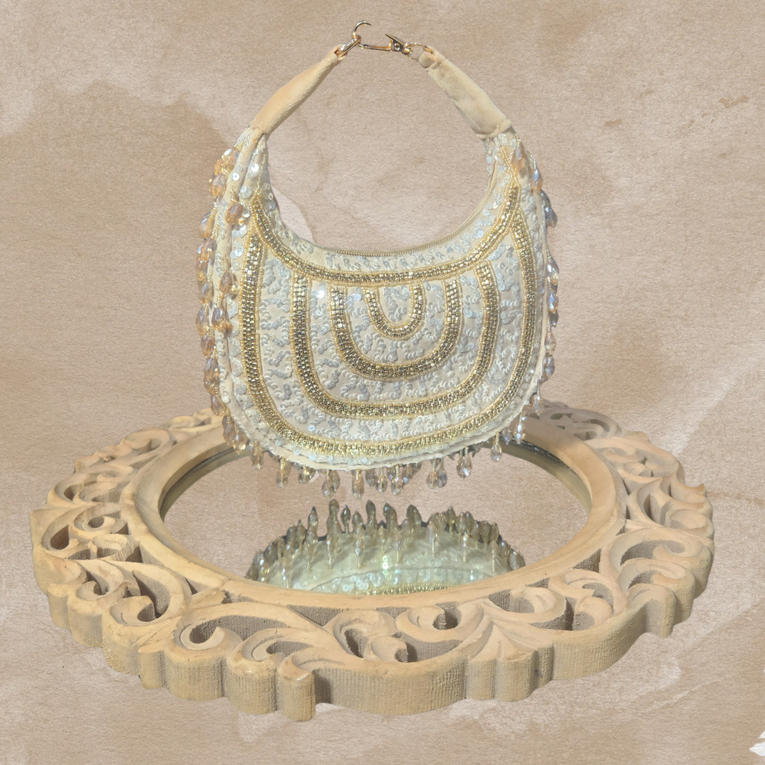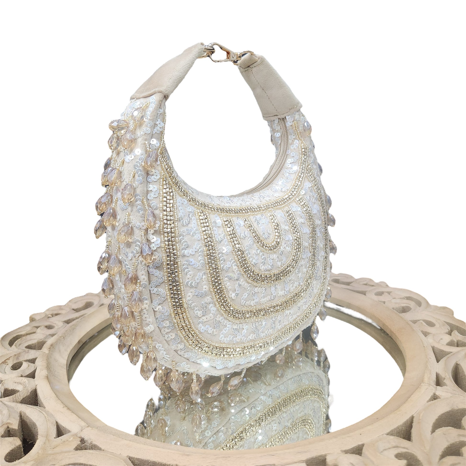 "Make a statement with this stunning moon-shaped bag, featuring intricate hand embroidery with sequins and square-shaped beads. The elegant design is elevated by shimmering glass bead crystal hangings on the sides, adding a touch of glamour. With a secure zip closure and a stylish wrist handle designed as a chic hook, this bag is the perfect blend of functionality and high-fashion. Ideal for parties, weddings, and festive occasions, this bag is sure to turn heads wherever you go."