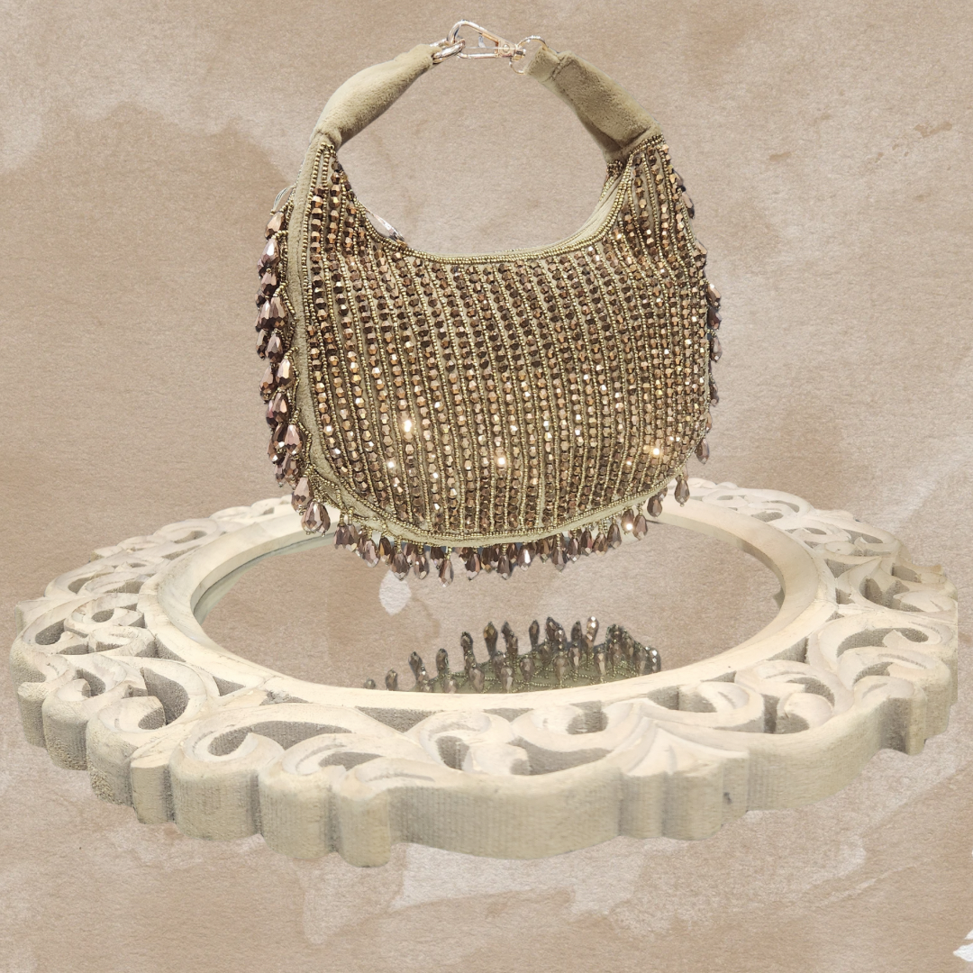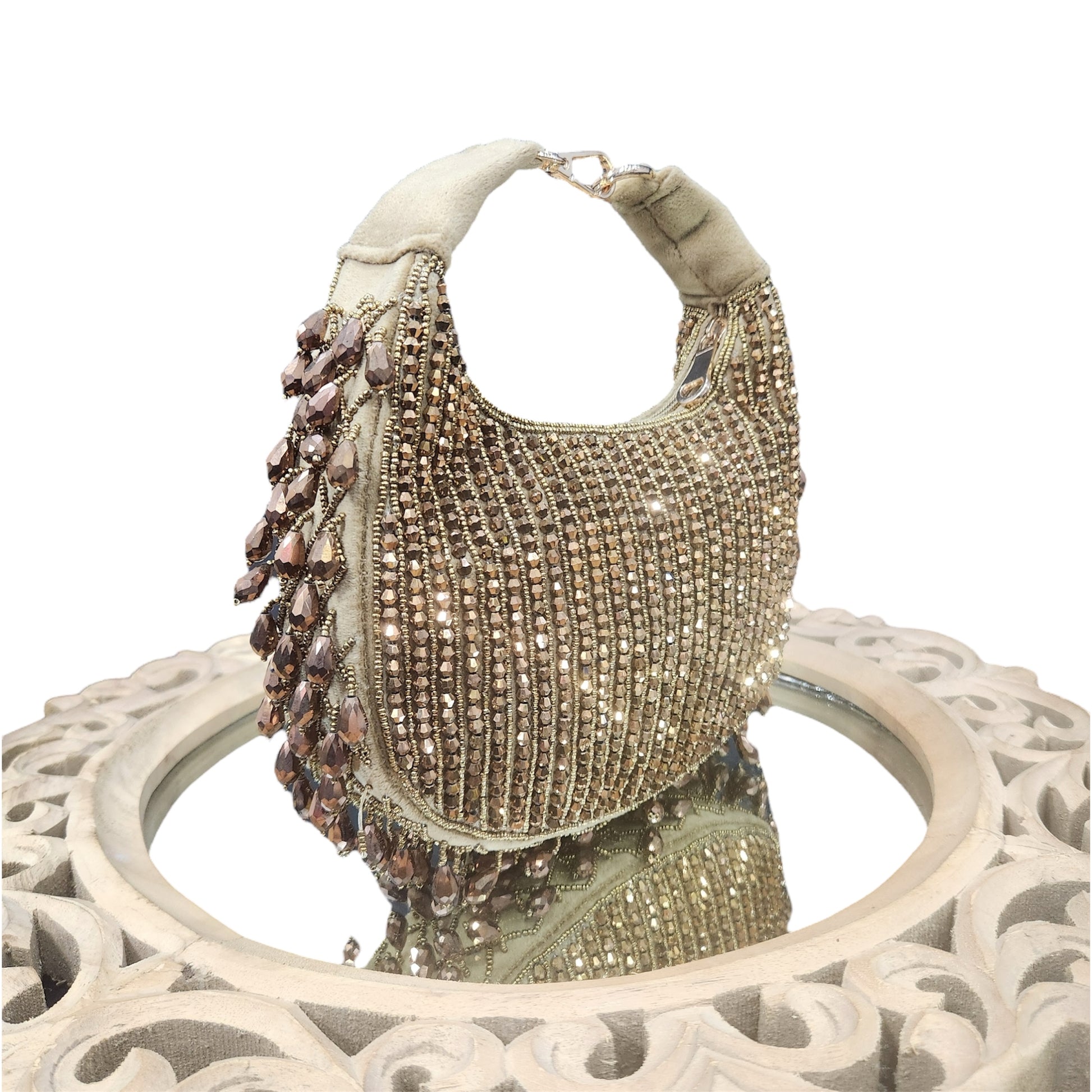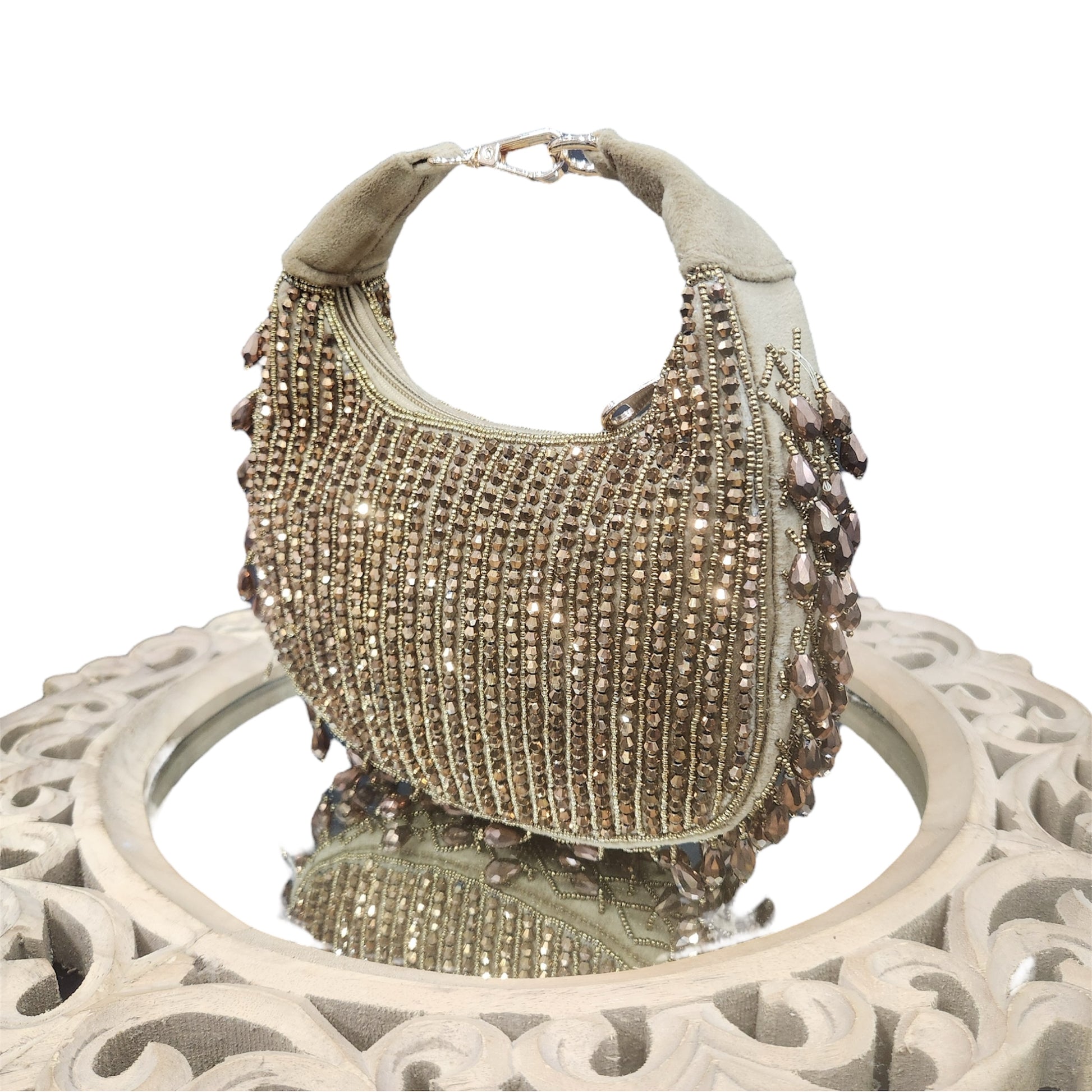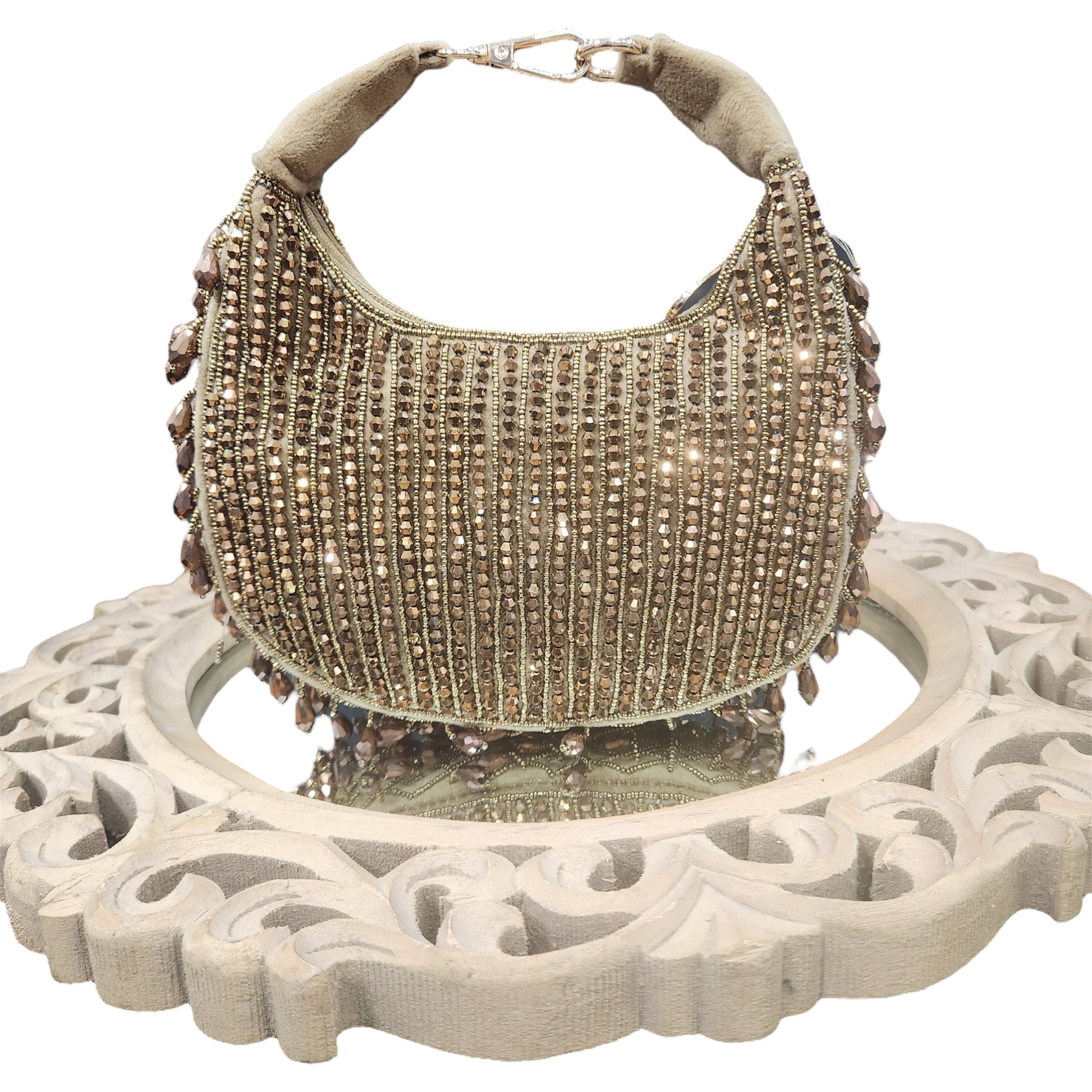 "Embrace timeless elegance with this stunning Crysta moon-shaped bag, featuring exquisite hand embroidery with shimmering glass crystal beads on both sides. The sides are adorned with delicate drop-shaped glass crystal bead hangings, adding a touch of graceful movement and charm. Complete with a secure zip closure and a stylish wrist handle designed as a chic hook, this bag is the perfect accessory to elevate your look for weddings, parties, and glamorous occasions."