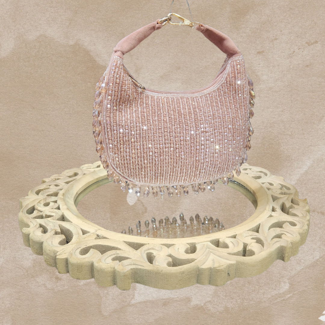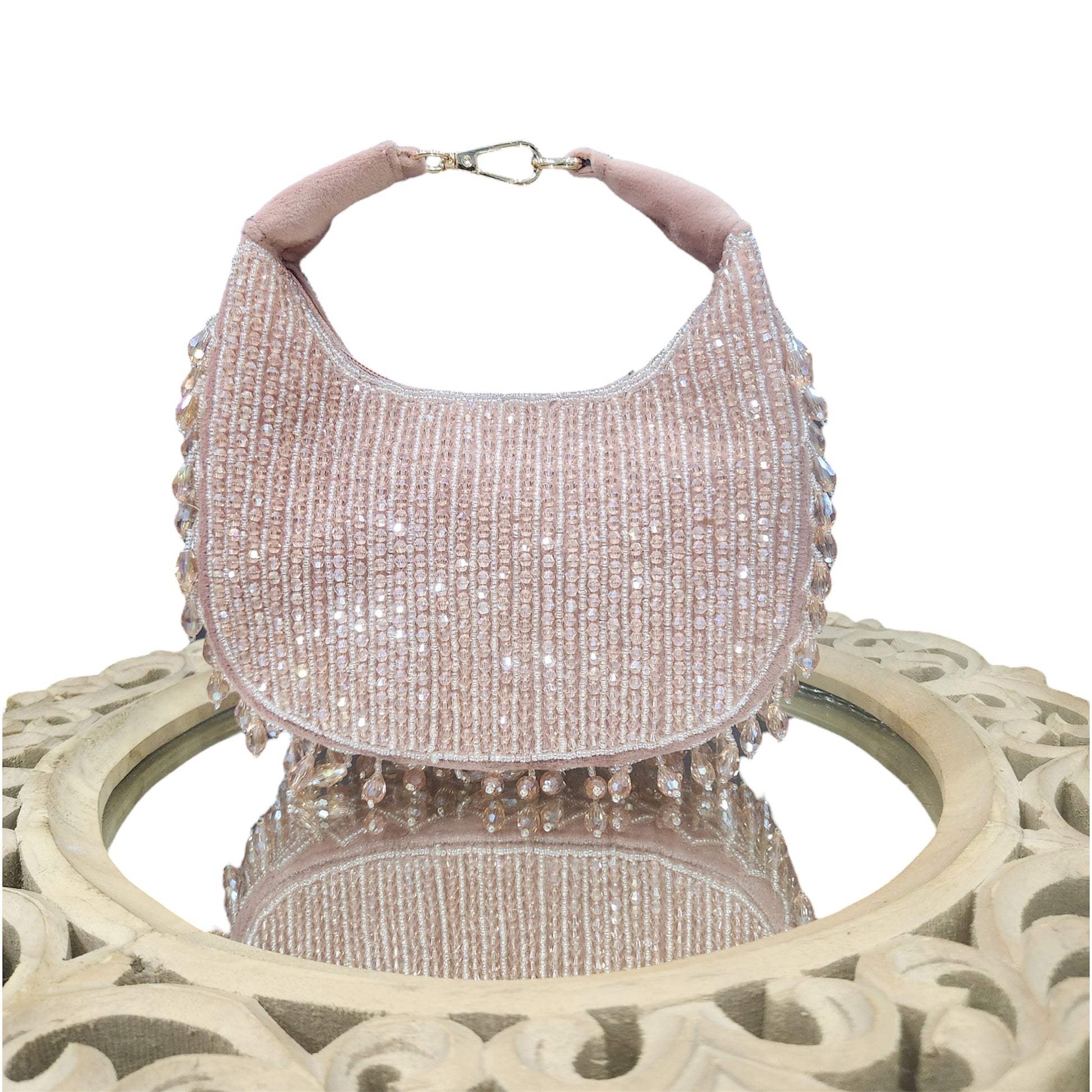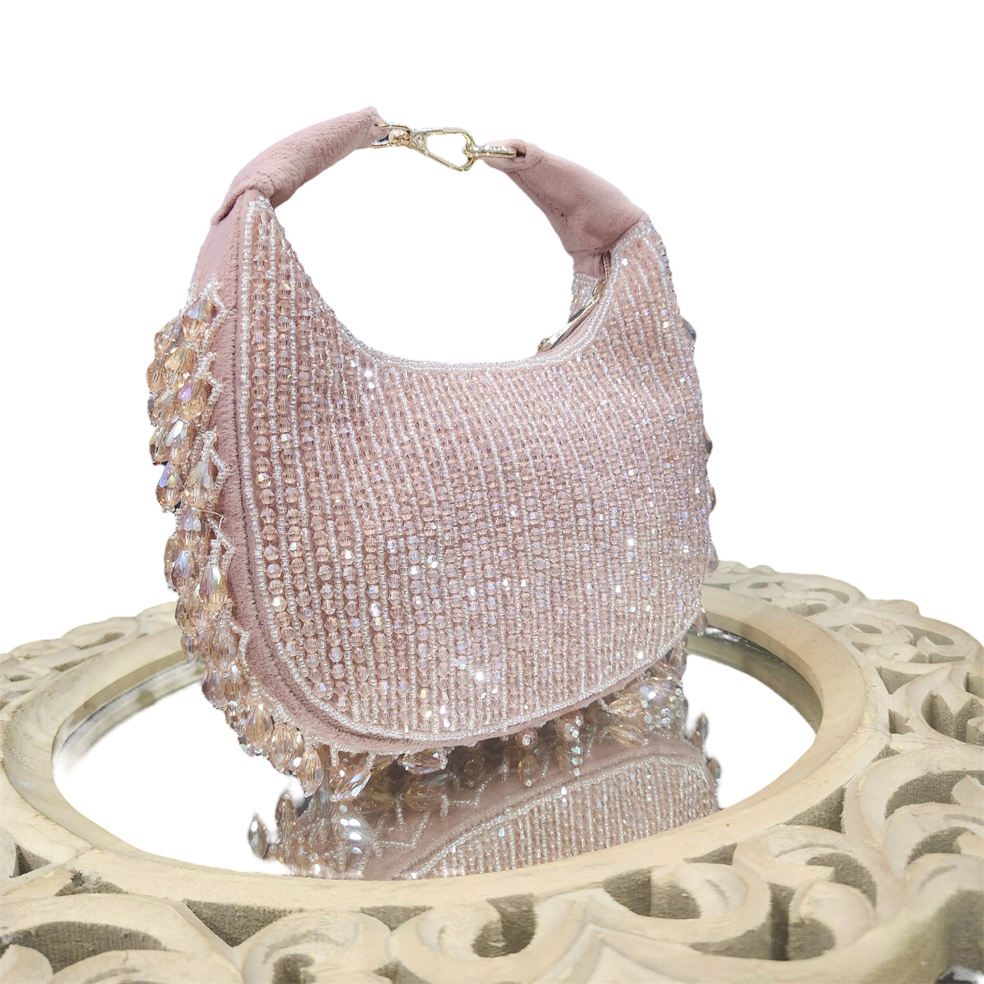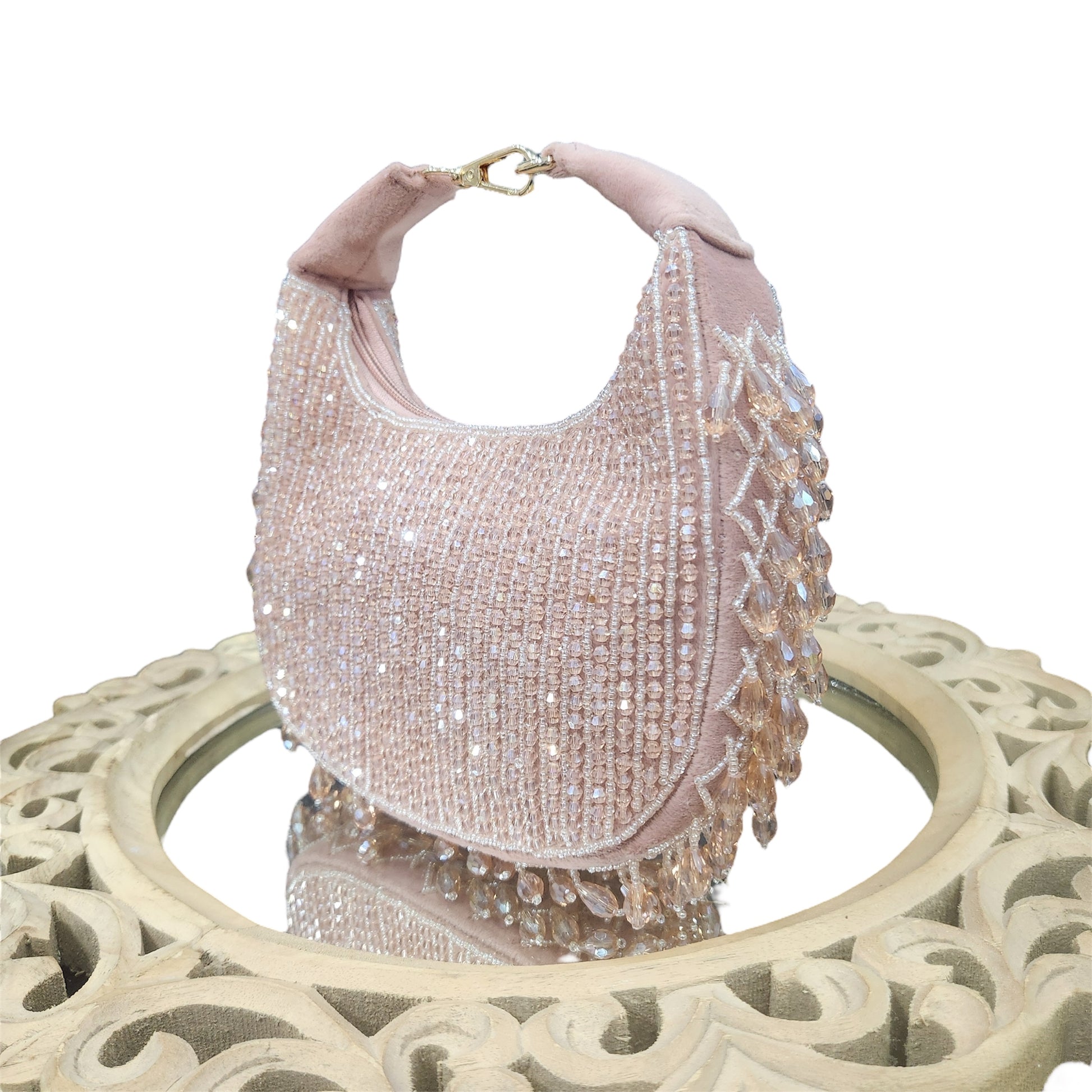 "Embrace timeless elegance with this stunning Crysta moon-shaped bag, featuring exquisite hand embroidery with shimmering glass crystal beads on both sides. The sides are adorned with delicate drop-shaped glass crystal bead hangings, adding a touch of graceful movement and charm. Complete with a secure zip closure and a stylish wrist handle designed as a chic hook, this bag is the perfect accessory to elevate your look for weddings, parties, and glamorous occasions."