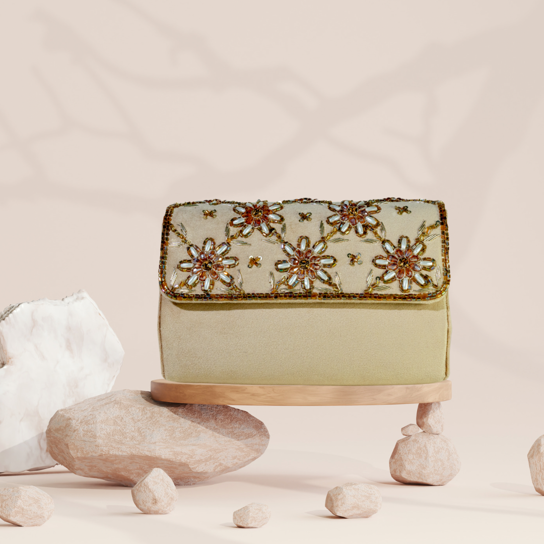 Crystal Blossom Gold Velvet FlapOver Clutch Bag