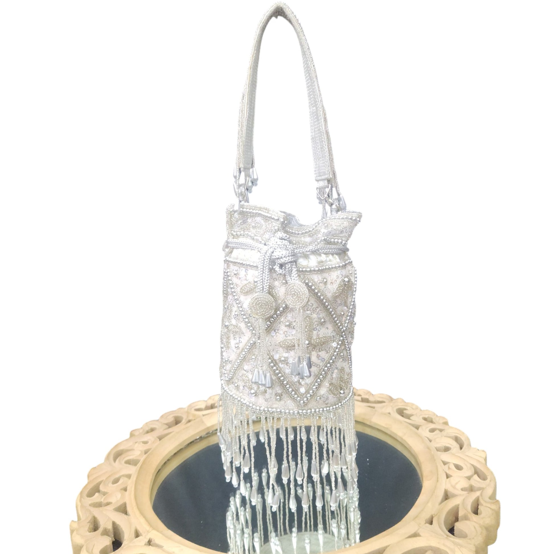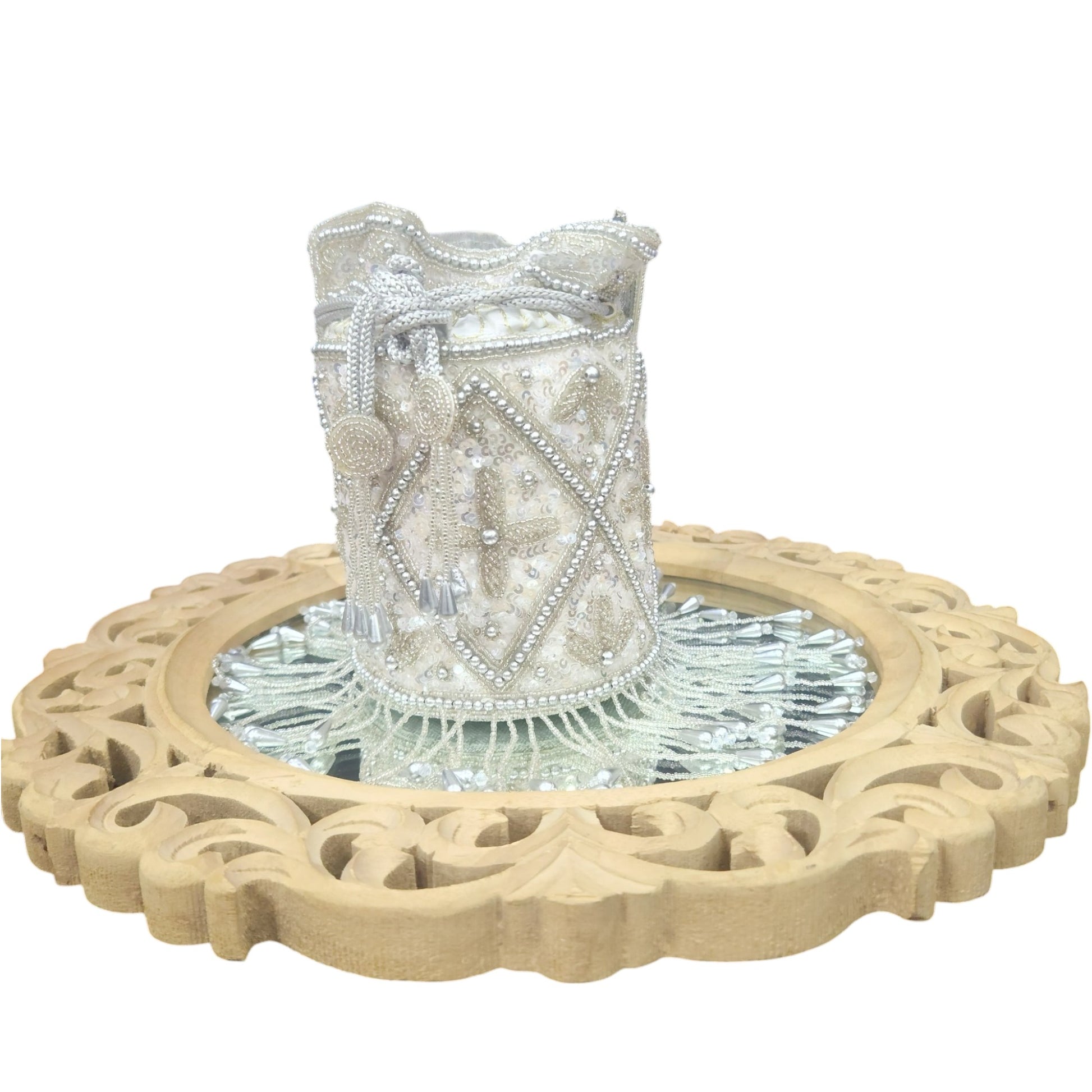 The Afreen Sequin Pearl Potli is a beautiful blend of intricate craftsmanship and elegant design. The bag is adorned with exquisite sequins handwork, creating several small, dispersed flower formations with drop-shaped pearls. The seed beads tassel hangings, each ending with a drop-shaped pearl, add a whimsical and luxurious touch. The handle, embellished with sequin and delicate pearl handwork and matching tassels on both ends, enhances the bag’s overall charm. Perfect for weddings, parties, and festive occasions, this potli bag is a perfect accessory to elevate your elegant ensemble.