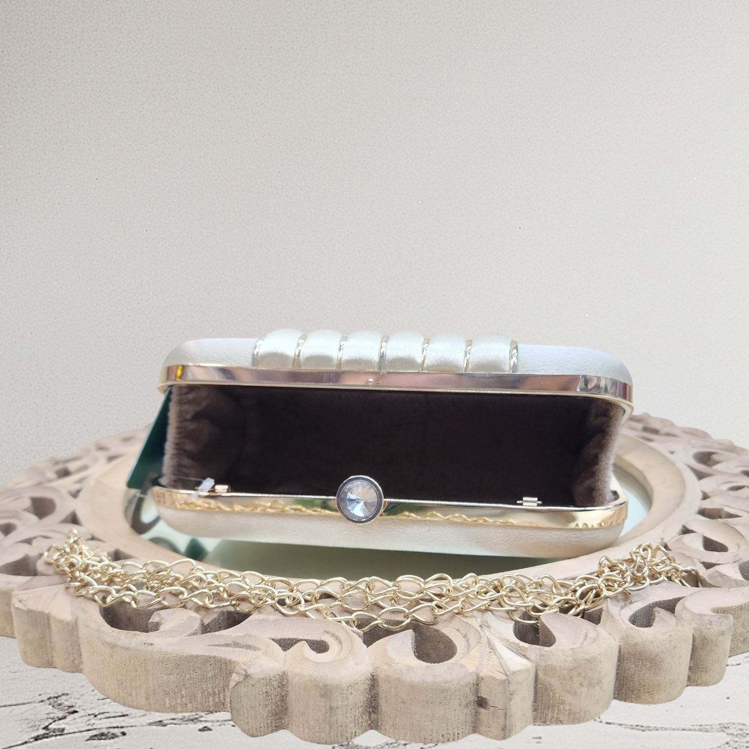Elevate your elegance with this timeless satin box clutch — a sleek blend of modern structure and classic sophistication. Crafted in a premium satin finish with luxe metal stripe accents.