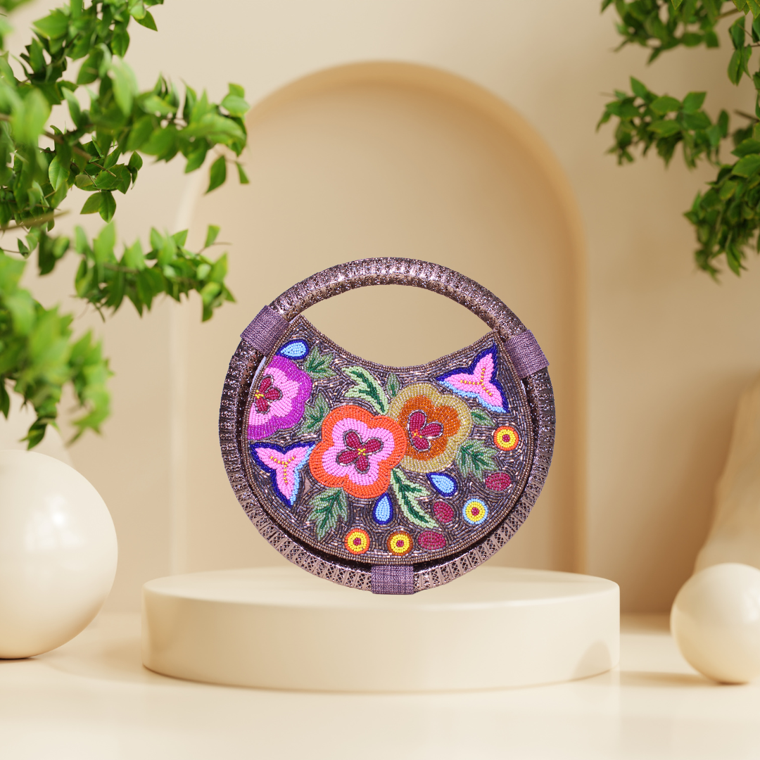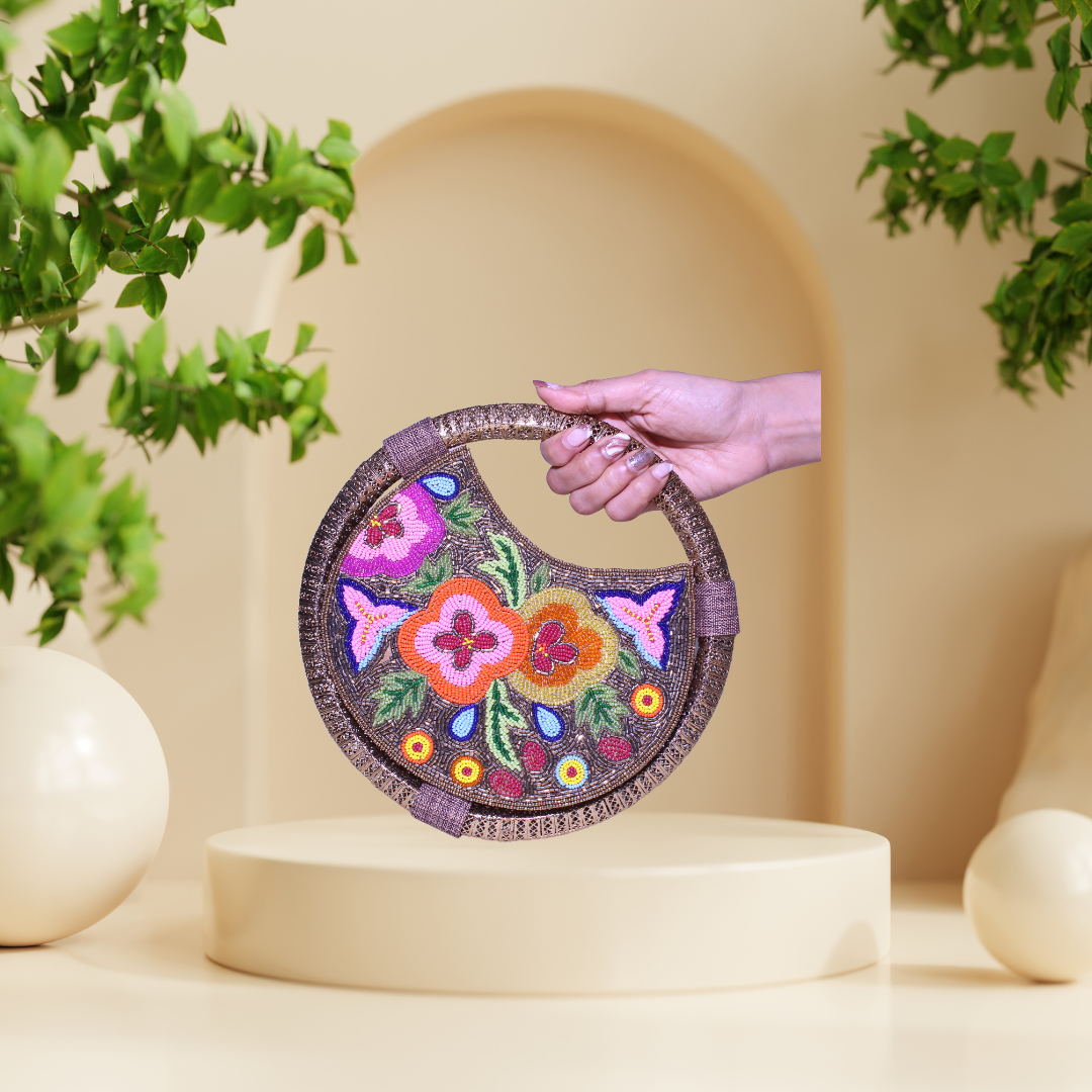Introducing our stunning Floral Multicolour Seed Bead & Cut Dana Embroidered Ring Bag, a true masterpiece of artistry and elegance. This unique bag is adorned with intricate floral patterns, meticulously crafted from an array of vibrant seed beads and shimmering cut dana. The multicolour embroidery creates a breathtaking mosaic of colors, making this bag a standout accessory for any occasion. The bag features a distinctive ring handle, adding a touch of modern flair to its classic design. The handle allows for effortless carrying and can be comfortably worn on the wrist, providing both style and convenience. The compact yet spacious interior is perfect for holding your essentials, making it an ideal choice for evening events, weddings, and special celebrations.