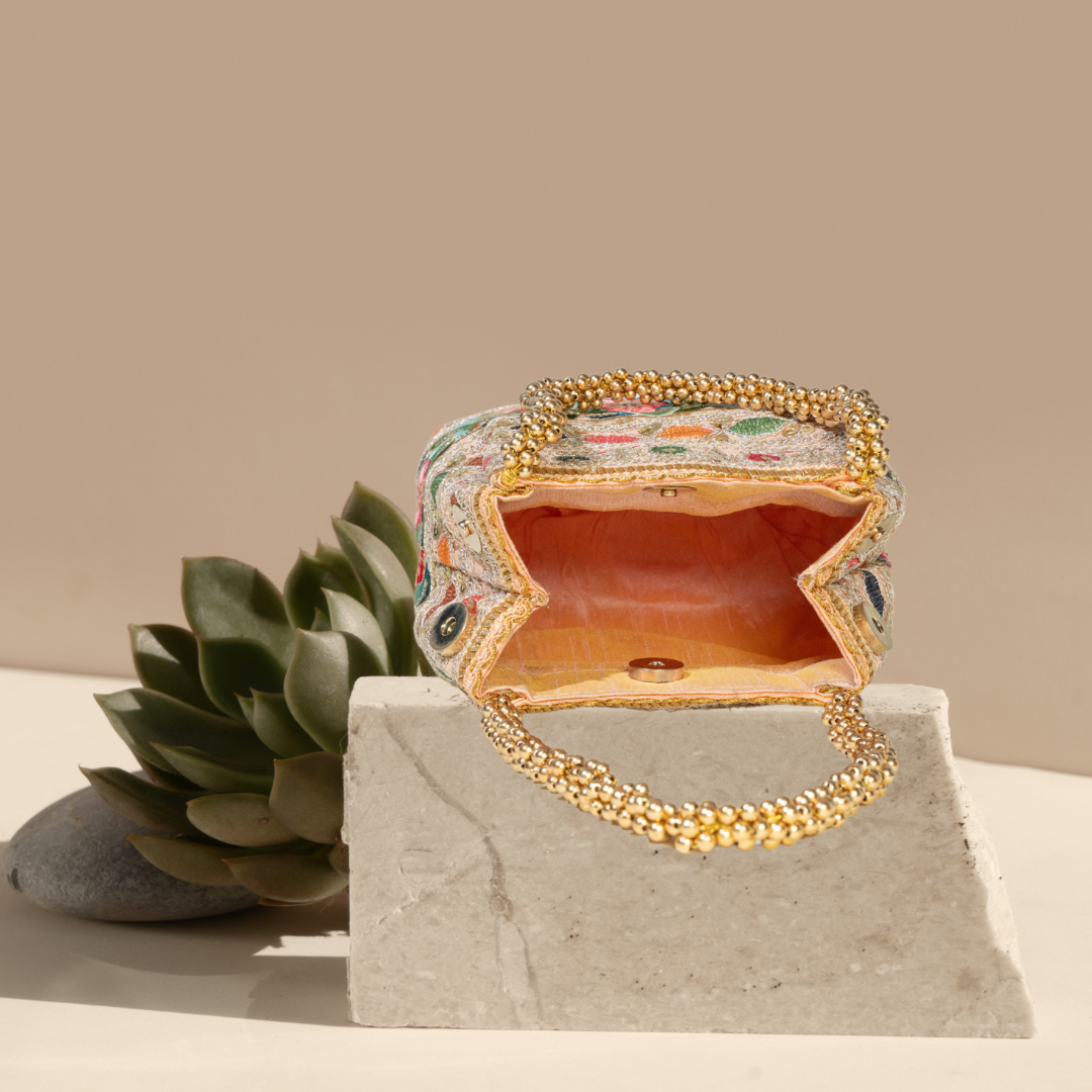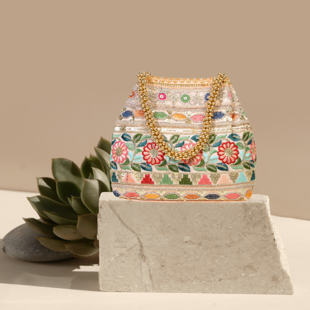 Discover the enchanting beauty of our Florenza Resham Potli. Crafted from luxurious raw silk, this potli showcases detailed Resham work depicting a colorful array of flowers and leaves. The whimsical floral design adds a playful and artistic touch to this elegant accessory. It comes with 3 magnets for closure & a beautiful golden handle, while the spacious interior provides ample space for your essentials, making it perfect for special occasions, weddings, or festive celebrations.