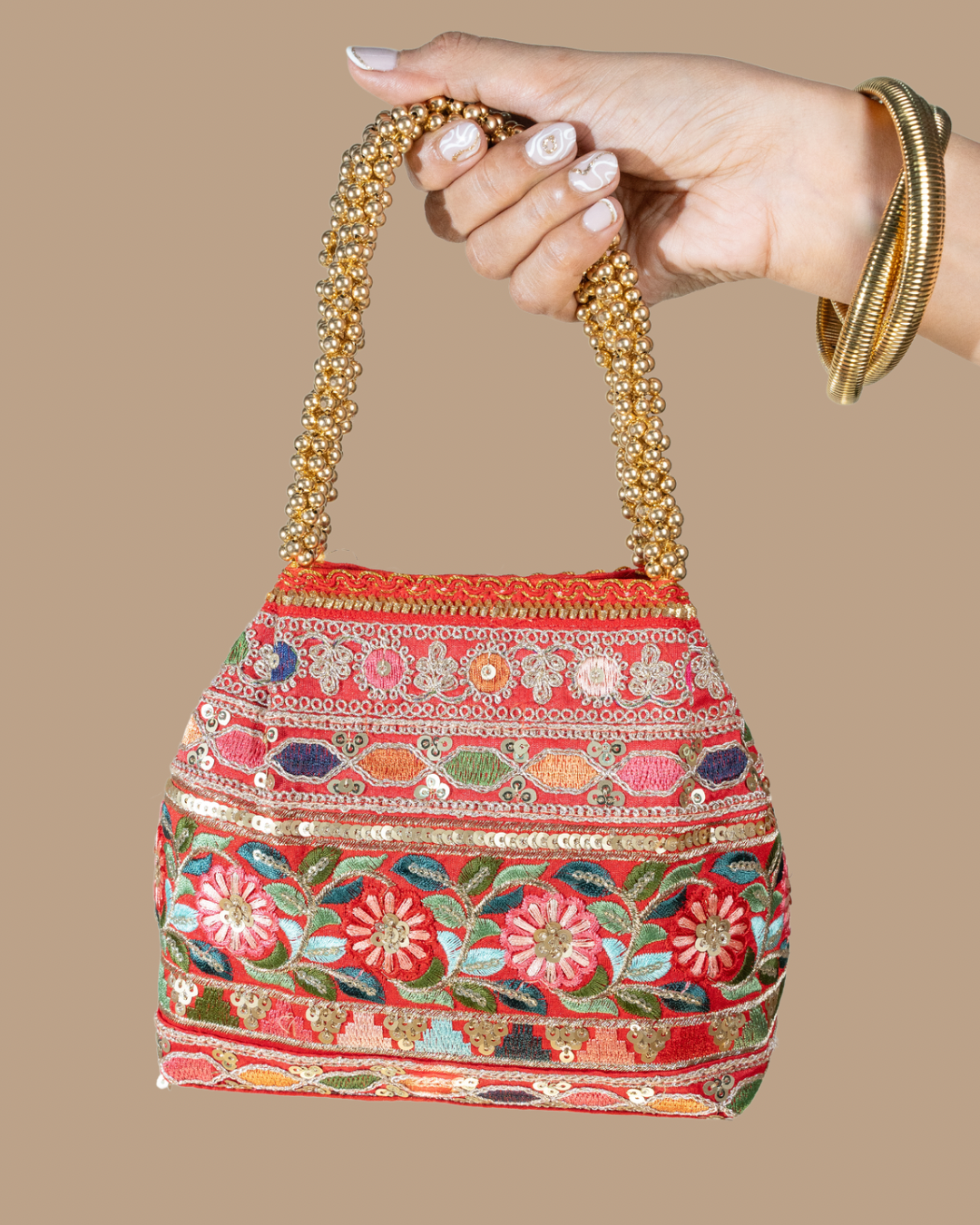 Discover the enchanting beauty of our Florenza Resham Potli. Crafted from luxurious raw silk, this potli showcases detailed Resham work depicting a colorful array of flowers and leaves. The whimsical floral design adds a playful and artistic touch to this elegant accessory. It comes with 3 magnets for closure & a beautiful golden handle, while the spacious interior provides ample space for your essentials, making it perfect for special occasions, weddings, or festive celebrations.