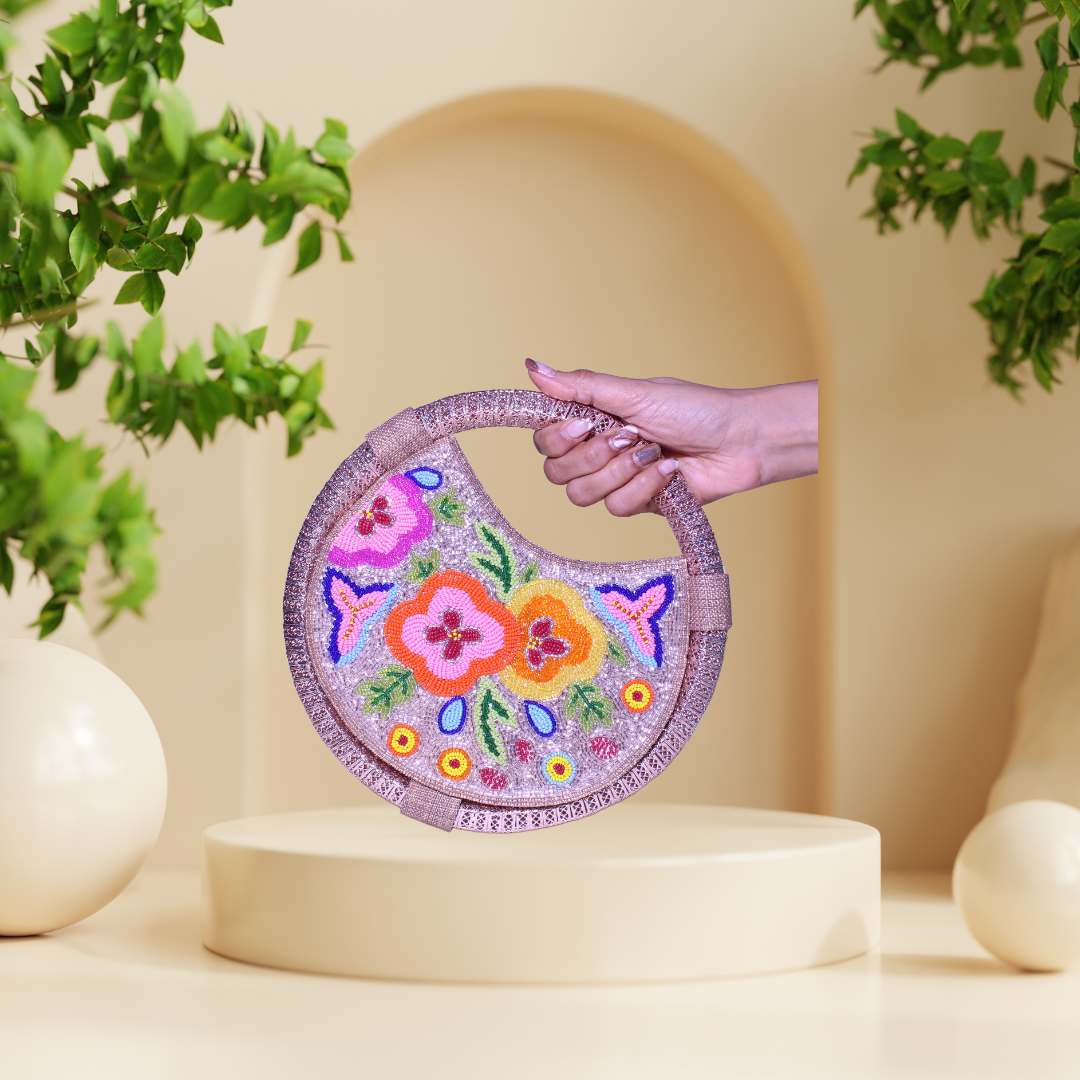 Introducing our stunning Floral Multicolour Seed Bead & Cut Dana Embroidered Ring Bag, a true masterpiece of artistry and elegance. This unique bag is adorned with intricate floral patterns, meticulously crafted from an array of vibrant seed beads and shimmering cut dana. The multicolour embroidery creates a breathtaking mosaic of colors, making this bag a standout accessory for any occasion. The bag features a distinctive ring handle, adding a touch of modern flair to its classic design. The handle allows for effortless carrying and can be comfortably worn on the wrist, providing both style and convenience. The compact yet spacious interior is perfect for holding your essentials, making it an ideal choice for evening events, weddings, and special celebrations.