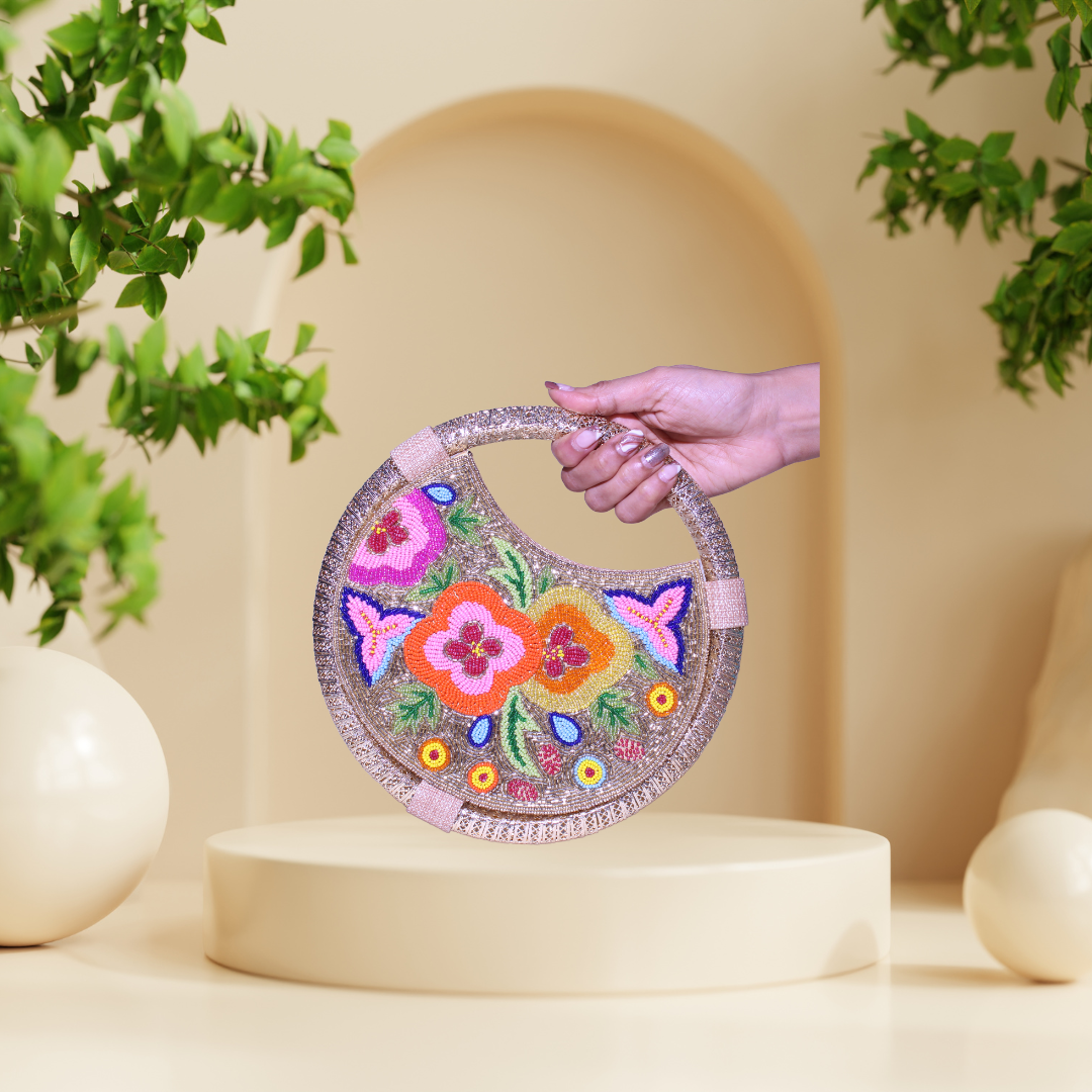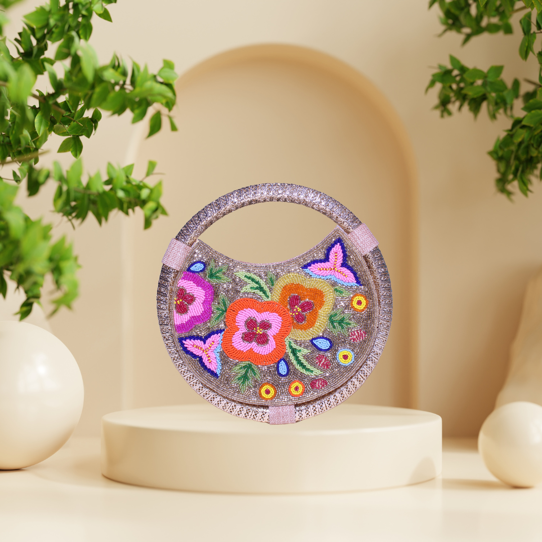 Introducing our stunning Floral Multicolour Seed Bead & Cut Dana Embroidered Ring Bag, a true masterpiece of artistry and elegance. This unique bag is adorned with intricate floral patterns, meticulously crafted from an array of vibrant seed beads and shimmering cut dana. The multicolour embroidery creates a breathtaking mosaic of colors, making this bag a standout accessory for any occasion. The bag features a distinctive ring handle, adding a touch of modern flair to its classic design. The handle allows for effortless carrying and can be comfortably worn on the wrist, providing both style and convenience. The compact yet spacious interior is perfect for holding your essentials, making it an ideal choice for evening events, weddings, and special celebrations.
