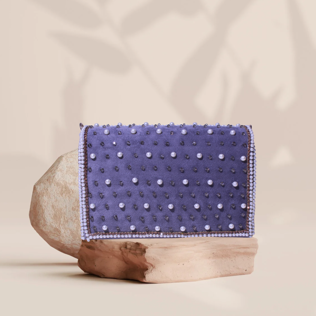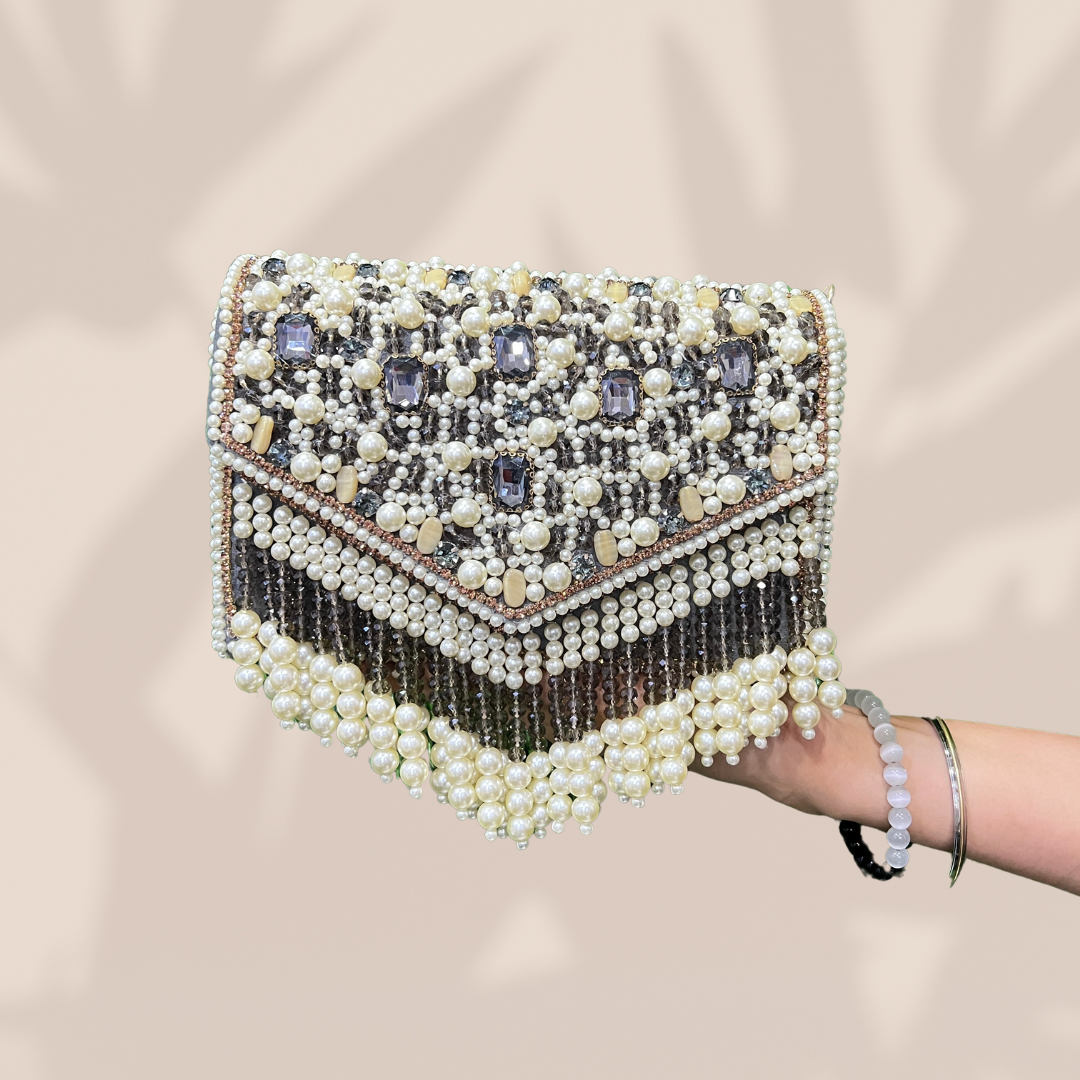 ndulge in the epitome of opulence with the Glamour Cascade Flap Box Bag, a masterclass in exquisite design and radiant elegance. This captivating accessory features a classic flap box shape, lavishly adorned with a combination of large and small pearls, dazzling diamonds, and sparkling crystals. Each element is meticulously placed to create a harmonious symphony of light and luxury.