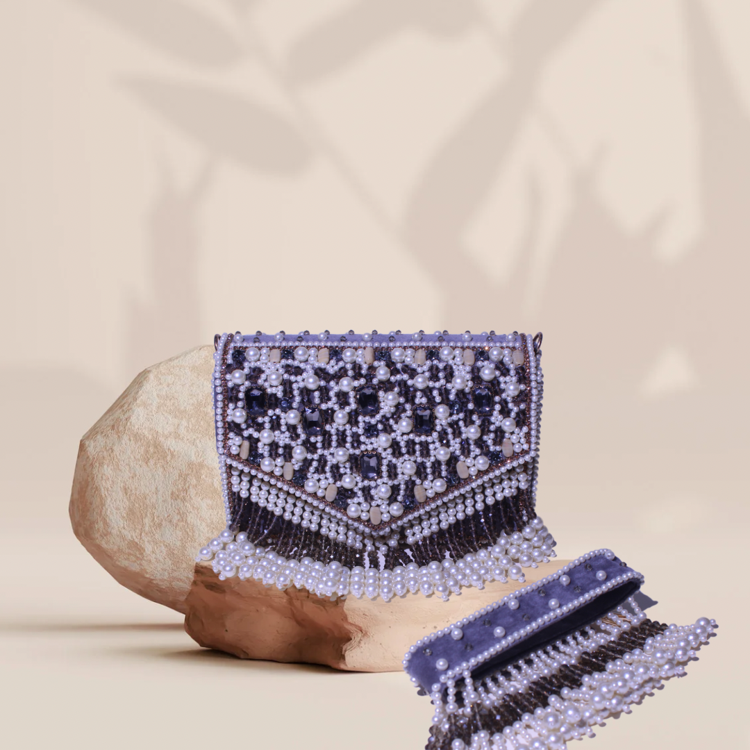 Adding to its allure are the long tassel hangings on the flap, crafted from pearls, crystals, and additional pearls, creating a dynamic and fluid movement. The beautiful wrist handle mirrors the intricate embroidery of the flap, adorned with long pearl tassel hangings that complete the look with grace.