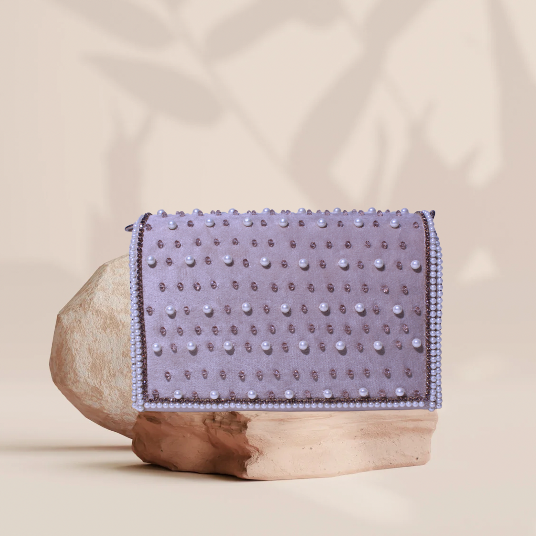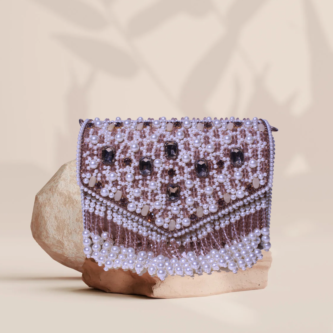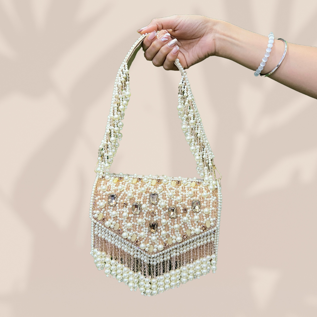 ndulge in the epitome of opulence with the Glamour Cascade Flap Box Bag, a masterclass in exquisite design and radiant elegance. This captivating accessory features a classic flap box shape, lavishly adorned with a combination of large and small pearls, dazzling diamonds, and sparkling crystals. Each element is meticulously placed to create a harmonious symphony of light and luxury.