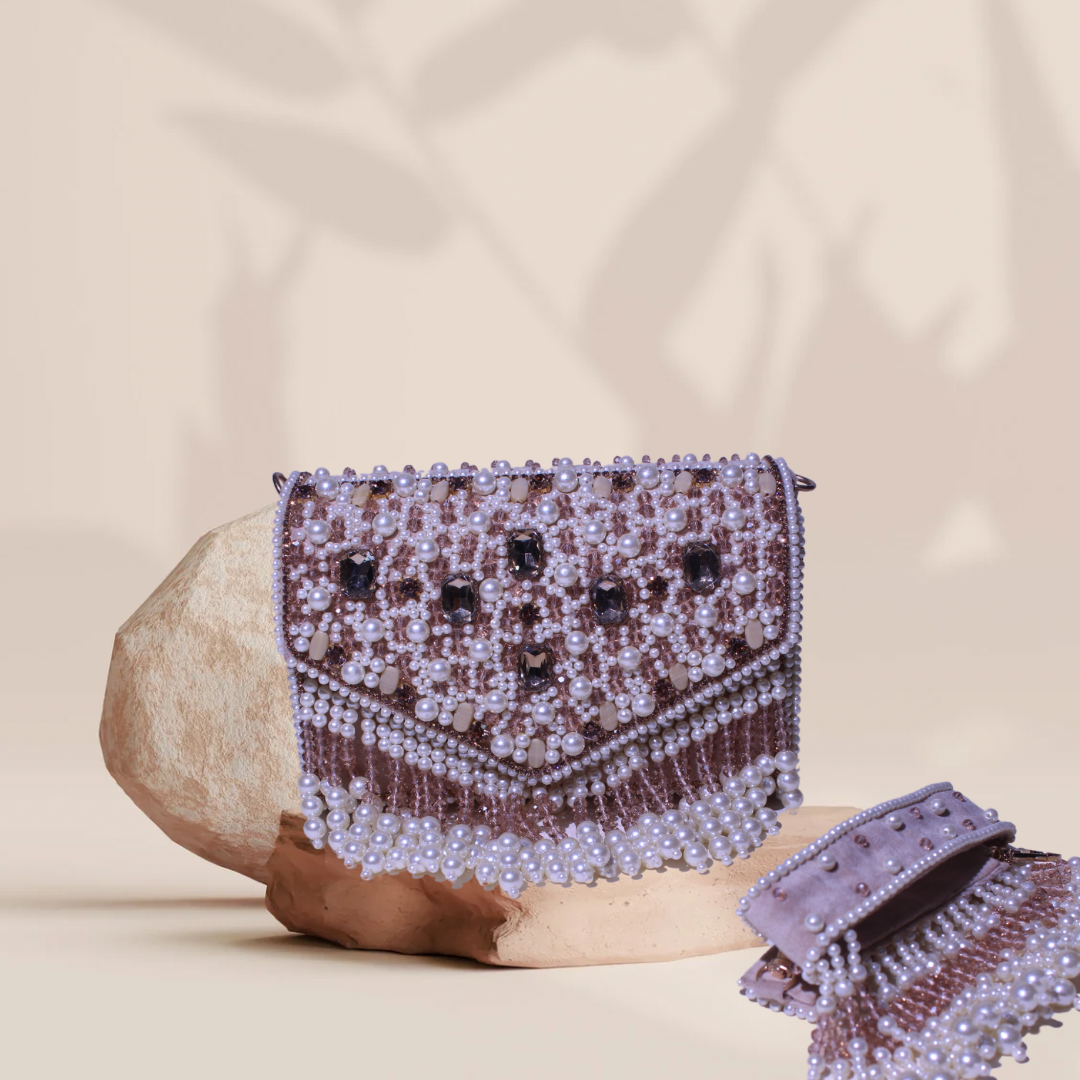 Adding to its allure are the long tassel hangings on the flap, crafted from pearls, crystals, and additional pearls, creating a dynamic and fluid movement. The beautiful wrist handle mirrors the intricate embroidery of the flap, adorned with long pearl tassel hangings that complete the look with grace.
