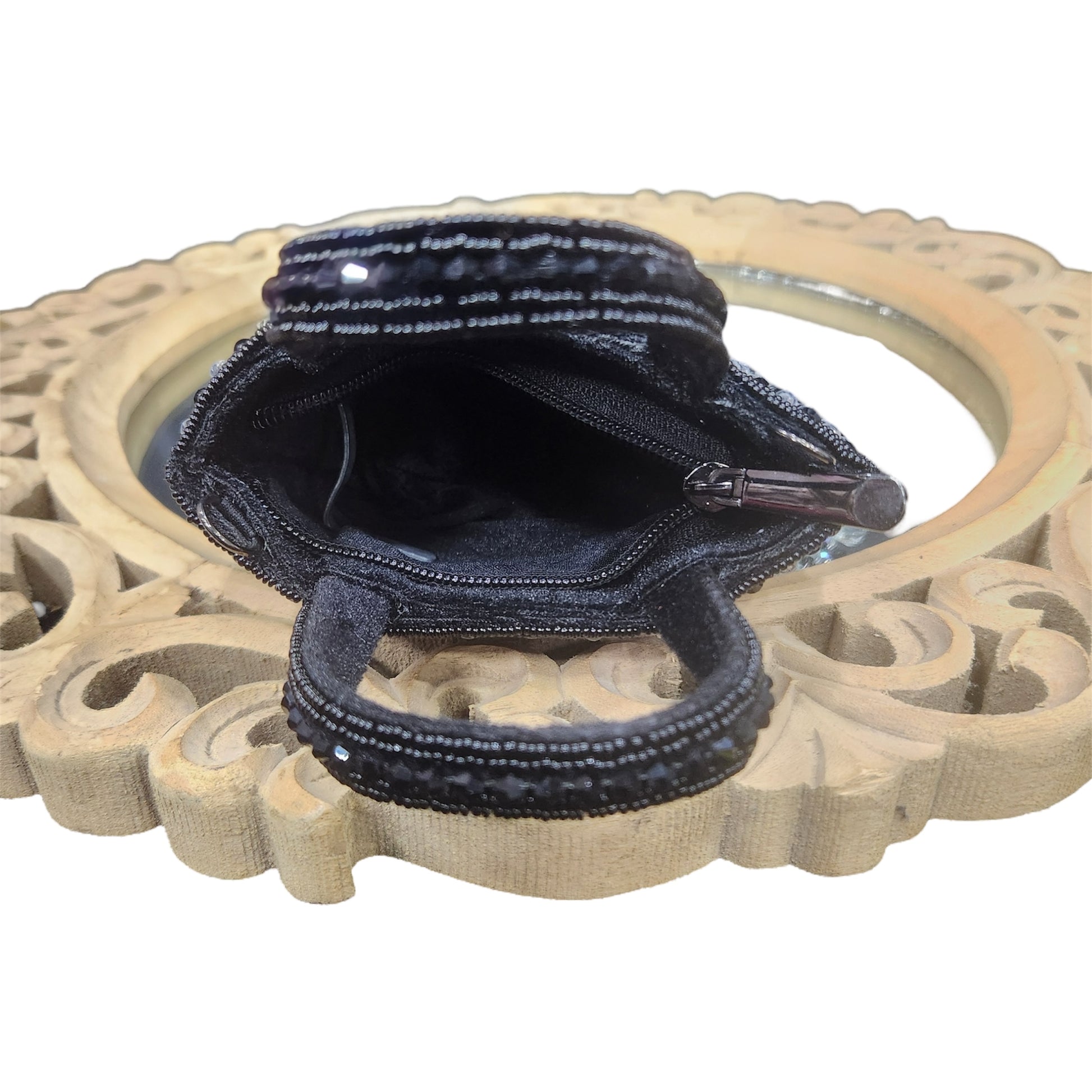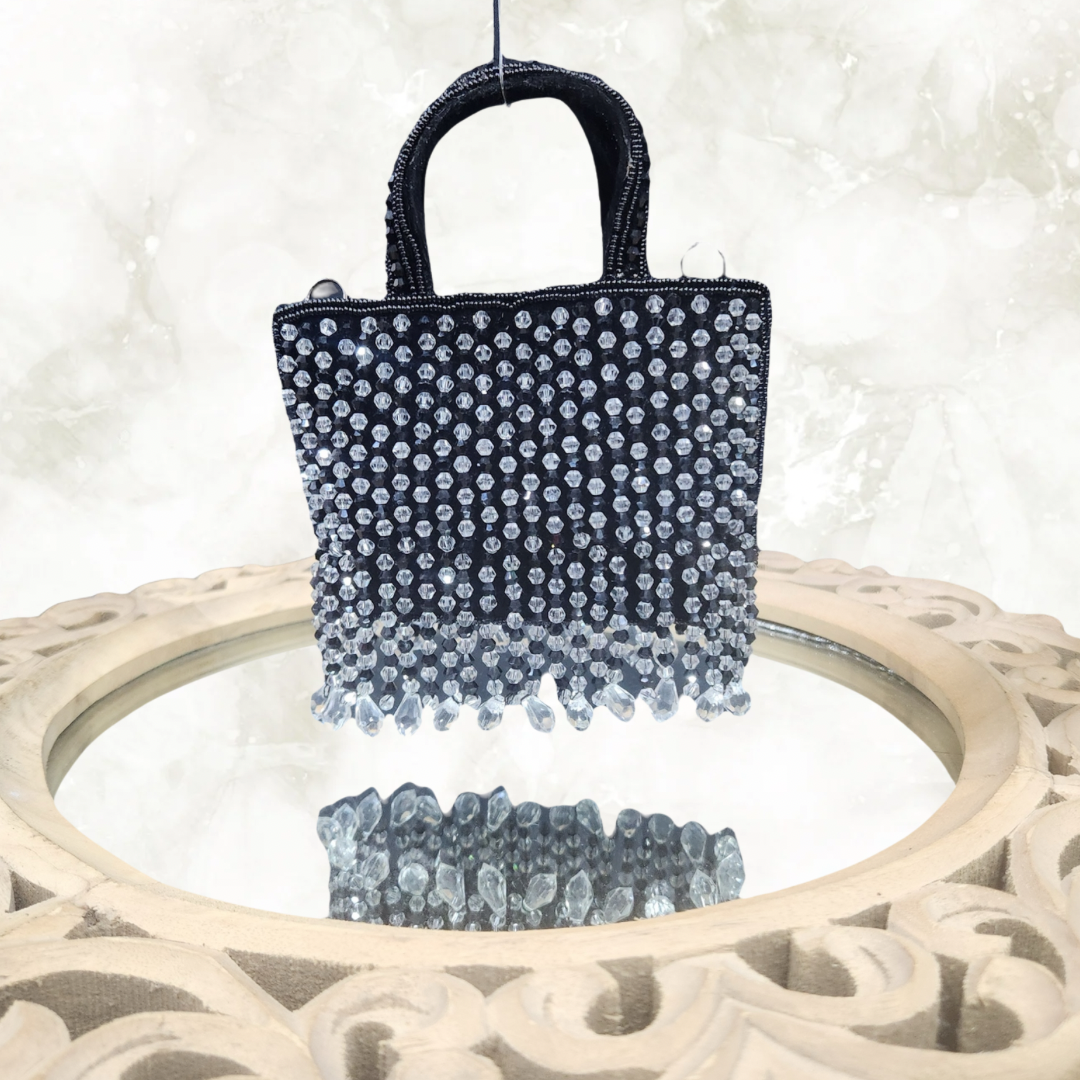 "Add a touch of sparkle to your outfit with this palm-sized mini bag, exquisitely adorned with glass crystal embroidery on both sides. The shimmering crystal tassel hangings add a playful yet elegant charm. Designed with a secure zip closure and a sleek sling chain, this lightweight and versatile bag is perfect for hands-free styling at parties, weddings, and festive occasions. Small in size but big on style, it’s your go-to accessory for effortless glam."