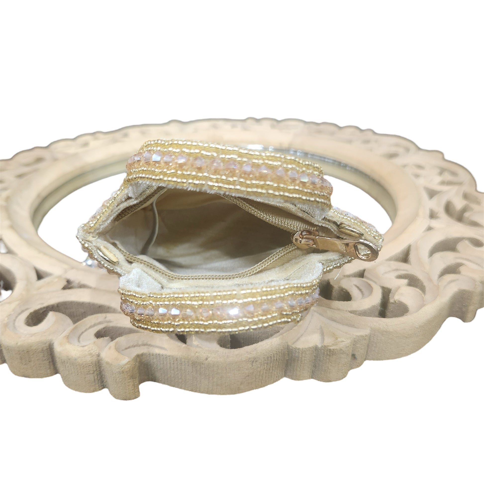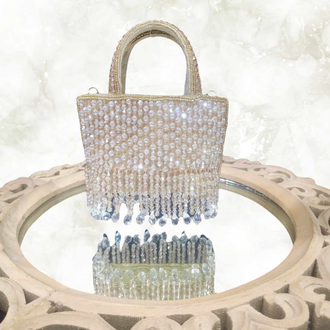 "Add a touch of sparkle to your outfit with this palm-sized mini bag, exquisitely adorned with glass crystal embroidery on both sides. The shimmering crystal tassel hangings add a playful yet elegant charm. Designed with a secure zip closure and a sleek sling chain, this lightweight and versatile bag is perfect for hands-free styling at parties, weddings, and festive occasions. Small in size but big on style, it’s your go-to accessory for effortless glam."