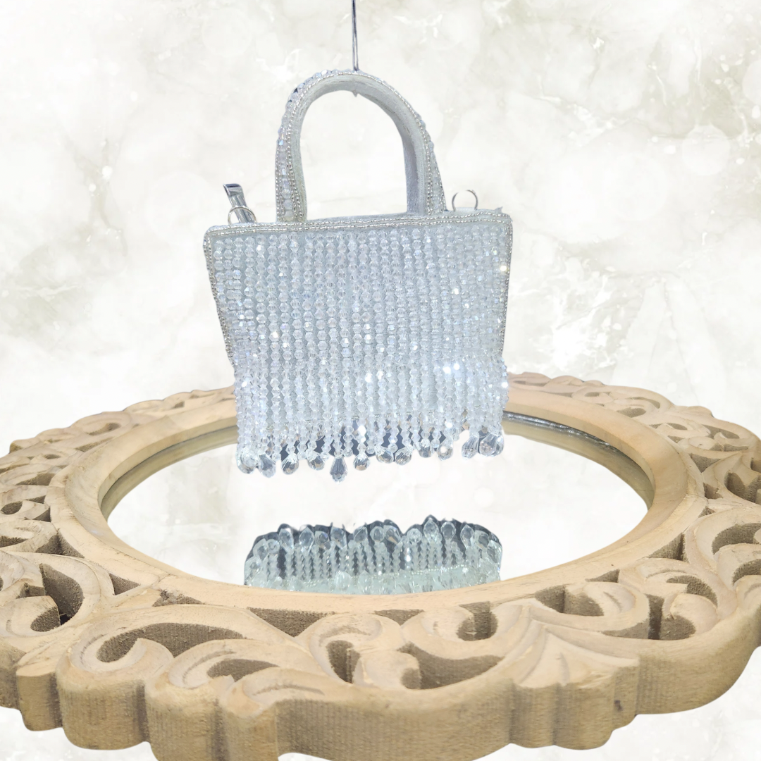 "Add a touch of sparkle to your outfit with this palm-sized mini bag, exquisitely adorned with glass crystal embroidery on both sides. The shimmering crystal tassel hangings add a playful yet elegant charm. Designed with a secure zip closure and a sleek sling chain, this lightweight and versatile bag is perfect for hands-free styling at parties, weddings, and festive occasions. Small in size but big on style, it’s your go-to accessory for effortless glam."