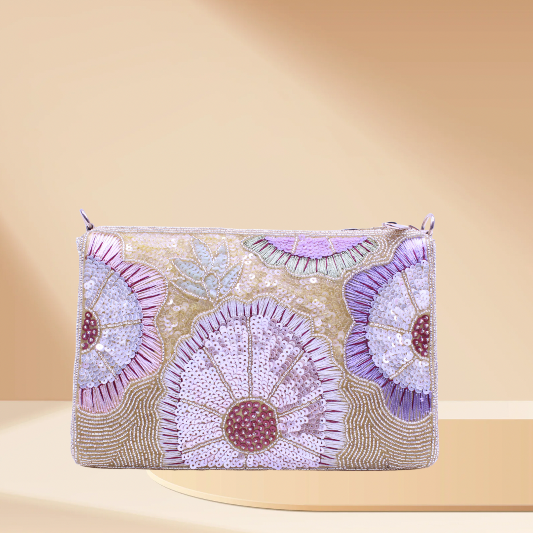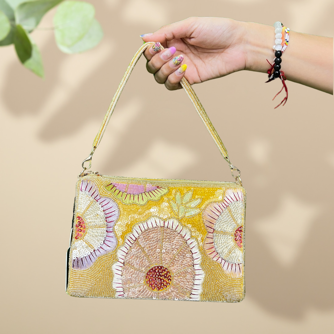 This vibrant bag is a celebration of intricate craftsmanship, adorned with colorful floral designs created using sequins, resham threads, and seed bead embroidery that covers the bag beautifully. It features a secure zip closure to keep your essentials safe, while the embroidered wrist handle adds an extra touch of elegance and functionality. Perfect for weddings, festive celebrations, or any special occasion, this bag effortlessly combines charm, color, and practicality, making it a standout accessory for your ensemble.