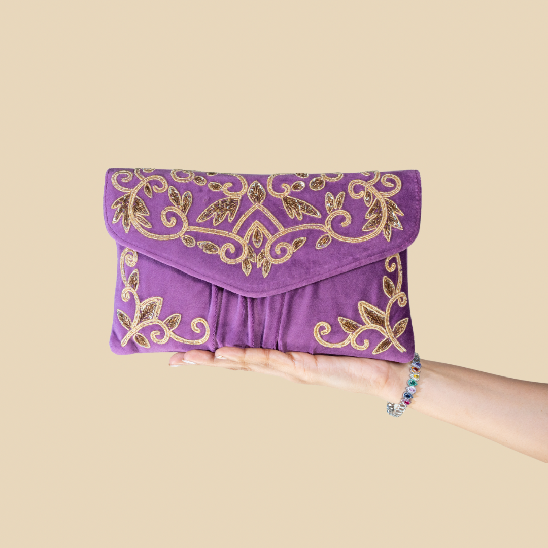 Discover the epitome of elegance with our Golden Elegance Envelope Clutch. This exquisite Velvet flap envelope style clutch showcases a stunning combination of golden kora, jardozi, and sequin handwork, meticulously crafted to create a luxurious and eye-catching design. The intricate detailing of golden kora adds a touch of opulence, while the jardozi work brings a royal charm to the clutch. The shimmering sequins enhance the overall design, adding a dazzling sparkle that catches the light with every movement. The envelope style flap closure adds a contemporary twist to this classic design, offering a secure and stylish way to carry your essentials. Whether you're attending a formal event or a special occasion, this Golden Elegance Envelope Clutch is sure to elevate your look and make a statement. It has an inner zip pocket inside & a zip pocket on the back, comes with a detachable sling chain, this bag is perfect for any occasion. This collectible statement accessory fits in your valuables like makeup, keys, currency and cards.