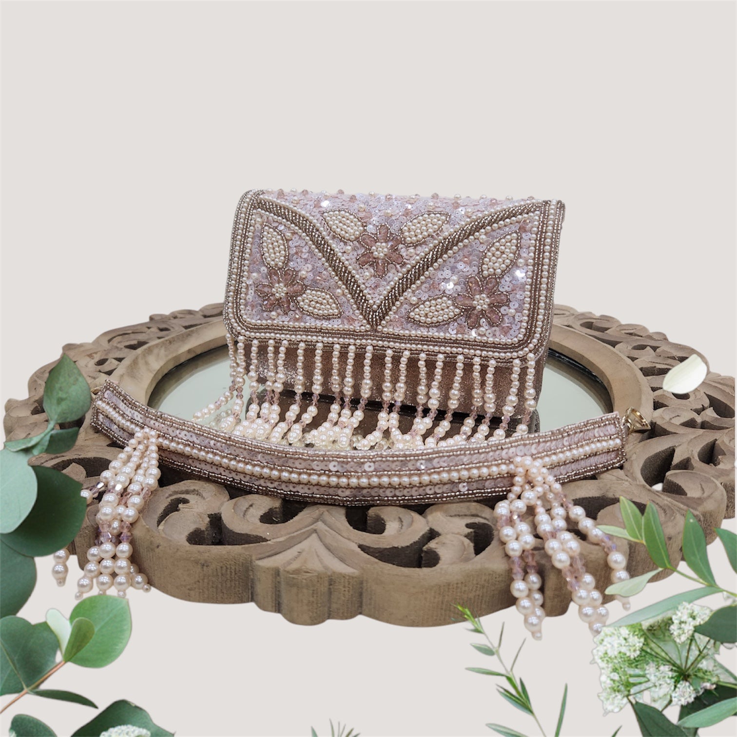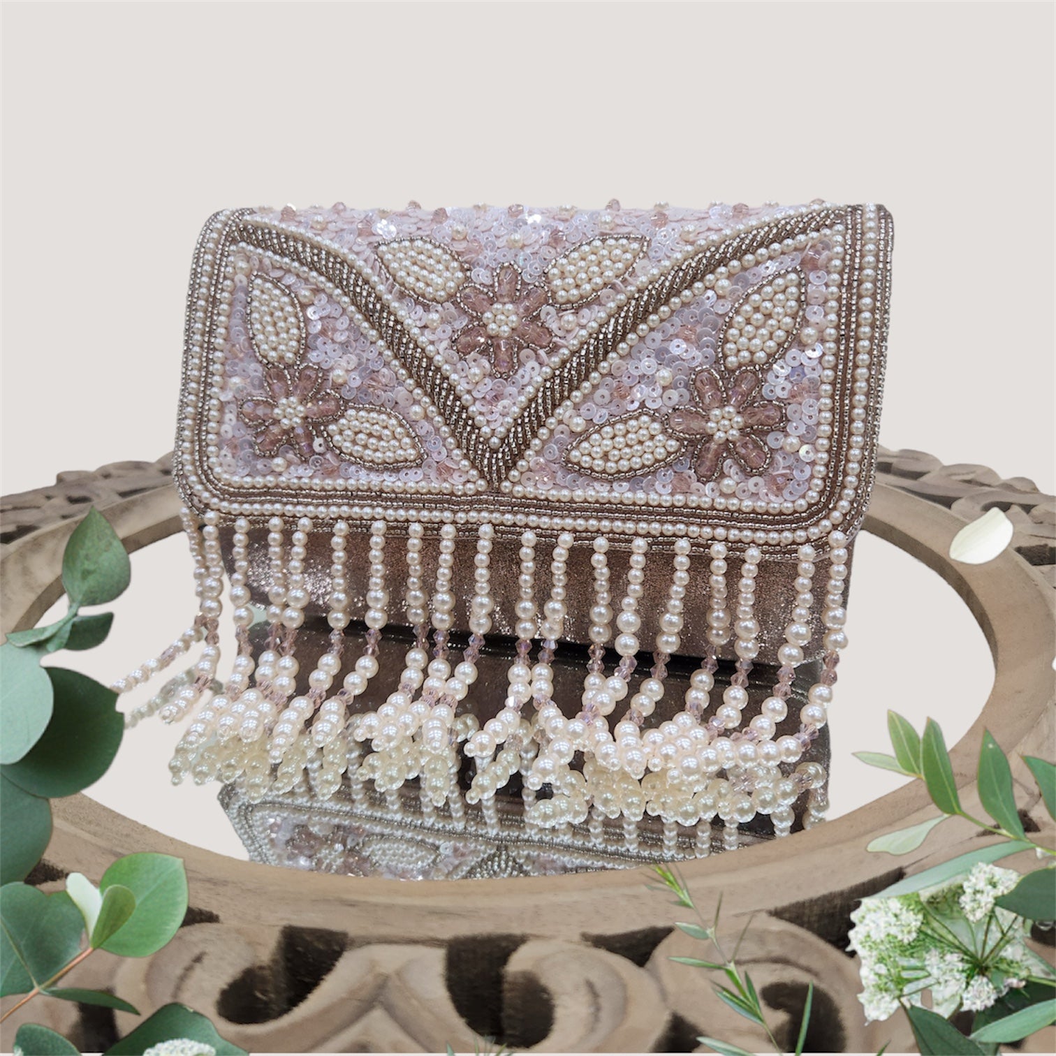 Add a touch of elegance with Gulbahaar Flapover Clutch, featuring shiny sequins, pearl, and crystal hand embroidery in delicate flower and leaf motifs. The flap is adorned with pearl and crystal tassels, while the embroidered wrist handle with tassels on both ends adds a graceful finish. Perfect for weddings and festive soirées!