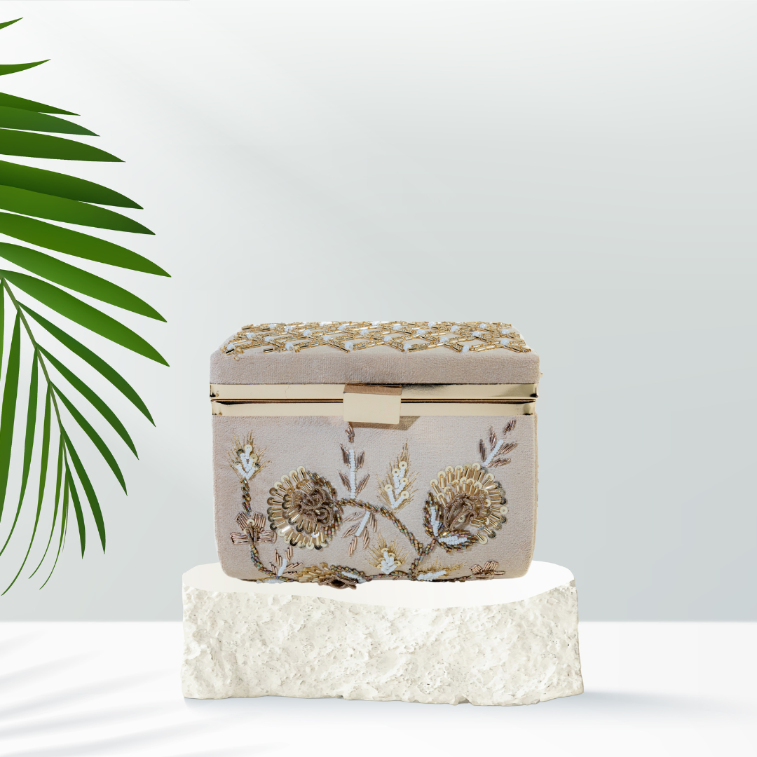 "Introducing the Heritage Matka Box Clutch, an exquisite blend of traditional craftsmanship and contemporary elegance. This stunning clutch features intricate jardozi handwork, beautifully embellished with white seed beads and kar dana on the front and sides. The top showcases a chic-chec pattern, skillfully crafted with pony beads, seed beads, and kar dana, adding a touch of sophistication. Each element is meticulously hand-embroidered, reflecting the rich heritage and artistry of traditional Indian craftsmanship. The compact yet spacious interior is perfect for carrying your essentials, making it ideal for special occasions or festive events. Elevate your ensemble with the Heritage Matka Box Clutch, a timeless accessory that embodies elegance and cultural heritage."