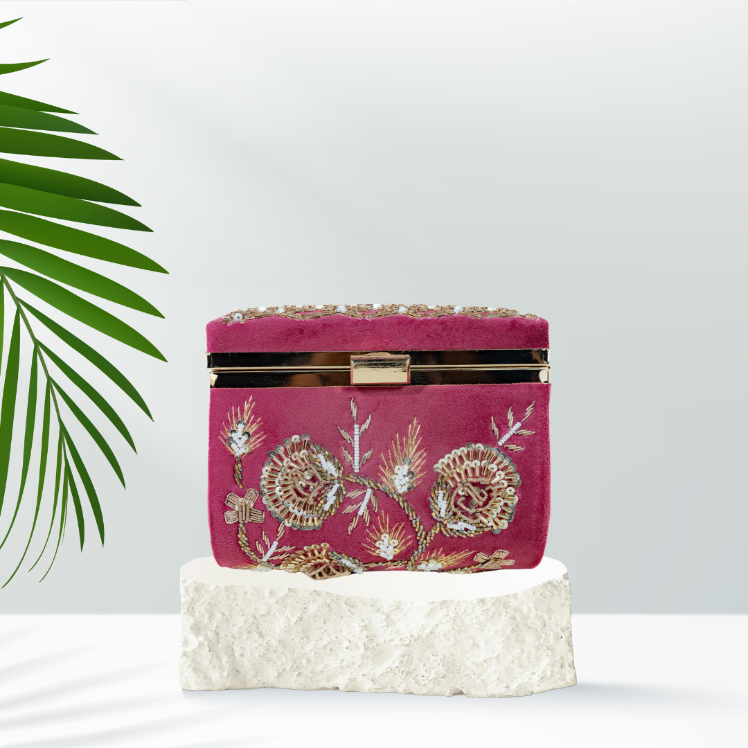 "Introducing the Heritage Matka Box Clutch, an exquisite blend of traditional craftsmanship and contemporary elegance. This stunning clutch features intricate jardozi handwork, beautifully embellished with white seed beads and kar dana on the front and sides. The top showcases a chic-chec pattern, skillfully crafted with pony beads, seed beads, and kar dana, adding a touch of sophistication. Each element is meticulously hand-embroidered, reflecting the rich heritage and artistry of traditional Indian craftsmanship. The compact yet spacious interior is perfect for carrying your essentials, making it ideal for special occasions or festive events. Elevate your ensemble with the Heritage Matka Box Clutch, a timeless accessory that embodies elegance and cultural heritage."