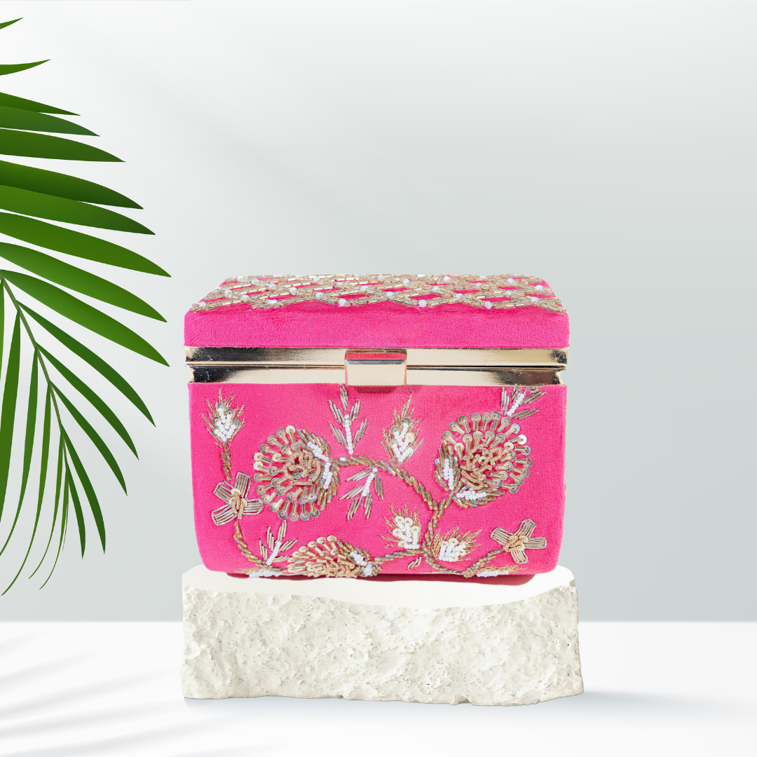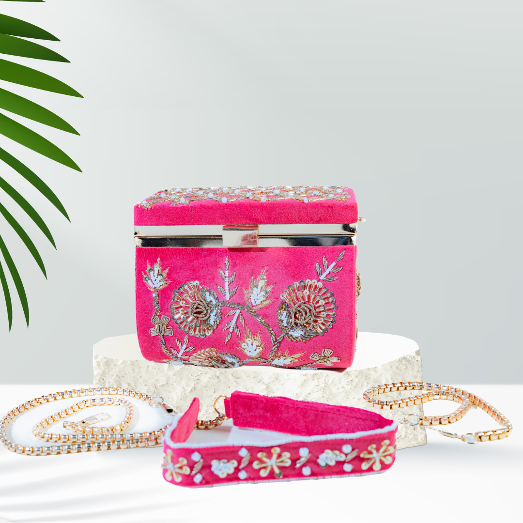 "Introducing the Heritage Matka Box Clutch, an exquisite blend of traditional craftsmanship and contemporary elegance. This stunning clutch features intricate jardozi handwork, beautifully embellished with white seed beads and kar dana on the front and sides. The top showcases a chic-chec pattern, skillfully crafted with pony beads, seed beads, and kar dana, adding a touch of sophistication. Each element is meticulously hand-embroidered, reflecting the rich heritage and artistry of traditional Indian craftsmanship. The compact yet spacious interior is perfect for carrying your essentials, making it ideal for special occasions or festive events. Elevate your ensemble with the Heritage Matka Box Clutch, a timeless accessory that embodies elegance and cultural heritage."