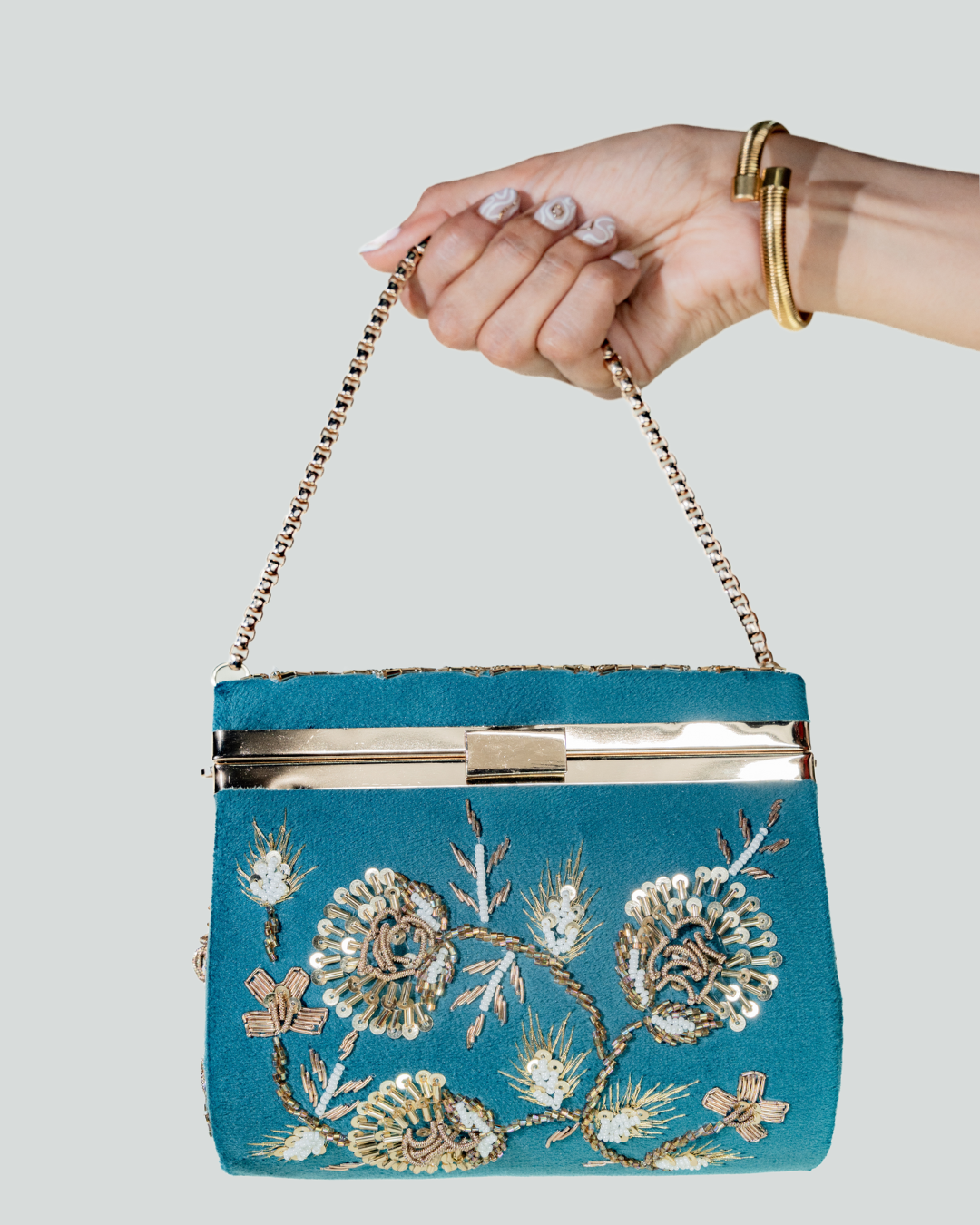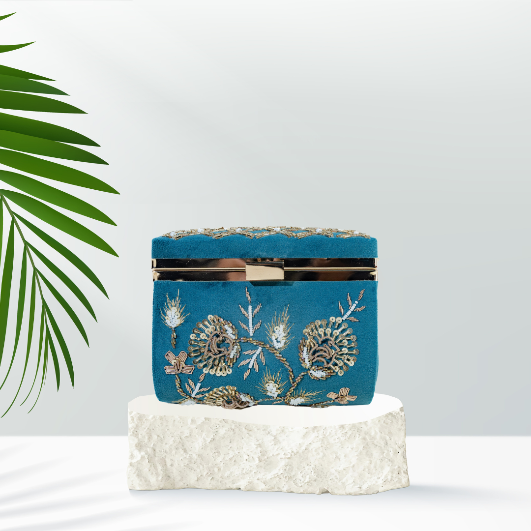 "Introducing the Heritage Matka Box Clutch, an exquisite blend of traditional craftsmanship and contemporary elegance. This stunning clutch features intricate jardozi handwork, beautifully embellished with white seed beads and kar dana on the front and sides. The top showcases a chic-chec pattern, skillfully crafted with pony beads, seed beads, and kar dana, adding a touch of sophistication. Each element is meticulously hand-embroidered, reflecting the rich heritage and artistry of traditional Indian craftsmanship. The compact yet spacious interior is perfect for carrying your essentials, making it ideal for special occasions or festive events. Elevate your ensemble with the Heritage Matka Box Clutch, a timeless accessory that embodies elegance and cultural heritage."