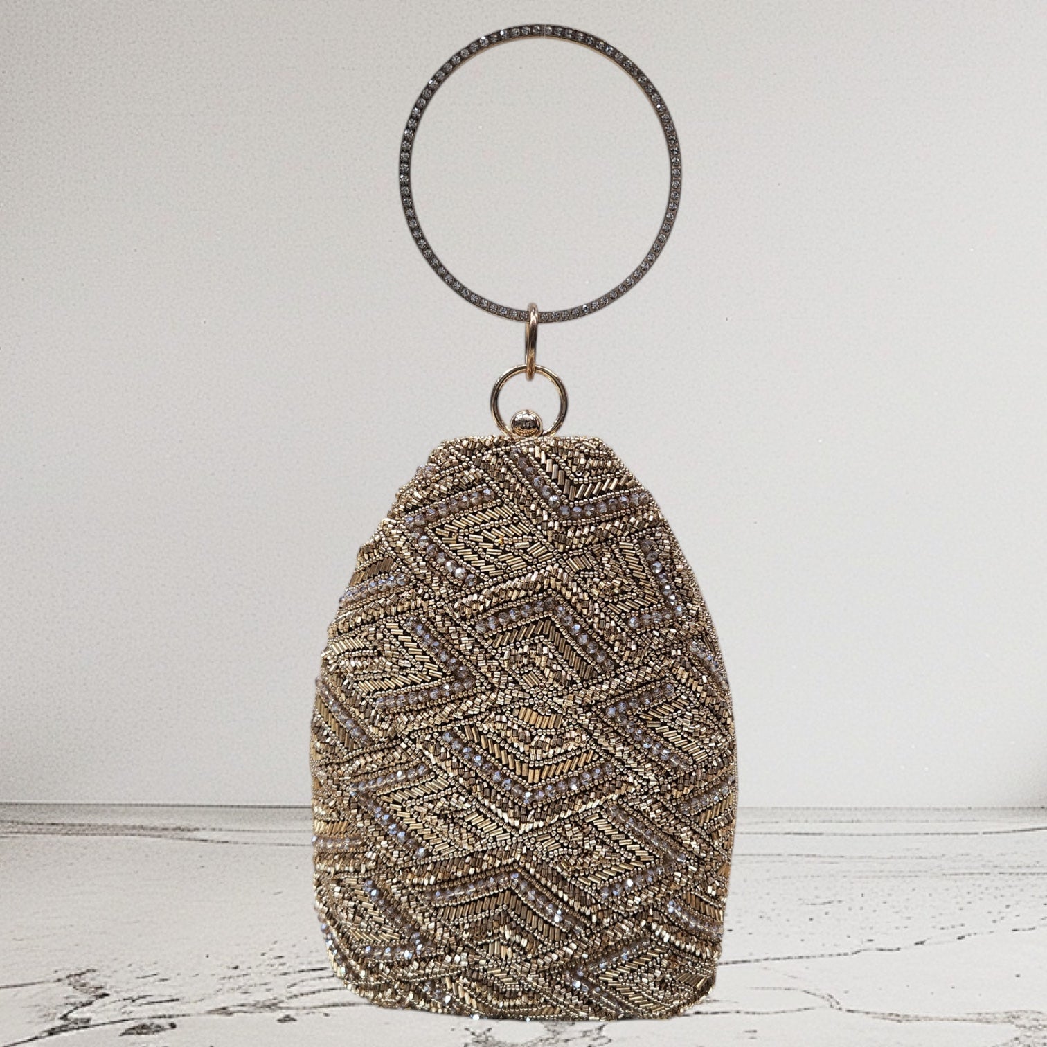A modern classic crafted for festive elegance. This clutch features intricate hand embroidery using seed beads, kardana, and crystals in a striking geometric pattern. The sturdy ring handle adds a touch of sophistication, while a detachable sling chain offers versatile styling. Thoughtfully designed with a soft lining and an inside pocket to keep your essentials organized.