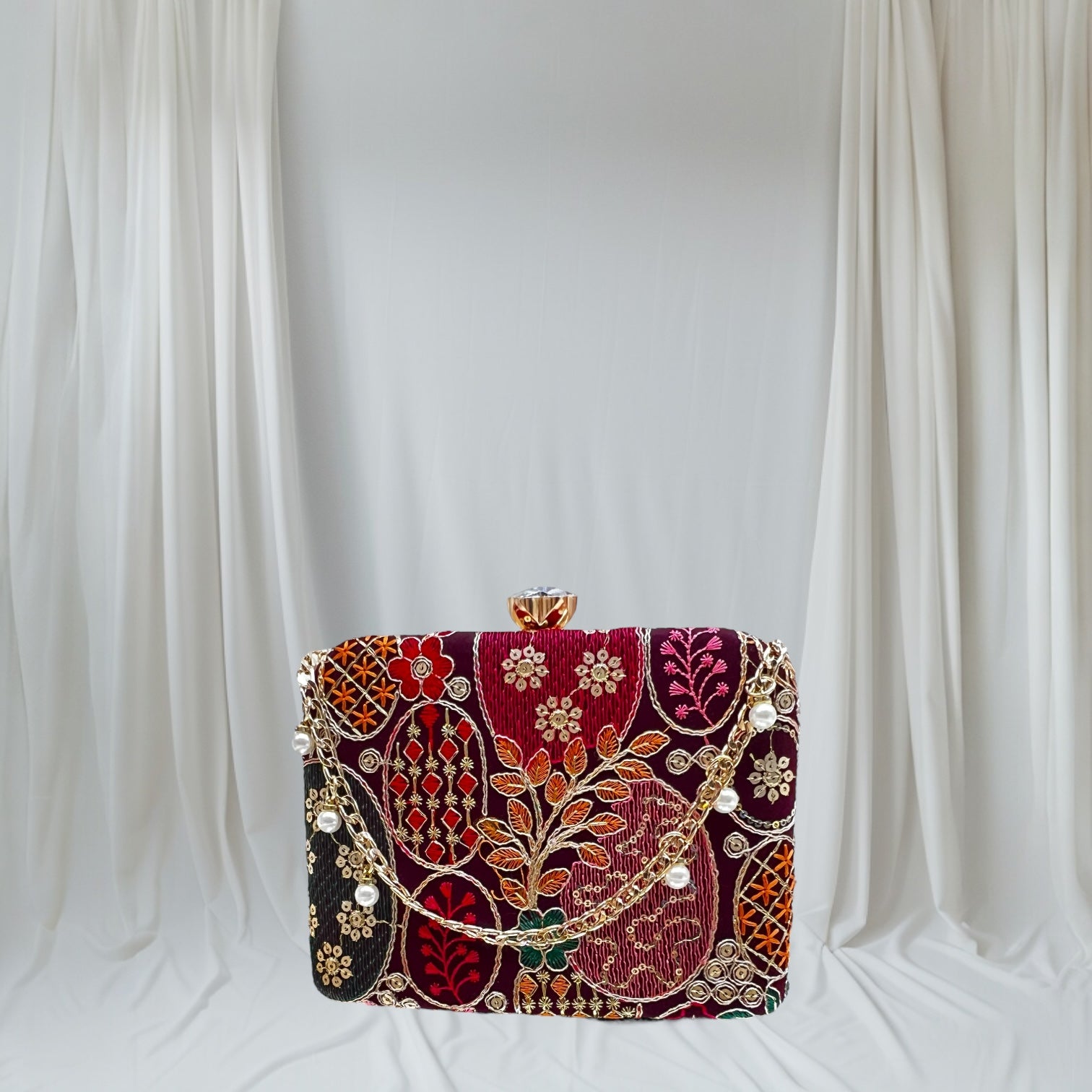 Add a regal touch to your ensemble with our intricately crafted box clutch. Featuring rich thread embroidery, embellished detailing, and a structured silhouette, this clutch is the perfect blend of traditional elegance and contemporary chic. The compact design is ideal for carrying your essentials in style, while the sturdy metal frame, crystal clasp, and detachable chain handle offer both grace and functionality.