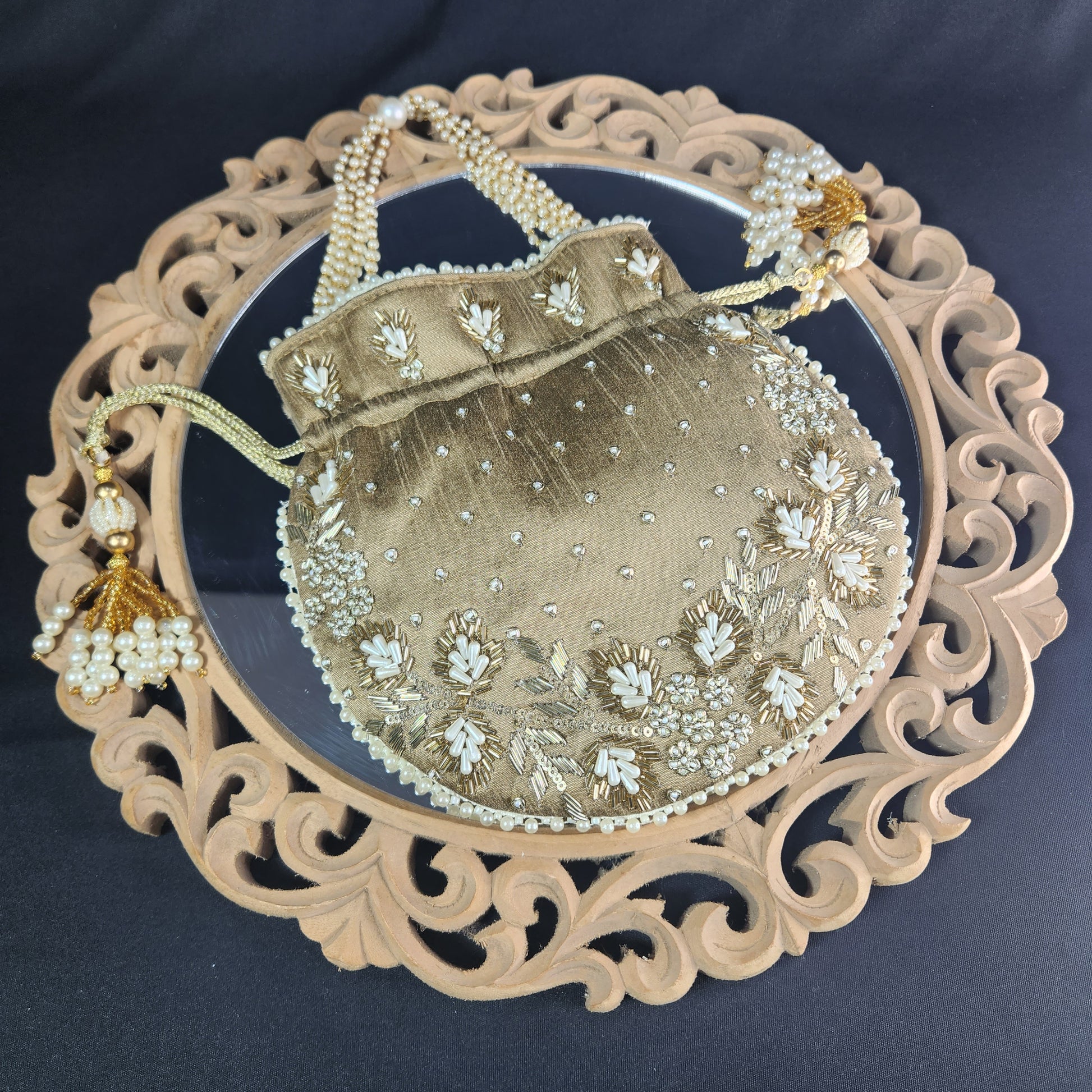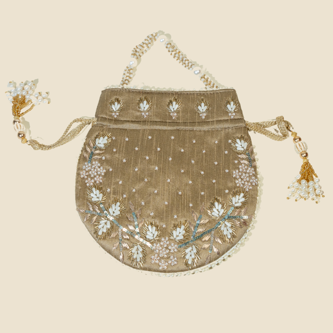 "Embrace the majestic beauty of our Jodha Potli. Crafted from premium raw silk, this exquisite potli features intricate hand embroidery with pearls, seed beads, kora, and jardozi, showcasing the rich heritage of Indian craftsmanship. The seed bead handle adds a touch of glamour, making it a luxurious addition to your accessory collection. The raw silk fabric offers a soft, plush texture that is a delight to touch, enhancing the bag’s luxurious feel. The drawstring closure, adorned with beautiful beaded tassels, ensures your belongings are secure, while the spacious interior provides ample space for your essentials. Perfect for special occasions, weddings, or festive celebrations, this potli combines elegance and functionality. Elevate your accessory collection with the Jodha Potli, a symbol of elegance and rich craftsmanship that adds a touch of luxury to any occasion.”