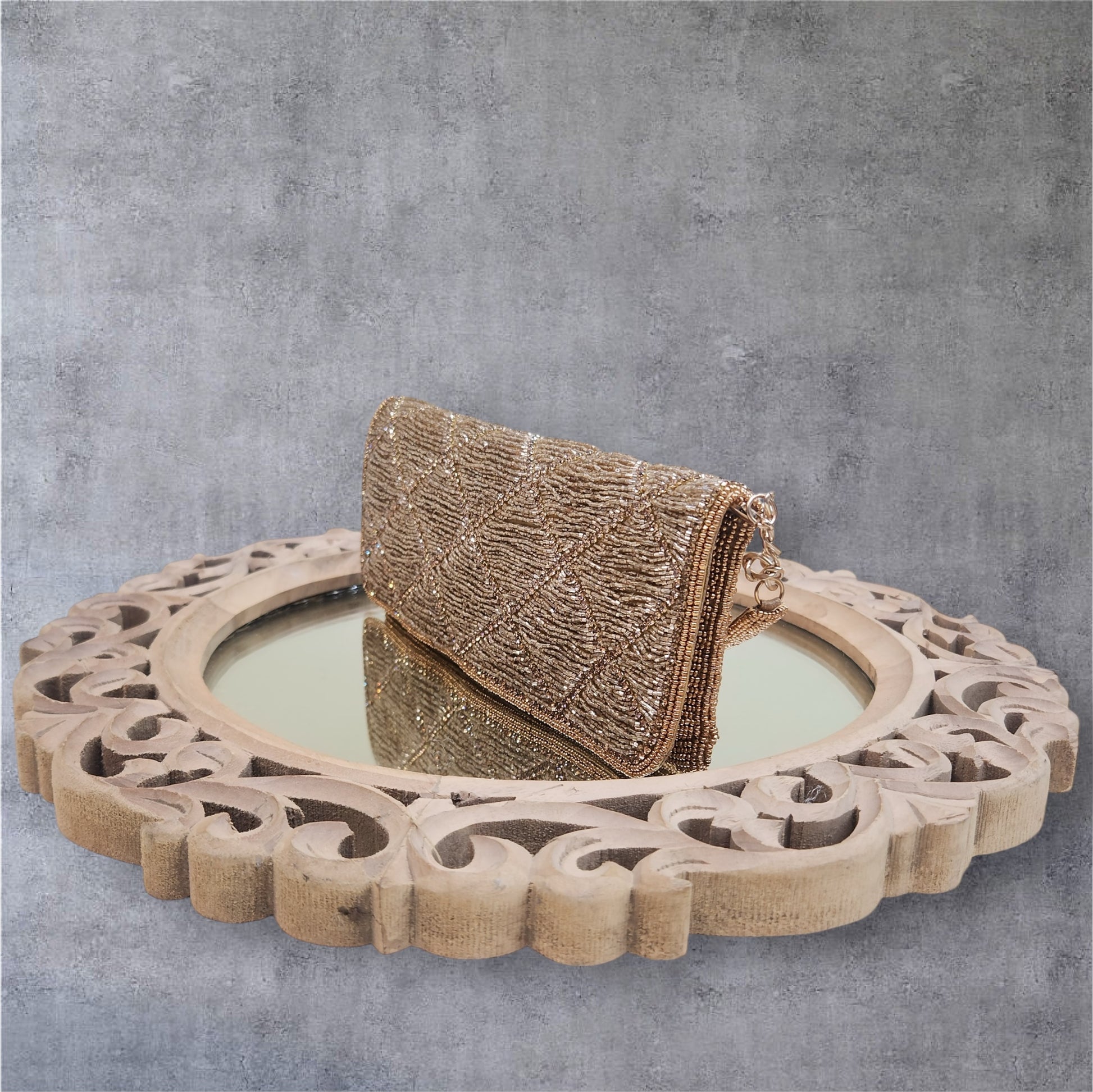 This sleek flap bag is a celebration of handcrafted beauty, adorned with intricate kardana beadwork in a classic geometric pattern. Fully covered in delicate seed bead embroidery, its elongated silhouette and shimmering finish make it a refined accessory for weddings, festive occasions, and elegant soirées. Comes with a comfortable Shoulder handle and detachable chain strap —giving you the freedom to style it your way. It's the ideal piece to elevate both Indian and contemporary outfits with effortless grace.