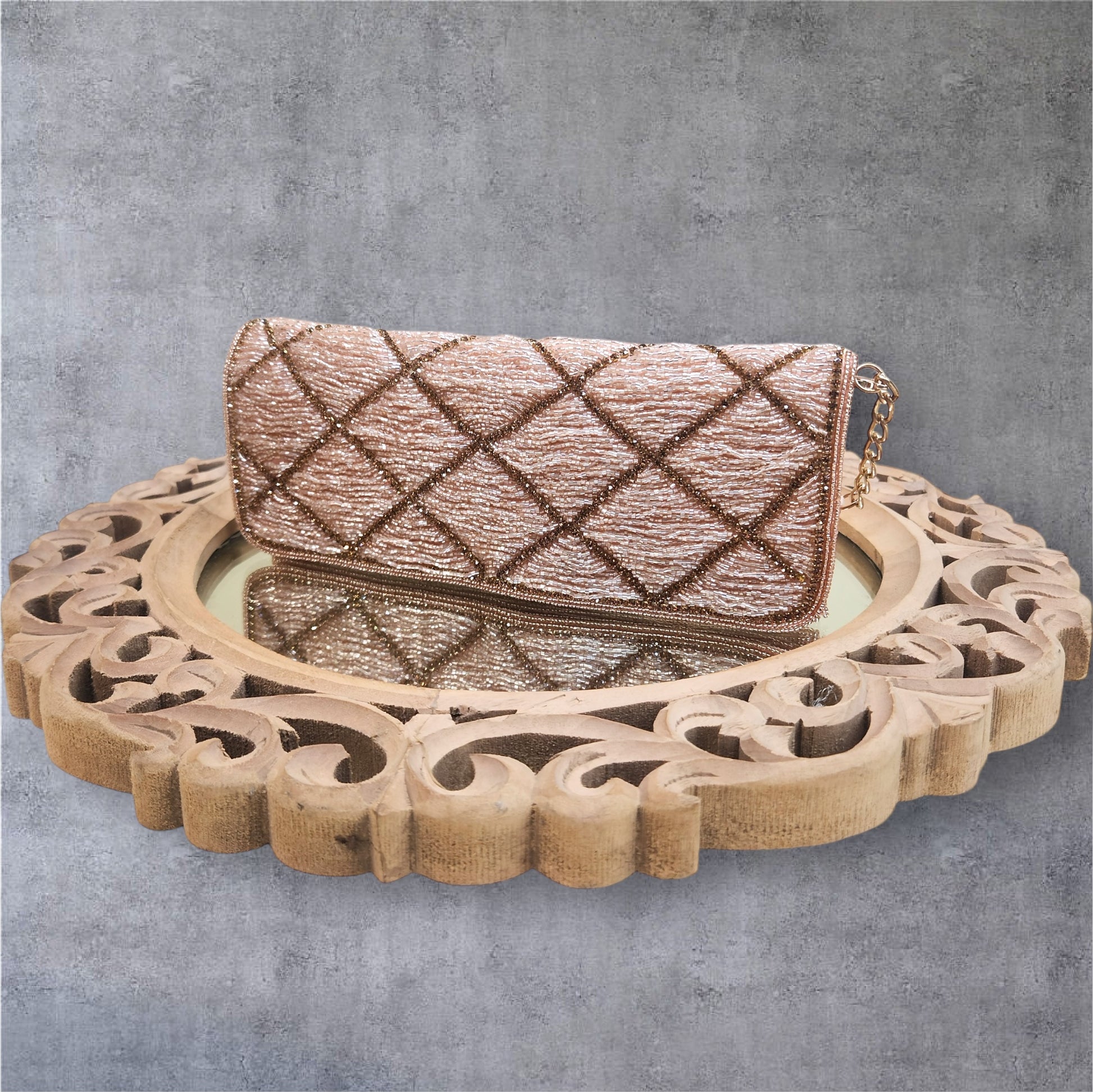 This sleek flap bag is a celebration of handcrafted beauty, adorned with intricate kardana beadwork in a classic geometric pattern. Fully covered in delicate seed bead embroidery, its elongated silhouette and shimmering finish make it a refined accessory for weddings, festive occasions, and elegant soirées. Comes with a comfortable Shoulder handle and detachable chain strap —giving you the freedom to style it your way. It's the ideal piece to elevate both Indian and contemporary outfits with effortless grace.