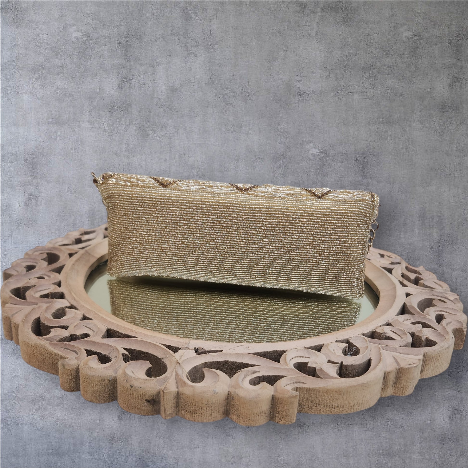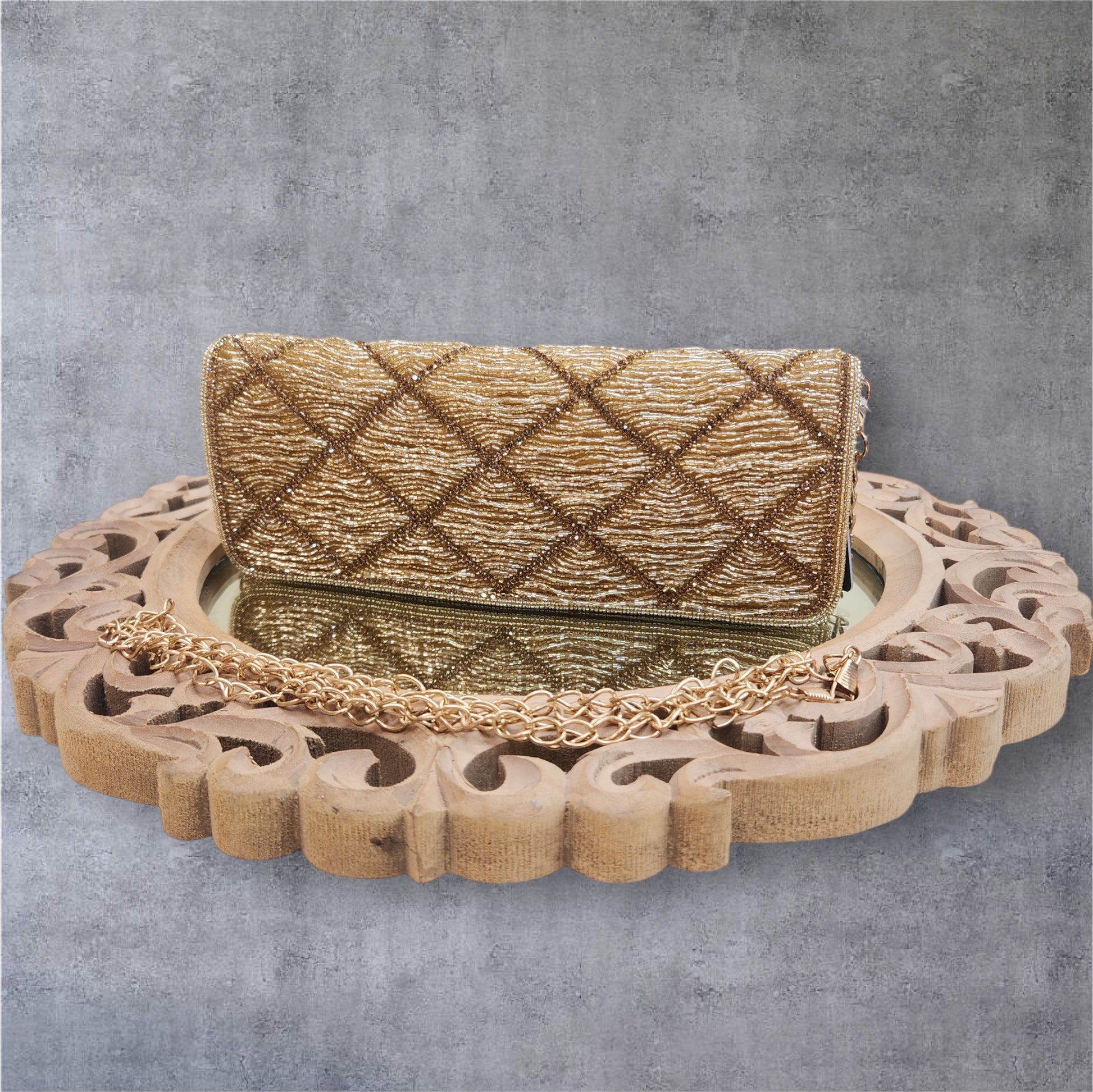 This sleek flap bag is a celebration of handcrafted beauty, adorned with intricate kardana beadwork in a classic geometric pattern. Fully covered in delicate seed bead embroidery, its elongated silhouette and shimmering finish make it a refined accessory for weddings, festive occasions, and elegant soirées. Comes with a comfortable Shoulder handle and detachable chain strap —giving you the freedom to style it your way. It's the ideal piece to elevate both Indian and contemporary outfits with effortless grace.