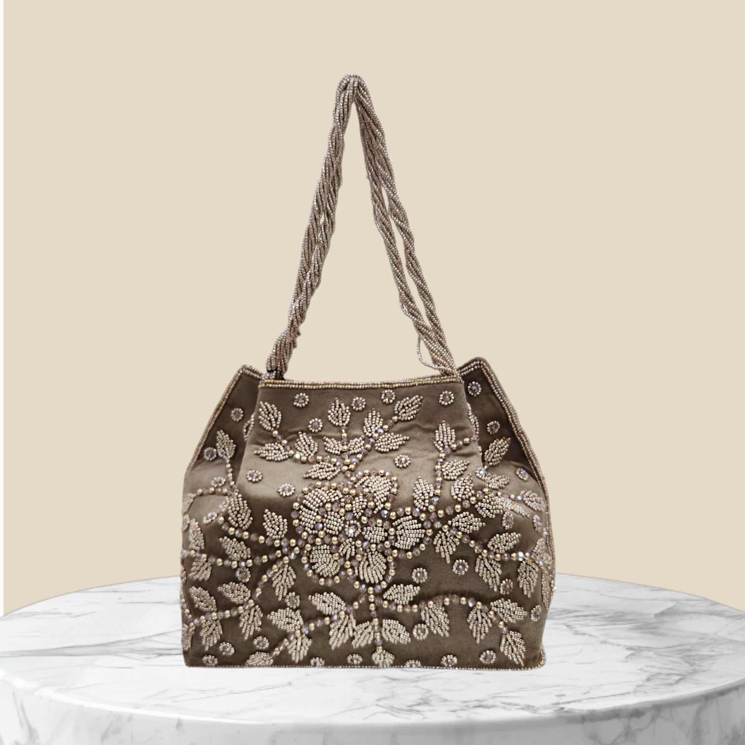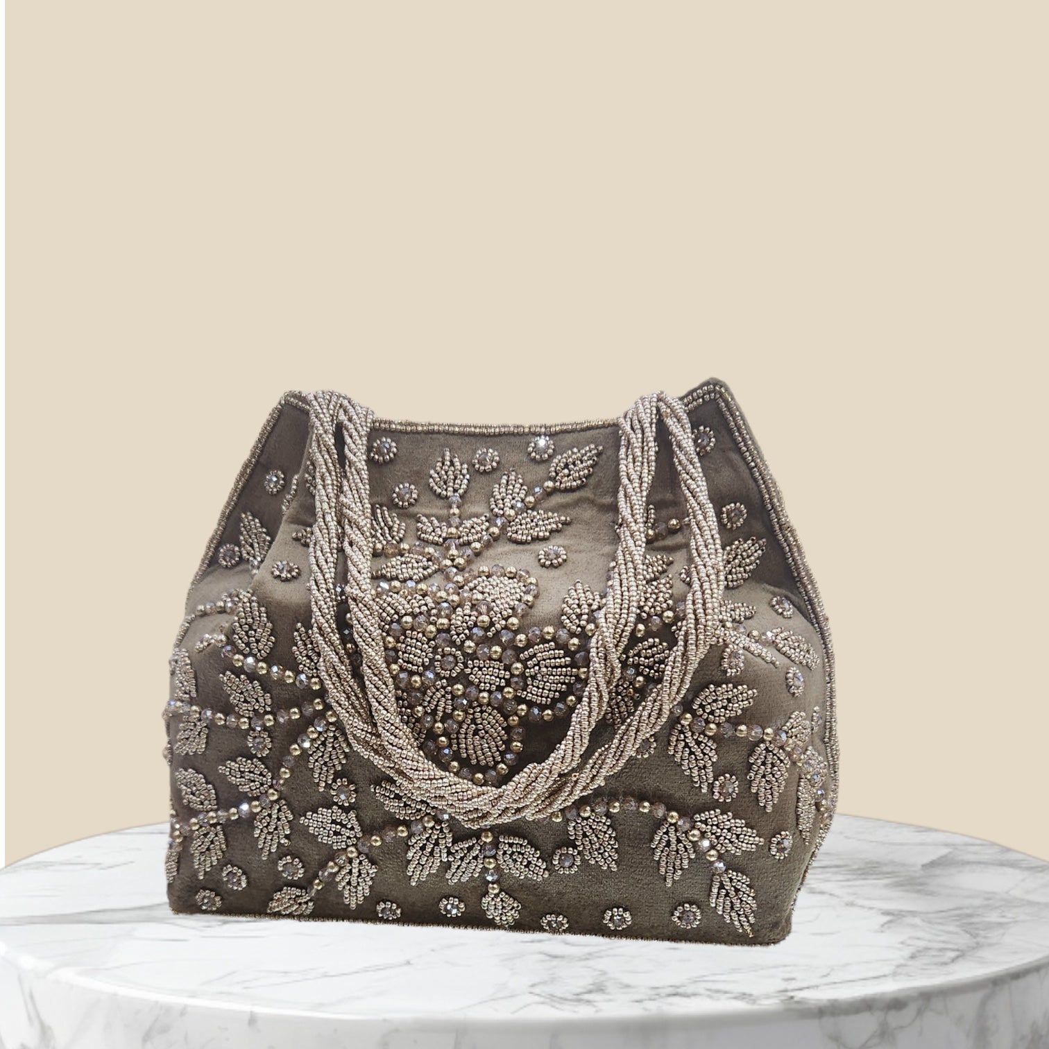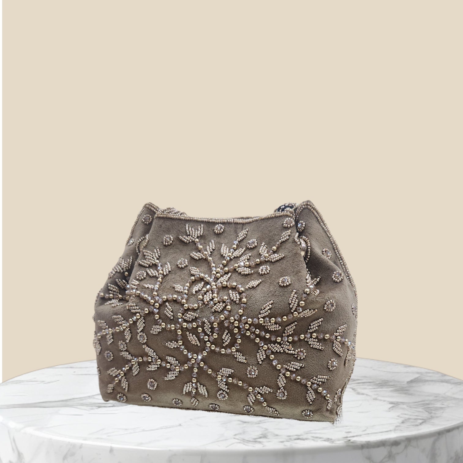 Elegant and timeless, the Kanaklata Potli is crafted on rich velvet and adorned with intricate seed bead and bugle bead embroidery on both sides, forming graceful floral and leaf patterns. The 3-magnet closure offers a sleek, seamless finish, while the handcrafted seed bead wrist handle adds a touch of delicate charm. A perfect blend of luxury and tradition, this potli is designed to elevate your look at weddings, festive occasions, and evening gatherings.