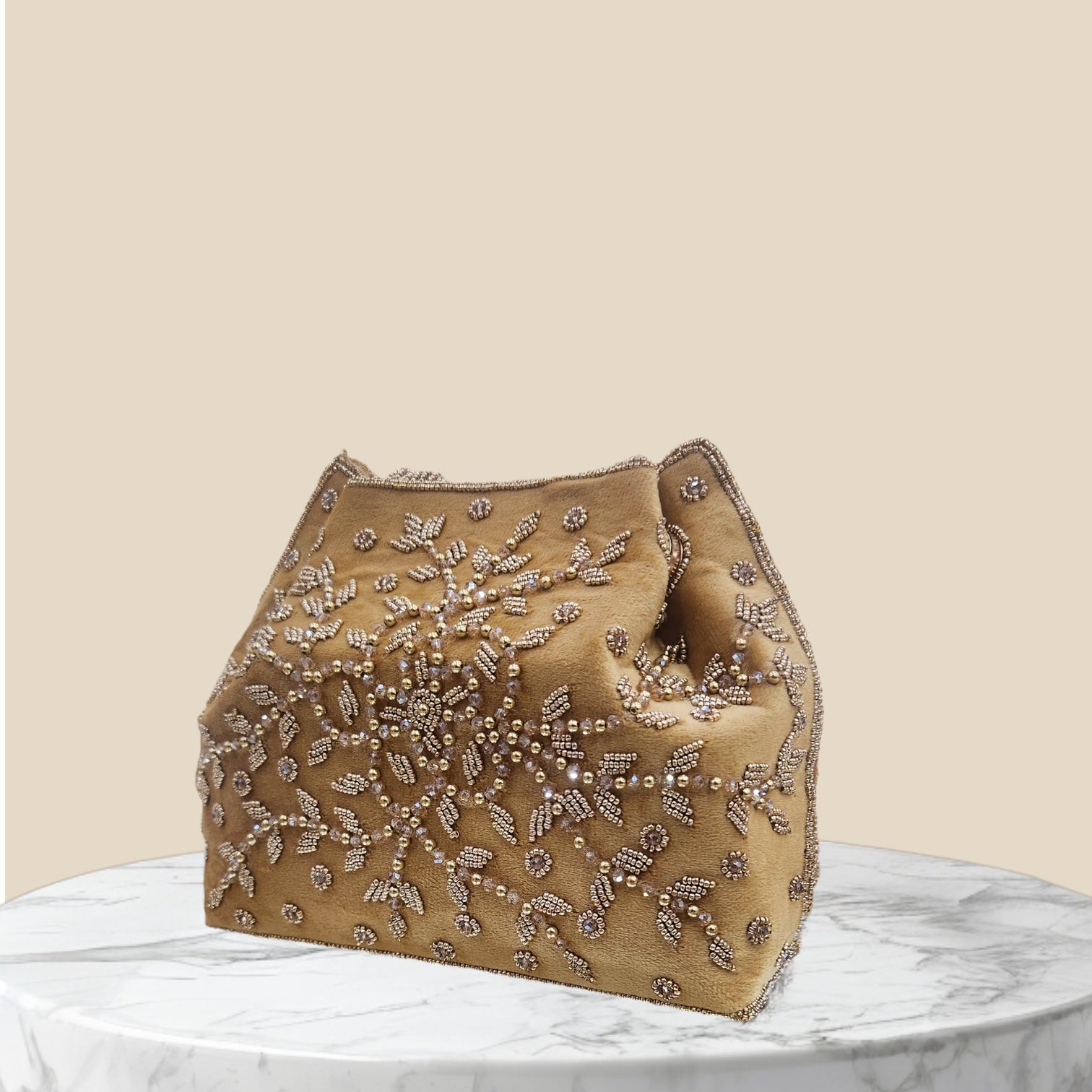 Elegant and timeless, the Kanaklata Potli is crafted on rich velvet and adorned with intricate seed bead and bugle bead embroidery on both sides, forming graceful floral and leaf patterns. The 3-magnet closure offers a sleek, seamless finish, while the handcrafted seed bead wrist handle adds a touch of delicate charm. A perfect blend of luxury and tradition, this potli is designed to elevate your look at weddings, festive occasions, and evening gatherings.