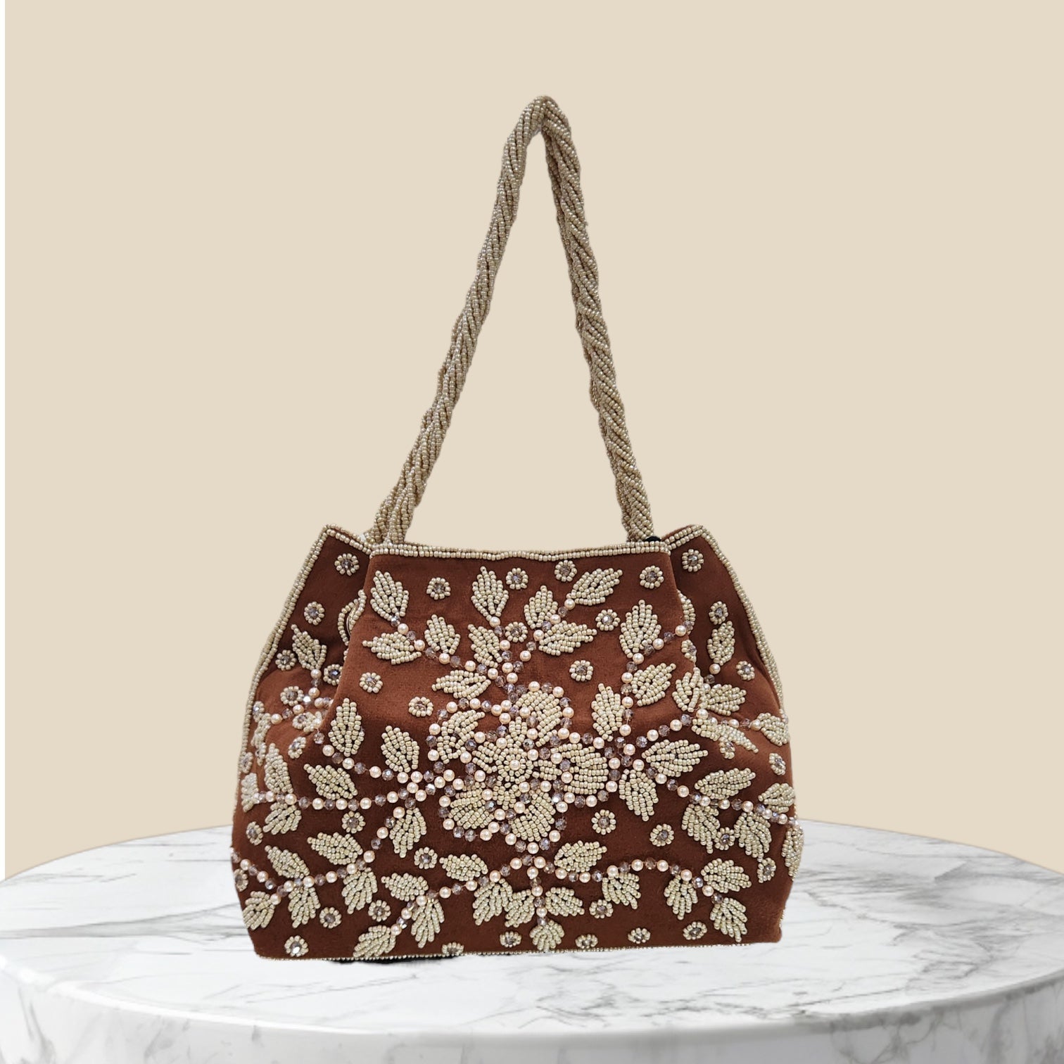 Elegant and timeless, the Kanaklata Potli is crafted on rich velvet and adorned with intricate seed bead and bugle bead embroidery on both sides, forming graceful floral and leaf patterns. The 3-magnet closure offers a sleek, seamless finish, while the handcrafted seed bead wrist handle adds a touch of delicate charm. A perfect blend of luxury and tradition, this potli is designed to elevate your look at weddings, festive occasions, and evening gatherings.