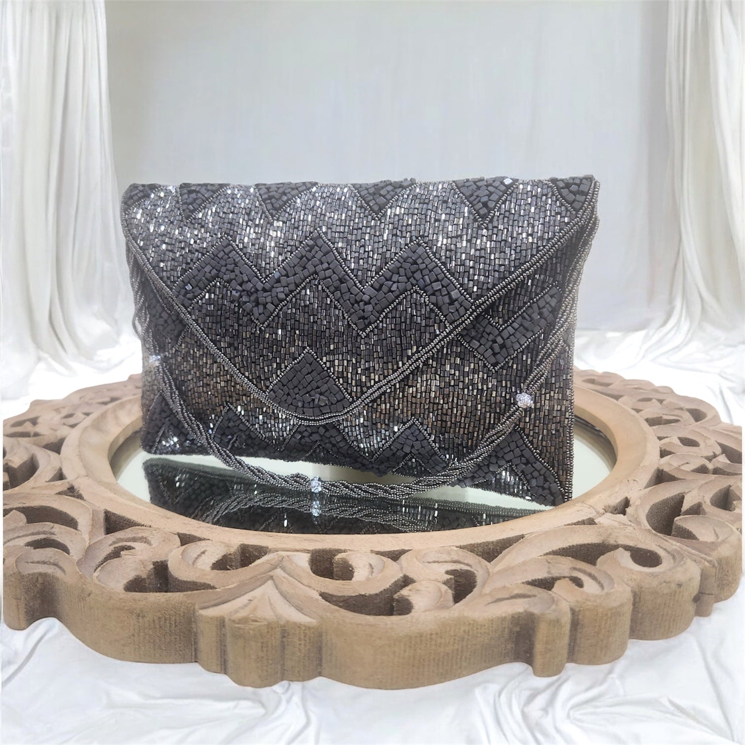 Turn heads with this elegant envelope clutch, featuring intricate kardana and square bead embroidery in a striking zigzag pattern on the front. The back is detailed with delicate seed bead embroidery, adding subtle charm. Thoughtfully designed, it includes an inner pocket for essentials and a hand-embroidered seed bead wrist handle for a graceful grip. It also comes with a sleek sling chain, offering the option of hands-free styling. Perfect for weddings, festive celebrations, and evening soirées.