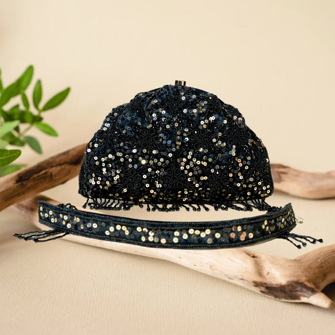 Experience luxury like never before with our Luxe Velvet Elegance Potli. Crafted from premium suede velvet, this metal frame potli boasts intricate hand embroidery adorned with bugle beads, sequins, and seed beads in a mesmerizing pattern. The base of the potli features elegant seed bead tassels with drop-shaped danglers, adding a touch of sophistication. The back showcases randomly embroidered sequins, while the short wrist belt handle is beautifully embellished with sequin embroidery and seed bead outlines & Seed bead & drop shape danglers for the enchanting look. Elevate your style with this opulent accessory that combines traditional craftsmanship with contemporary design.