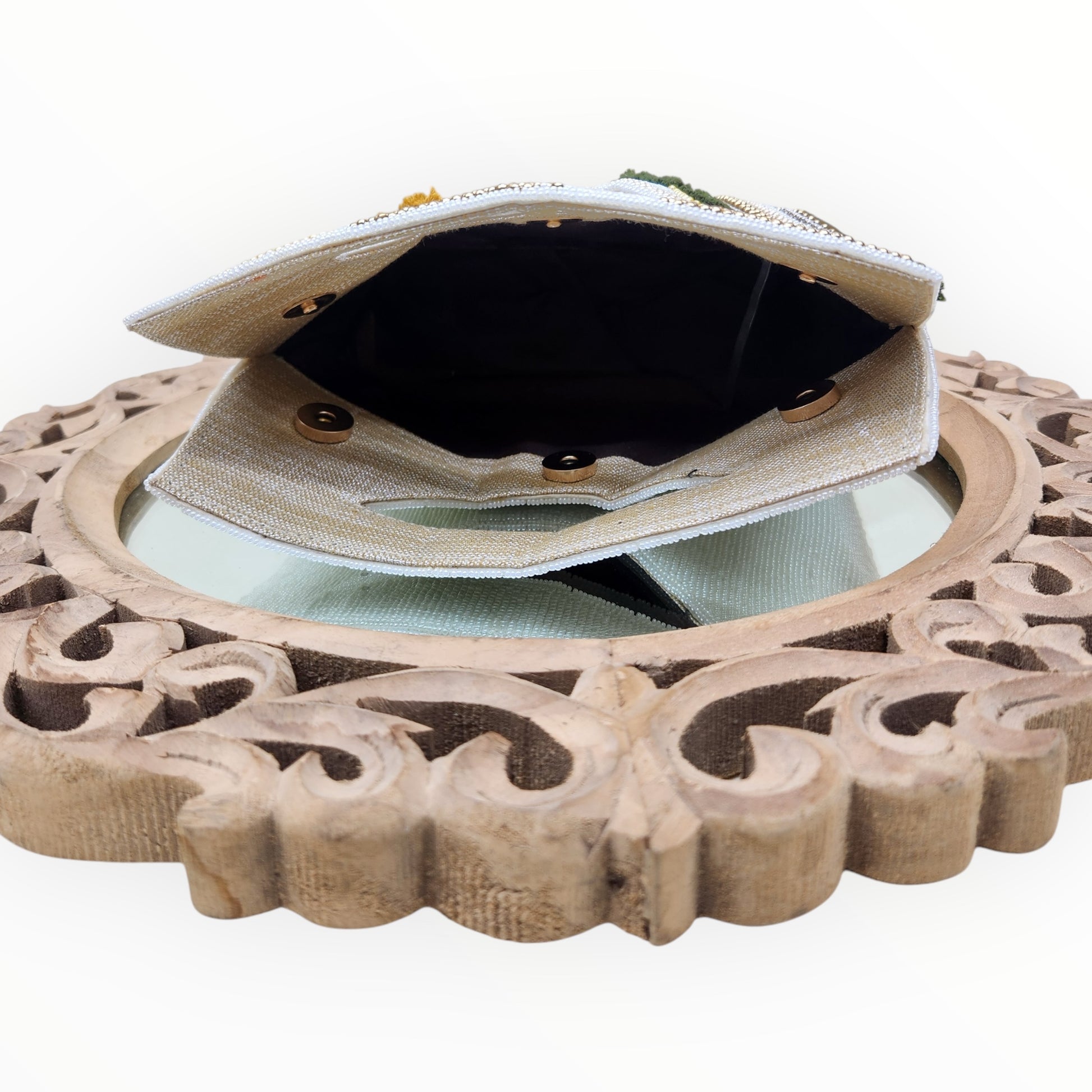 Turn heads with this true masterpiece of craftsmanship — a rectangular clutch that effortlessly blends tradition with modern flair. Drenched in a vibrant mosaic of multicolored embroidery, it’s adorned with delicate threadwork, shimmering seed beads, intricate kardana, and oversized sequins that catch the light with every move.Designed for today’s fashion-forward woman, this bag is as functional as it is fabulous. Its compact silhouette offers a surprisingly spacious interior, perfect for your evening essentials.